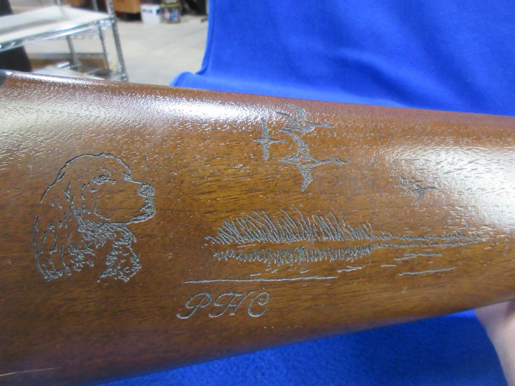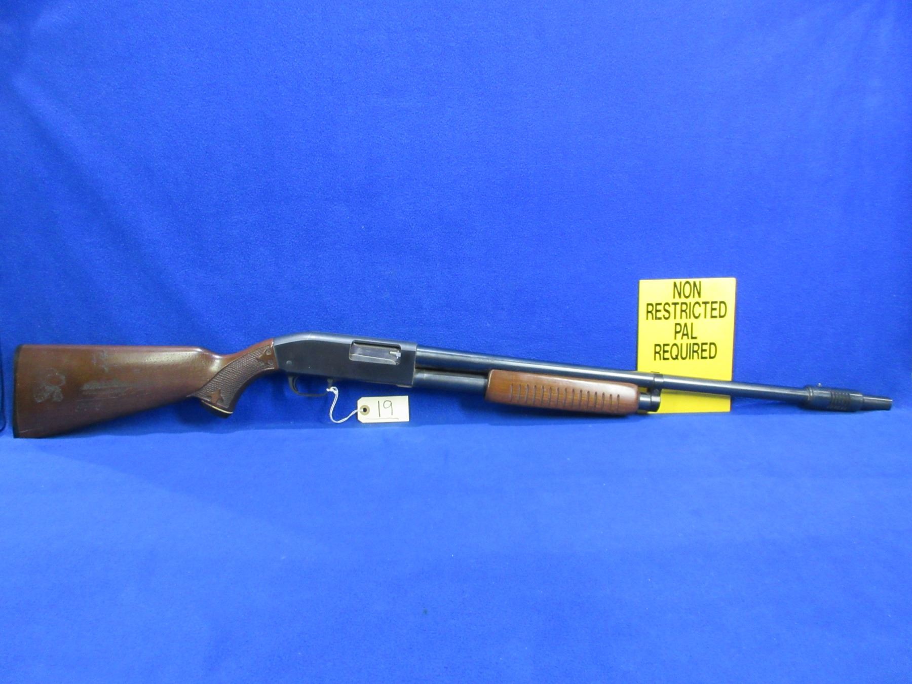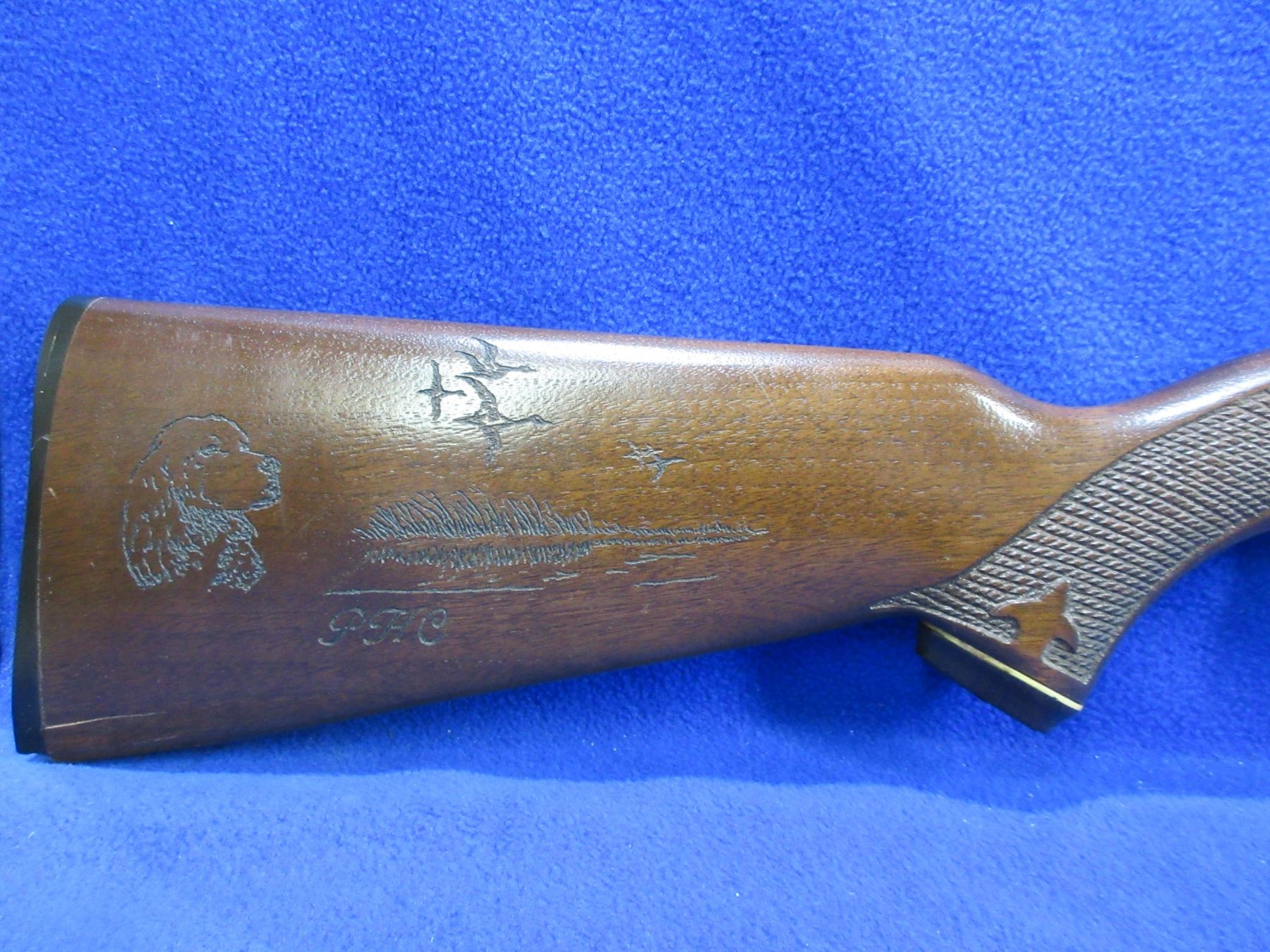 Non-Restricted - JC Higgins Model 20 in 12 Ga.2 3/4" - Marked Sears Roebusk & Co. , this is a pump action shotgun with tube magazine and JC Higgins choke, action appears to be in good to very good working order. Barrel is 23", bore is good, bluing is good, has bead front sight, stock has a chip and cracks on the toe and has been hand etched on the right side , forearm is good to very good, length of pull is 14 1/4", butt plate has chip on the toe. Ser # None