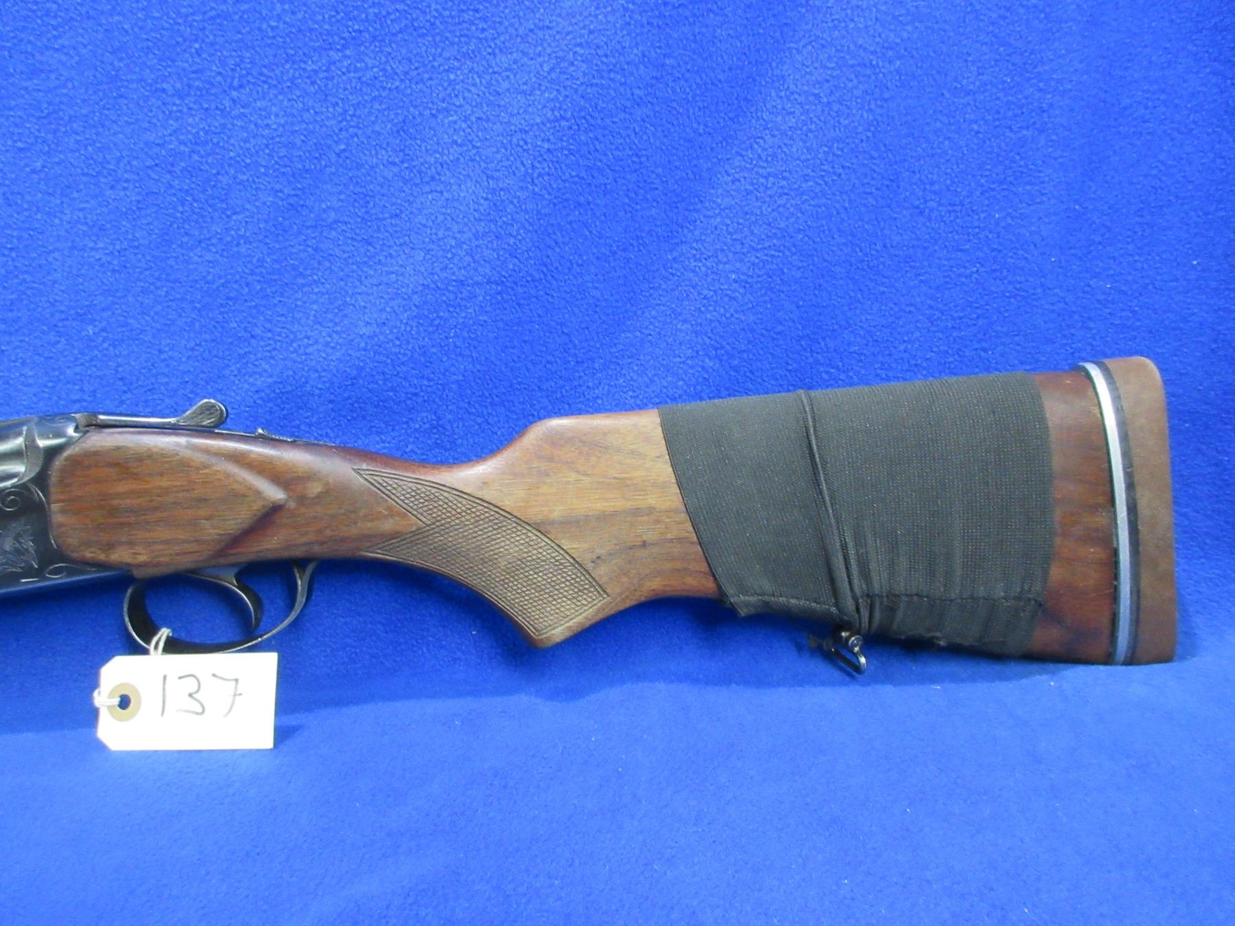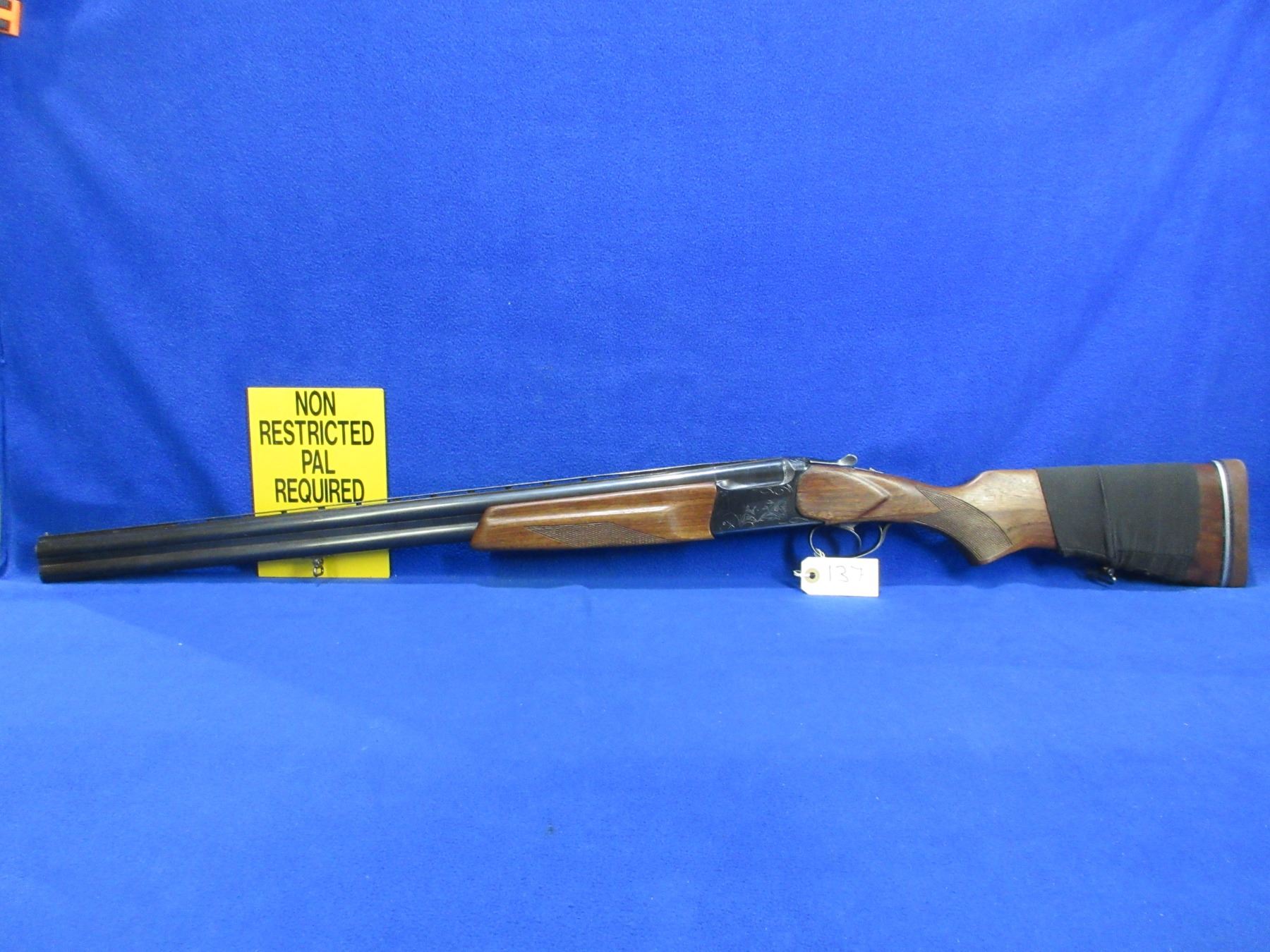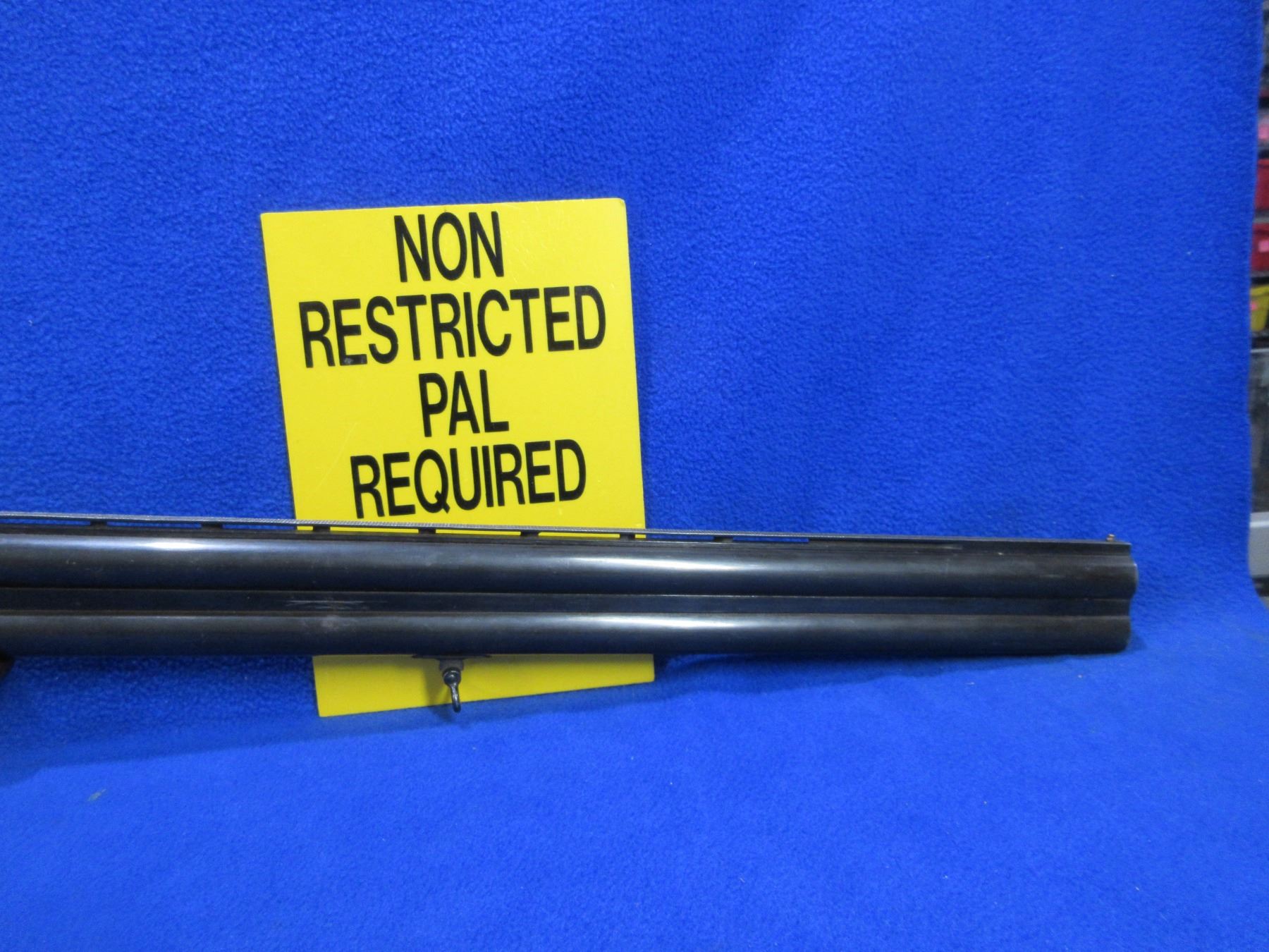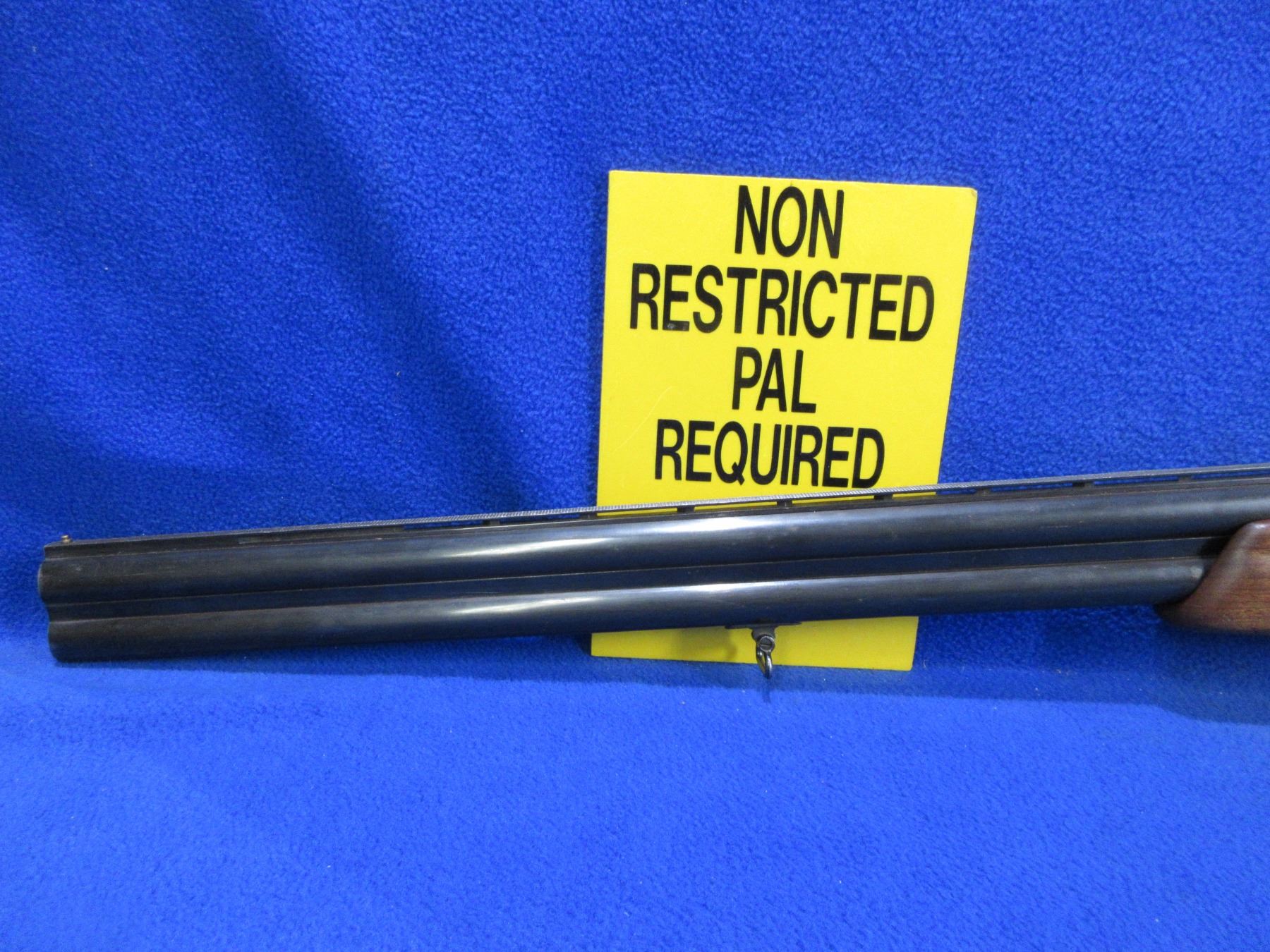 Non-Restricted - Baikal Model IJ-27 in 12 Ga. 2 3/4" - This is an over/under shotgun with chokes, action is tight and appears to be in good to very good working order. Vent rib barrels are 28 1/2", bores are good but bottom barrel has two minor dents approx 17" from muzzle, bluing is good, has bead front sight, stock is a bit loose and has a crack behind the upper tang, forearm is good, length of pull is 14 1/4", rubber recoil pad incorrectly fitted, comes with swivels and cartridge carrier. Ser # 9180595