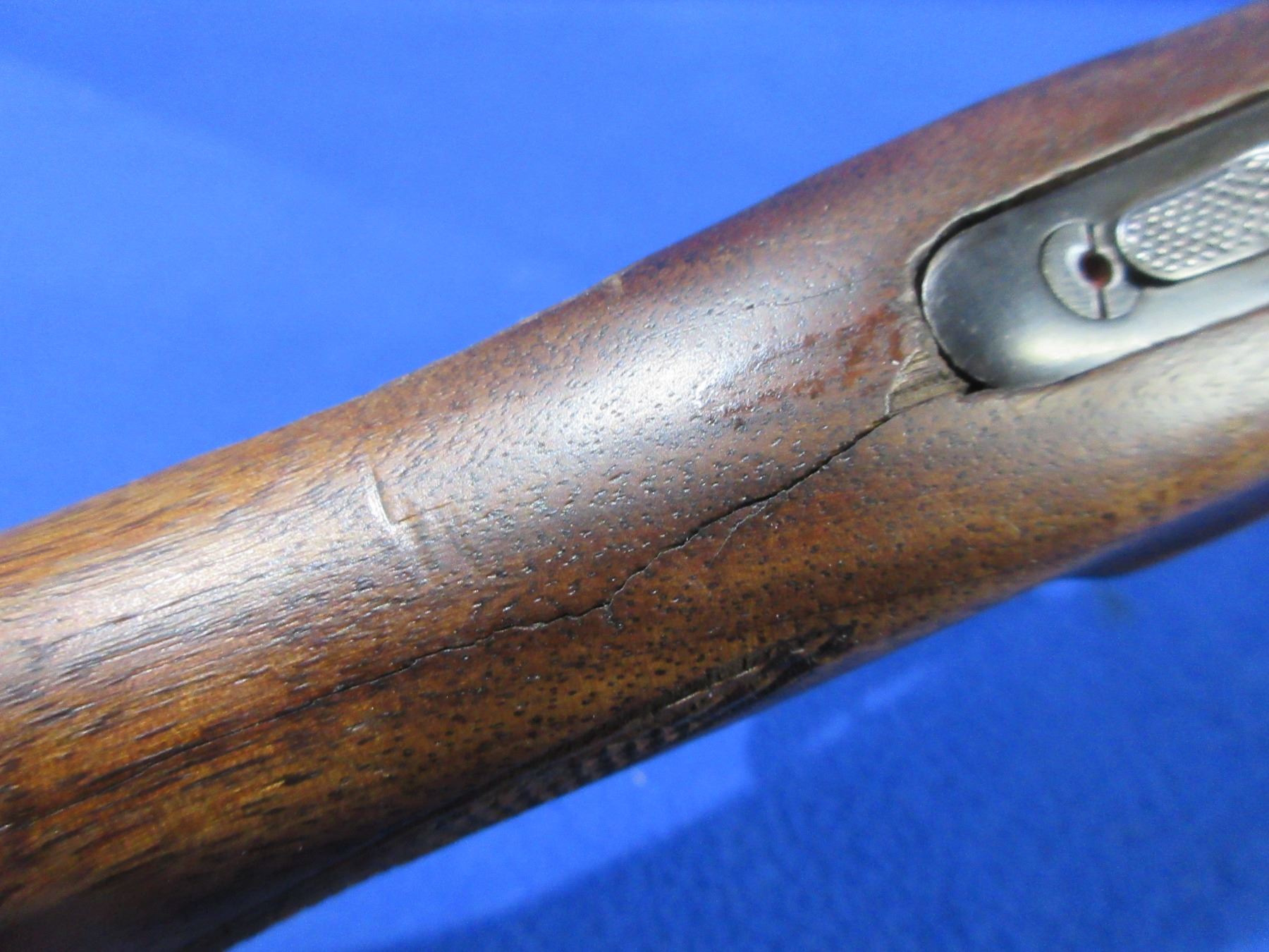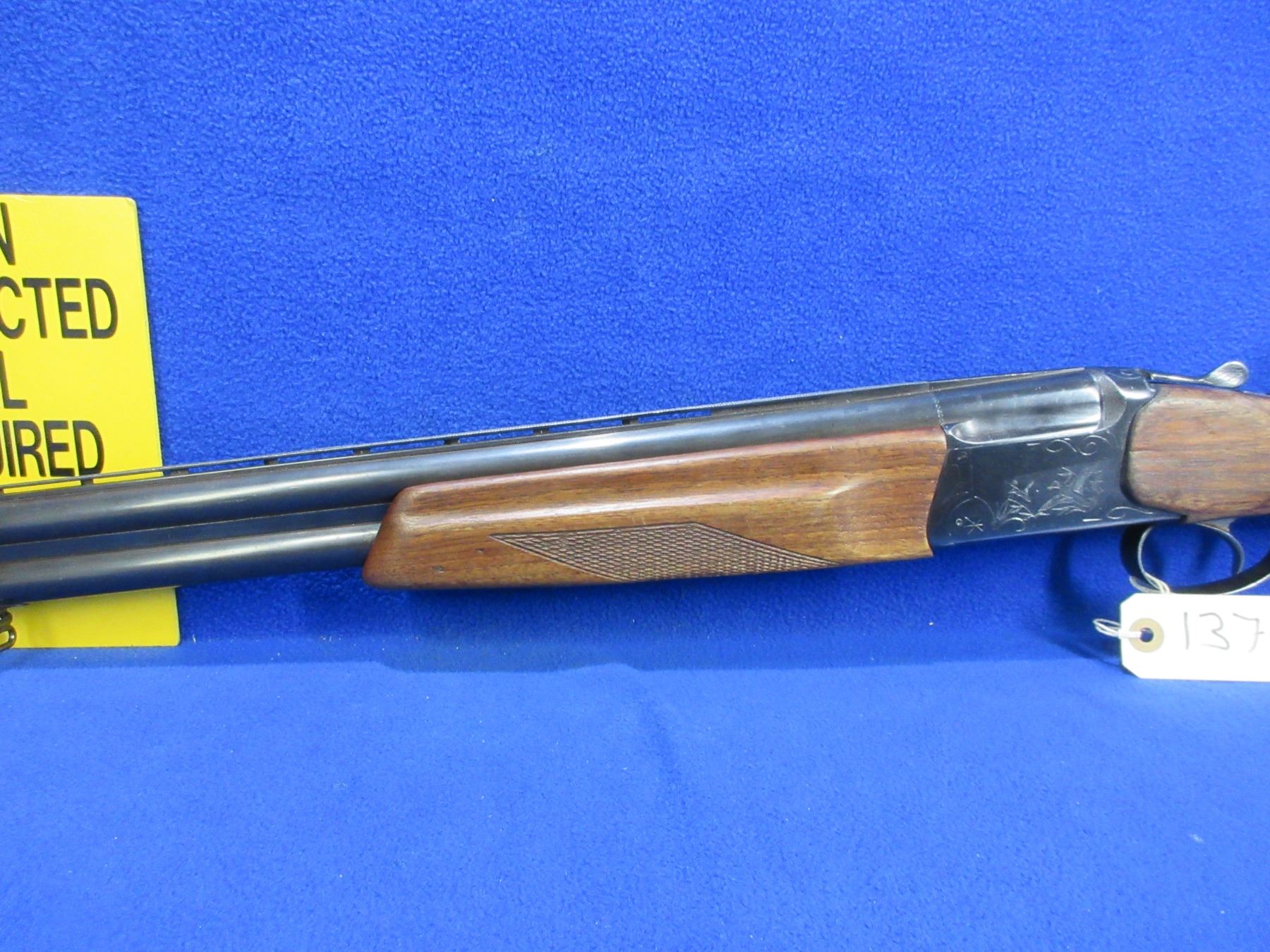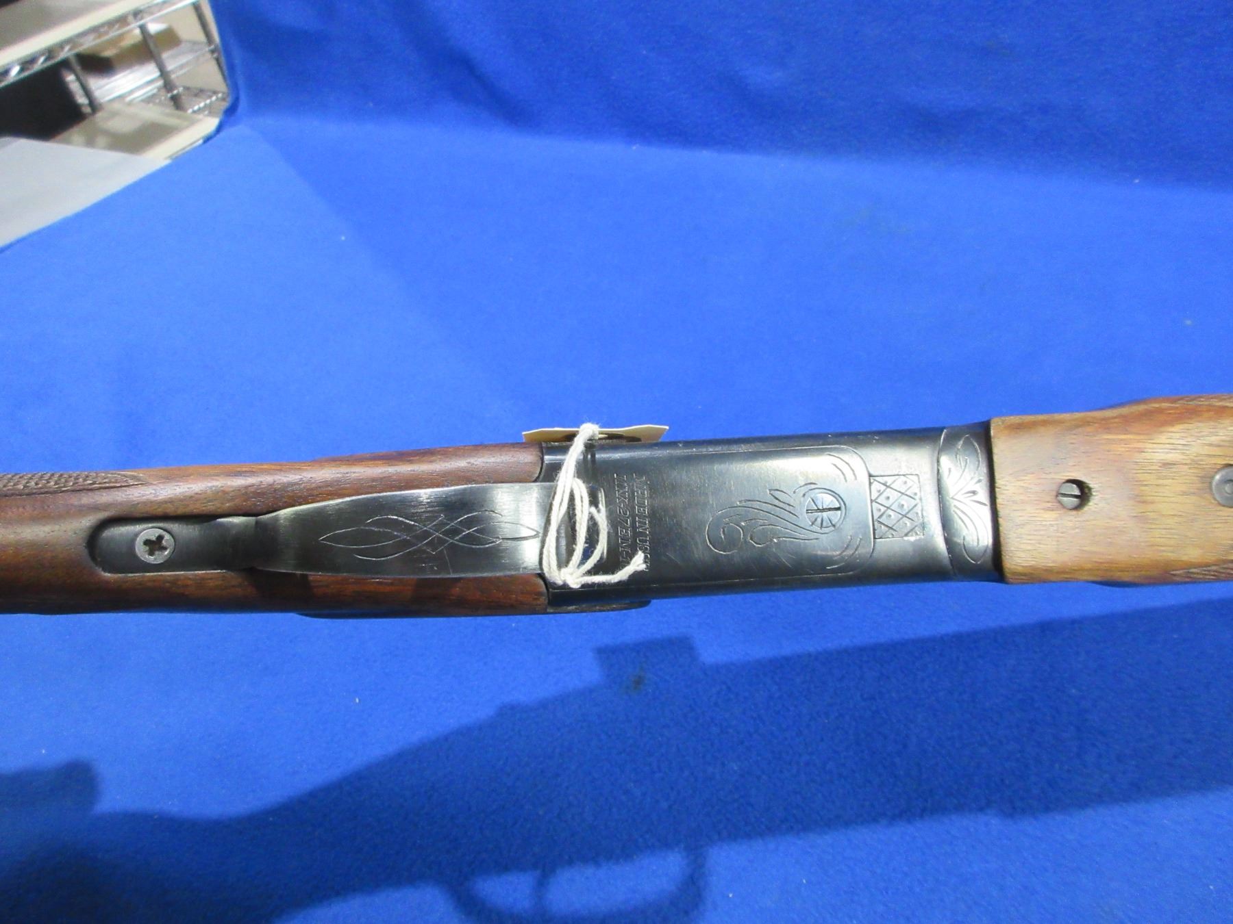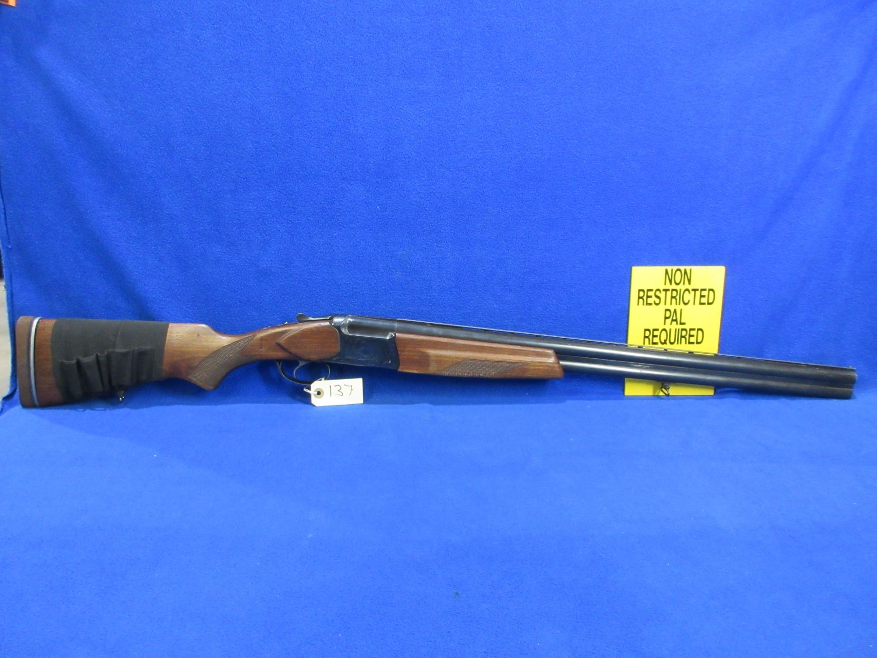 Non-Restricted - Baikal Model IJ-27 in 12 Ga. 2 3/4" - This is an over/under shotgun with chokes, action is tight and appears to be in good to very good working order. Vent rib barrels are 28 1/2", bores are good but bottom barrel has two minor dents approx 17" from muzzle, bluing is good, has bead front sight, stock is a bit loose and has a crack behind the upper tang, forearm is good, length of pull is 14 1/4", rubber recoil pad incorrectly fitted, comes with swivels and cartridge carrier. Ser # 9180595