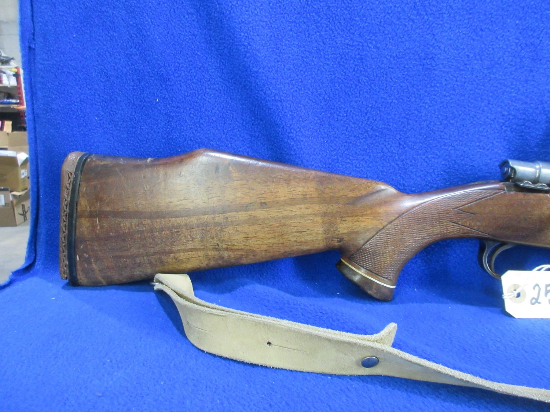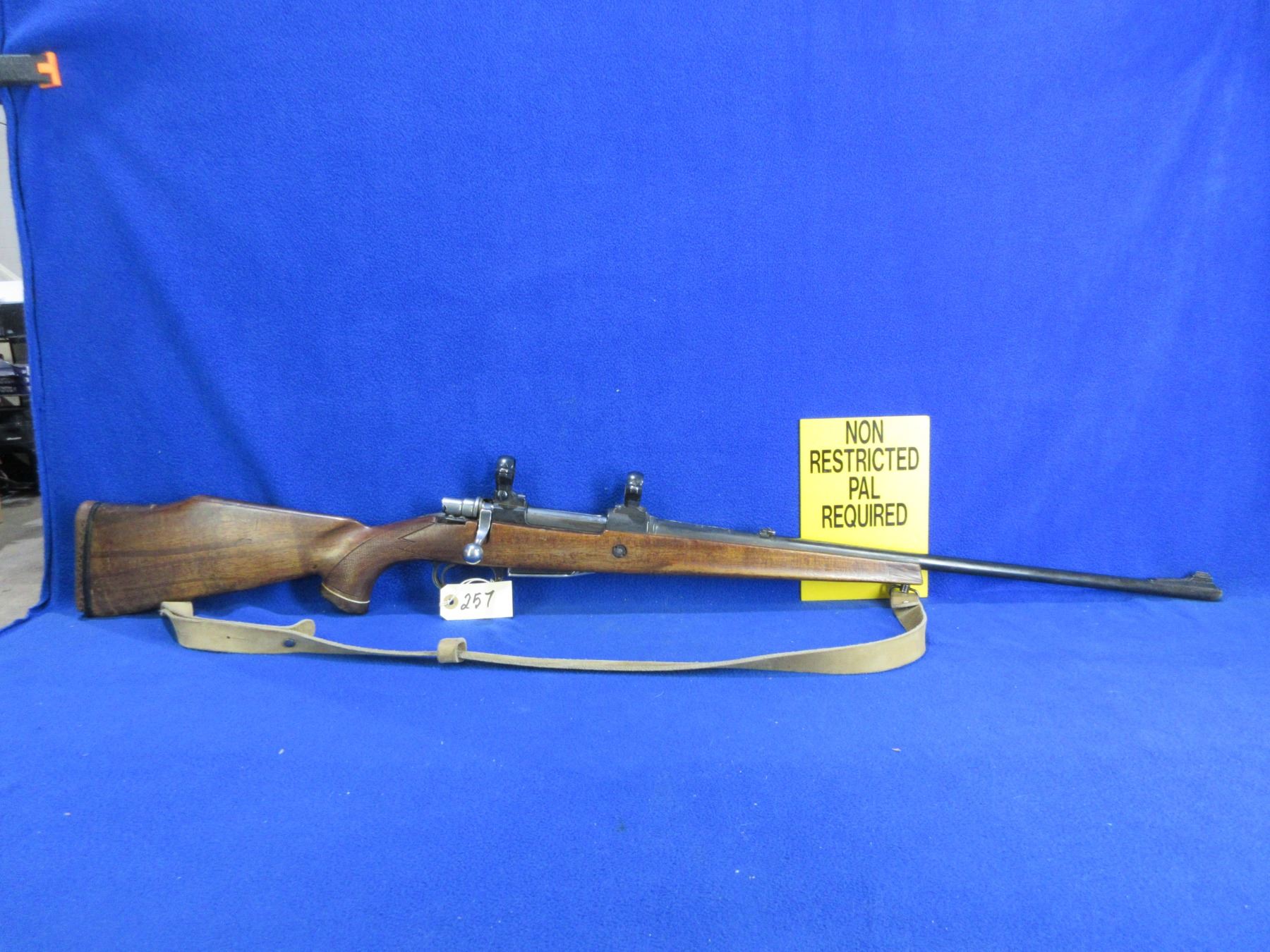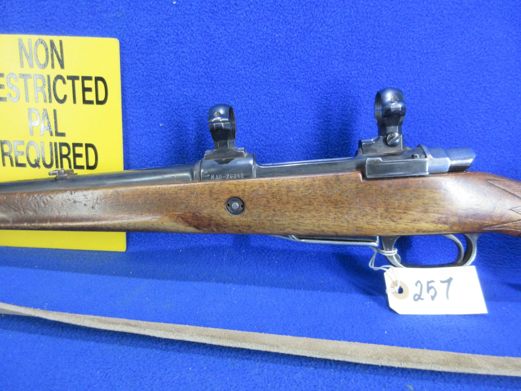 Non-Restricted - CIL Model 972-C in 7MM Rem. Mag - This is a bolt action rifle with removable magazine, action appears to be in good working order. Barrel is 23 1/2", rifling is good, bluing is good with some wear spots, has both sights and 1" rings with bases, stock has a hairline crack on top in the wrist area, length of pull is 14", rubber recoil pad poor, comes with swivels and a leather sling. Ser # MAG-26342