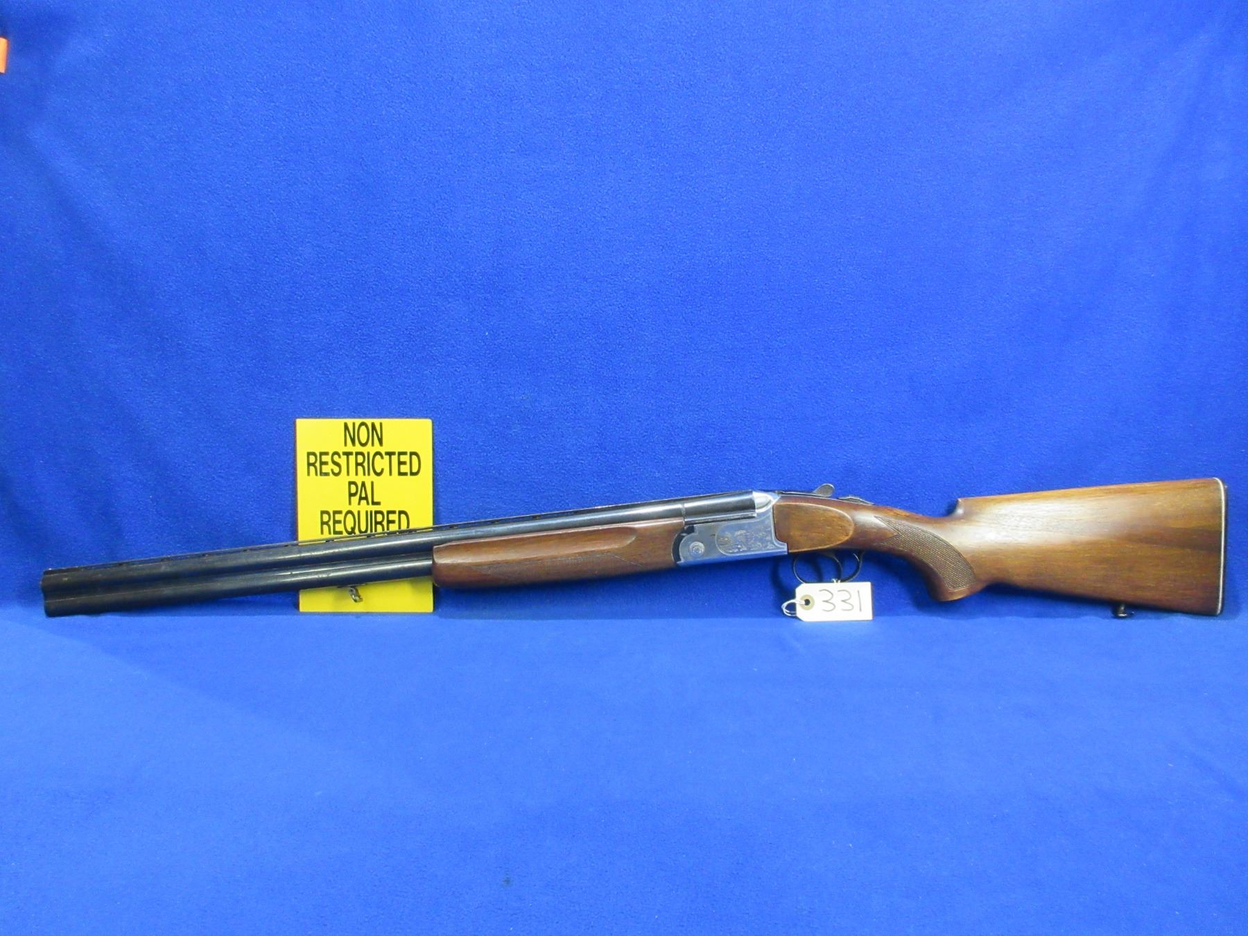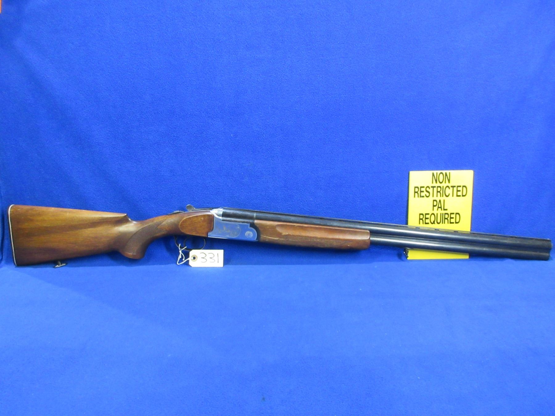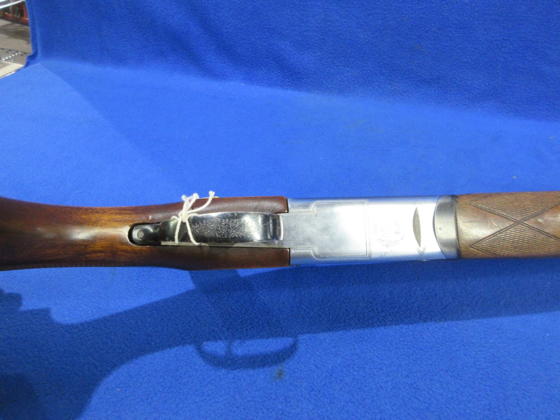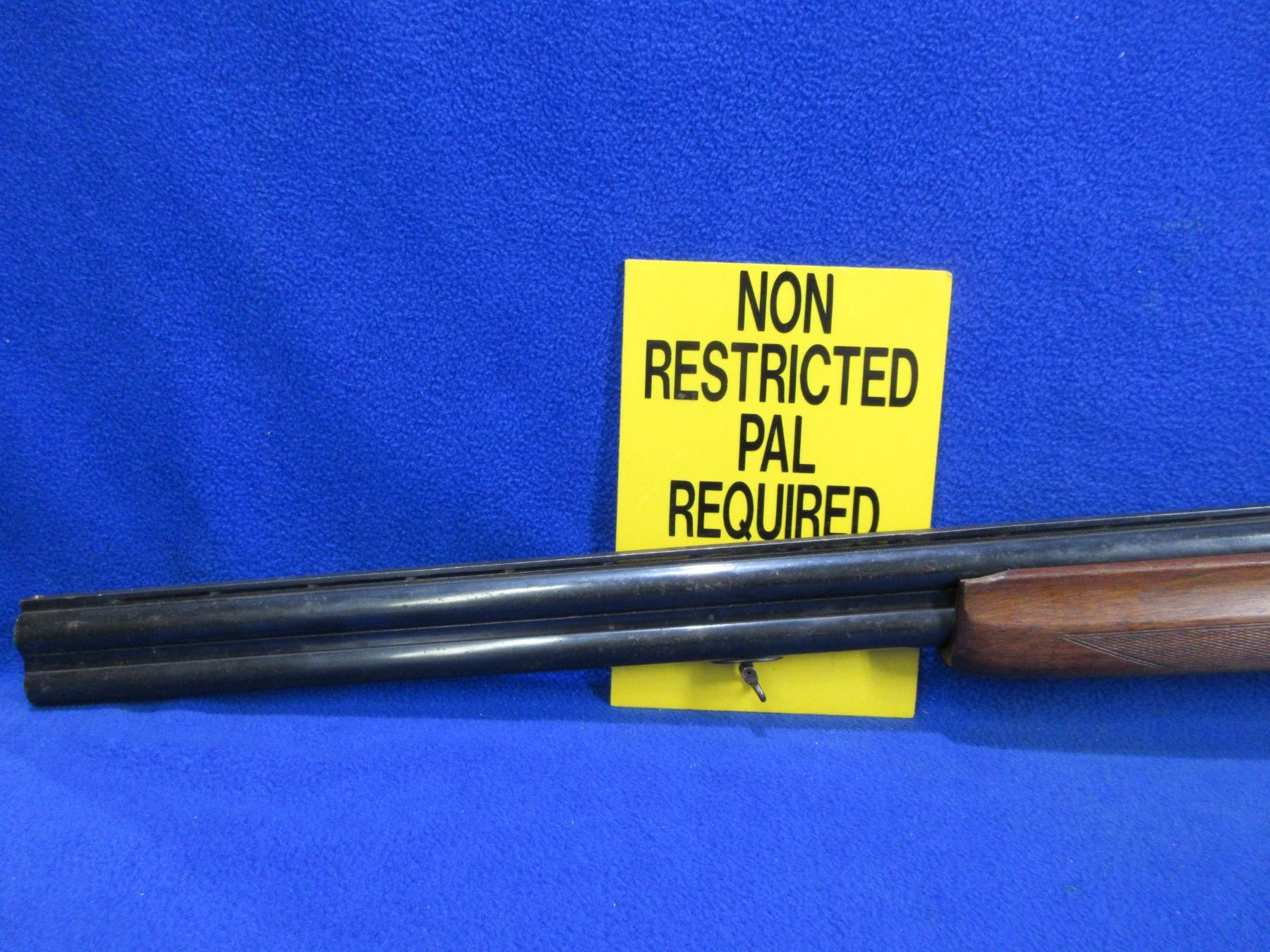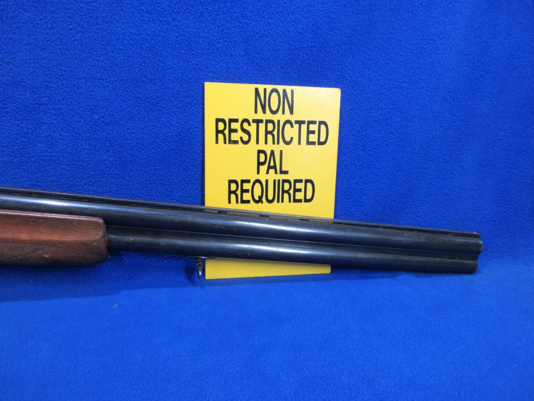 Non-Restricted - Husqvarna Model 300 in 12 Ga.2 3/4" - This is an over/under shotgun, action is tight and is in non working order as will not cock. Vent rib barrels are 26 3/4", bores are good but bottom barrel has a small dent approx 8" from muzzle, bluing is fair to good with light pitting, has bead front sight, stock is good with usage marks, forearm is good with many usage marks and a small chip on left side at top, length of pull is 14", butt plate good, comes with swivels. Ser # 82619