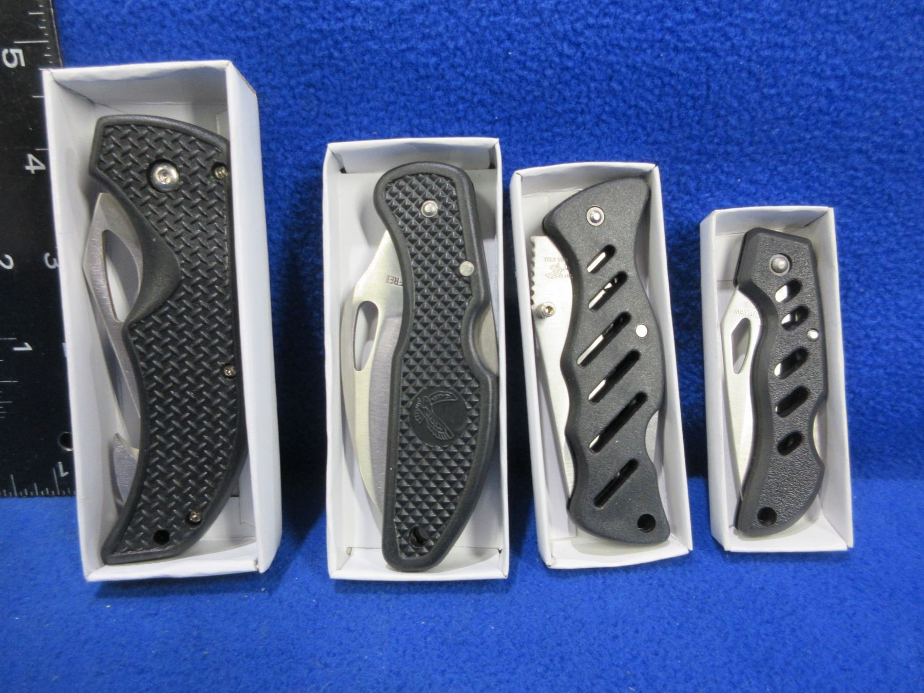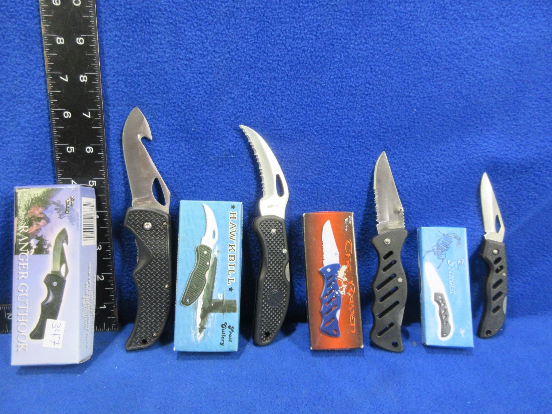 4 Folding Lock Blade Knives - Frost Cutlery - Appear Unused - Ranger Guthook, Hawkbill Serrated, The Raven, The Stinger