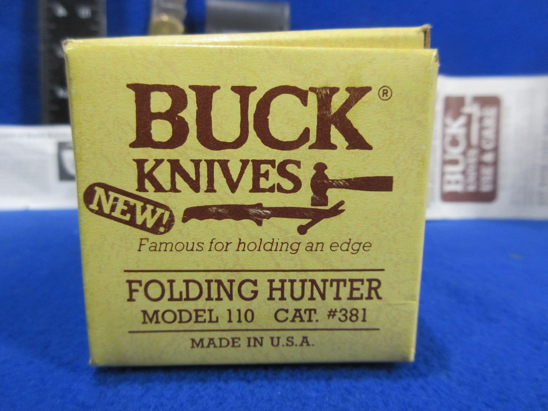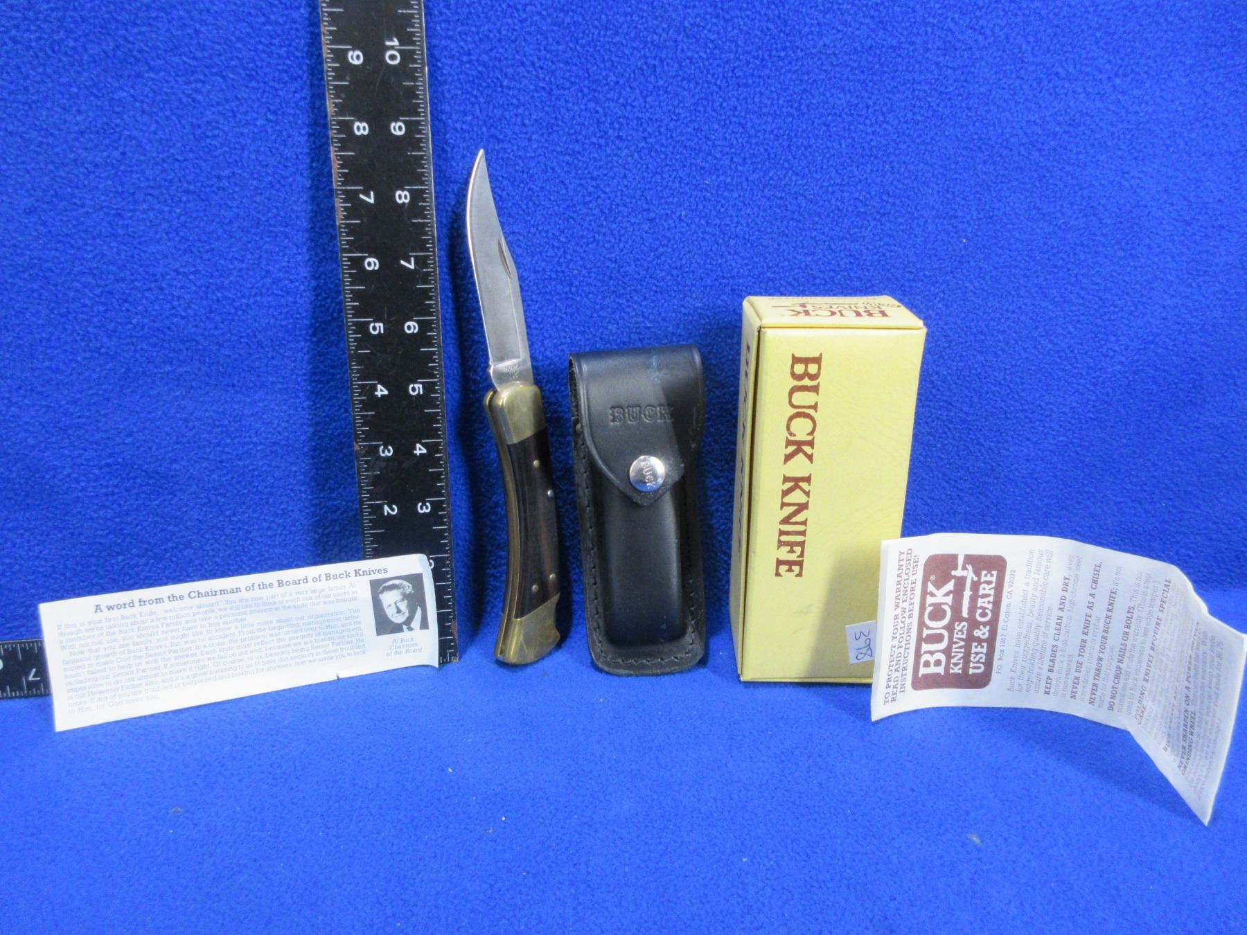 Buck Model 110 Folding Lock Blade Knife with Leather Sheath - 3 1/2" Blade, 8 1/2" Total Length - Appears Unused - Comes with original box and papers