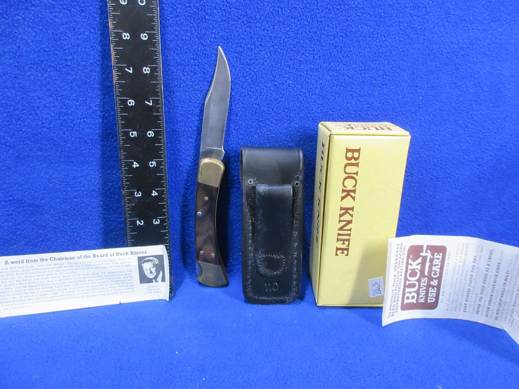 Lot 398 Buck Model 110 Folding Lock Blade Knife with Leather Sheath