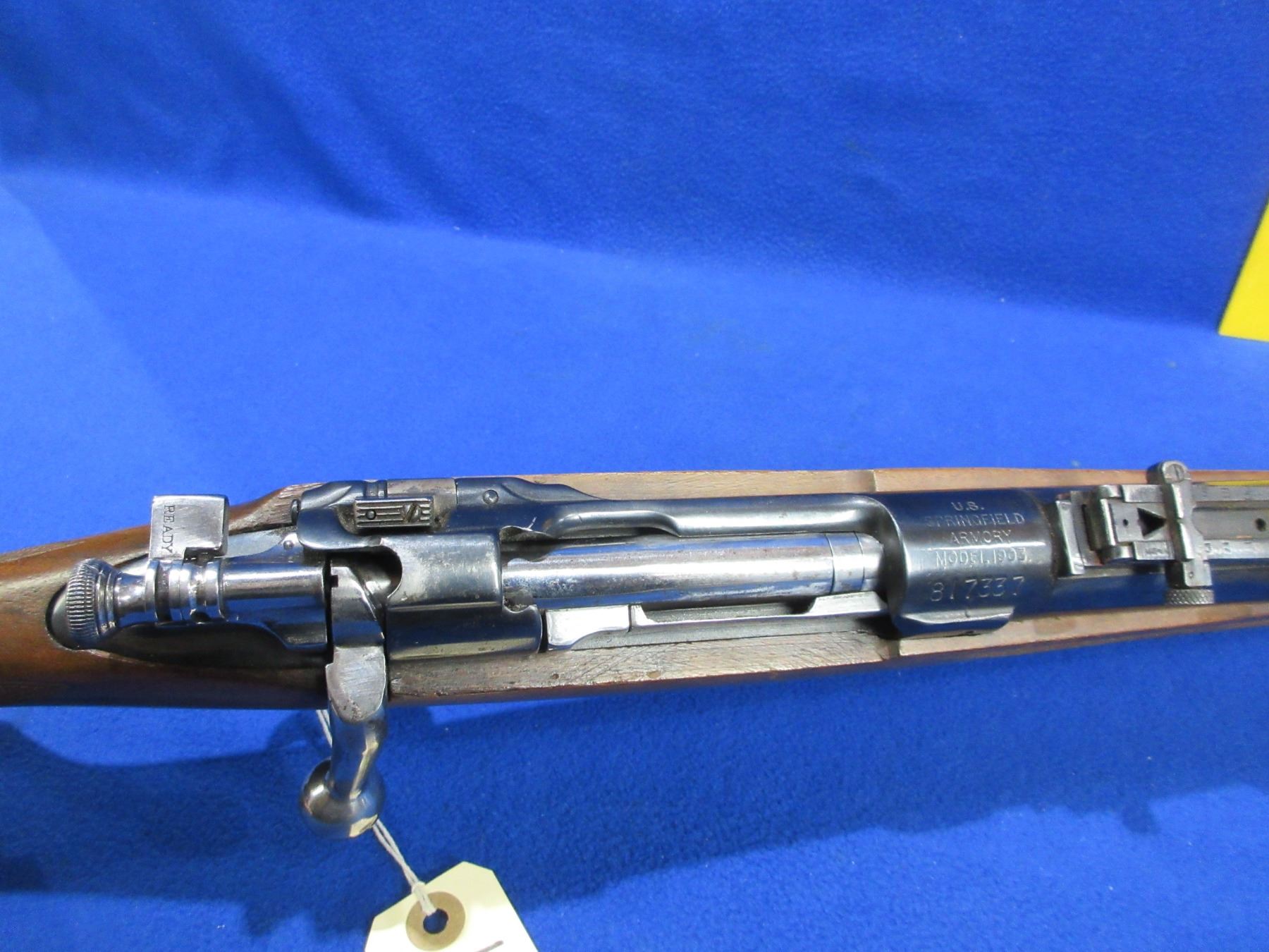 Non-Restricted - Springfield Model 1903 in 303 British - This is a bolt action rifle with floorplate magazine, action appears to be in good to very good working order. Barrel is 24", rifling is poor to fair, bluing is good with some wear spots, has both sights, stock is good with many usage marks, length of pull is 14", butt plate good. Ser # 817337