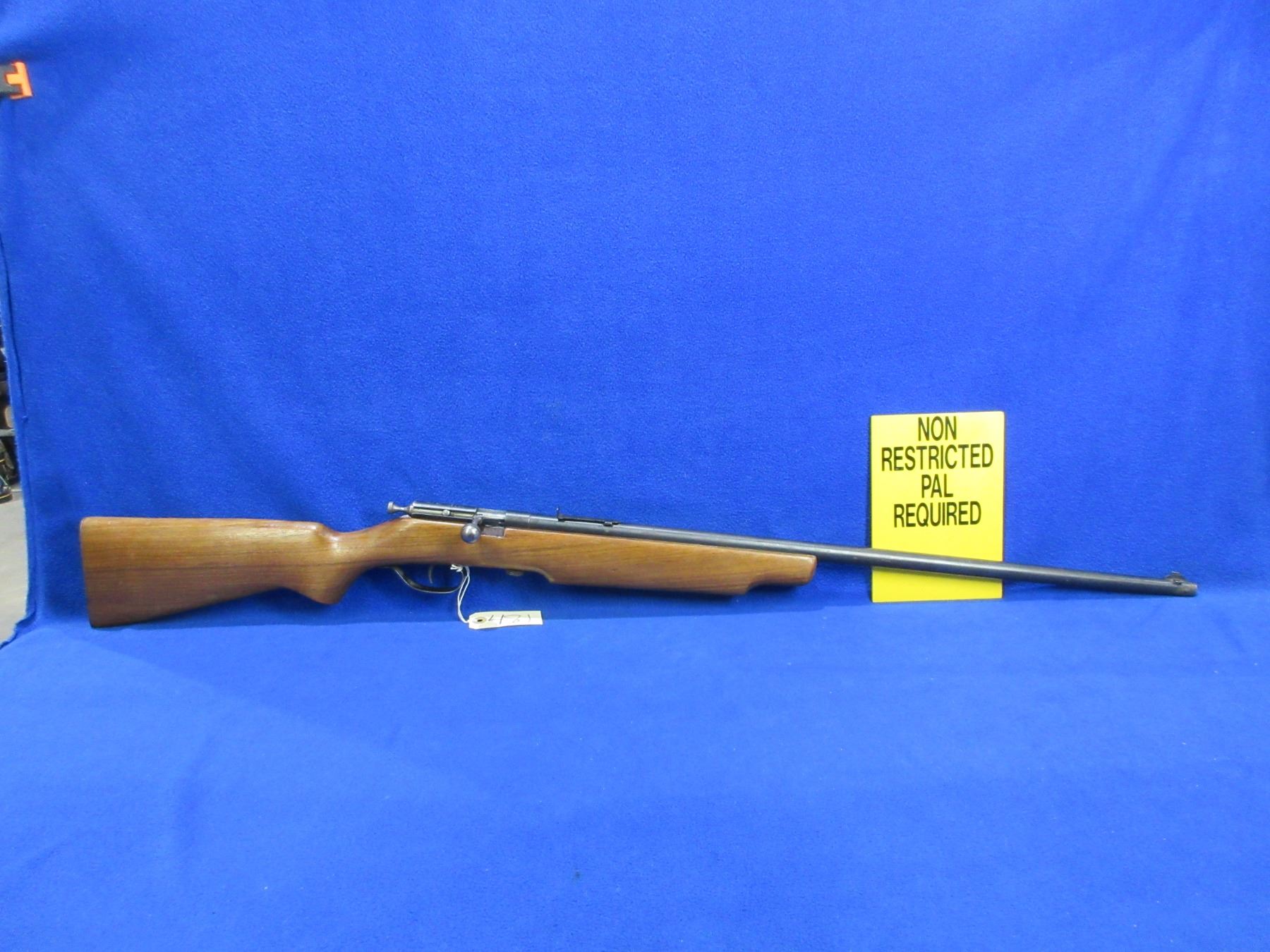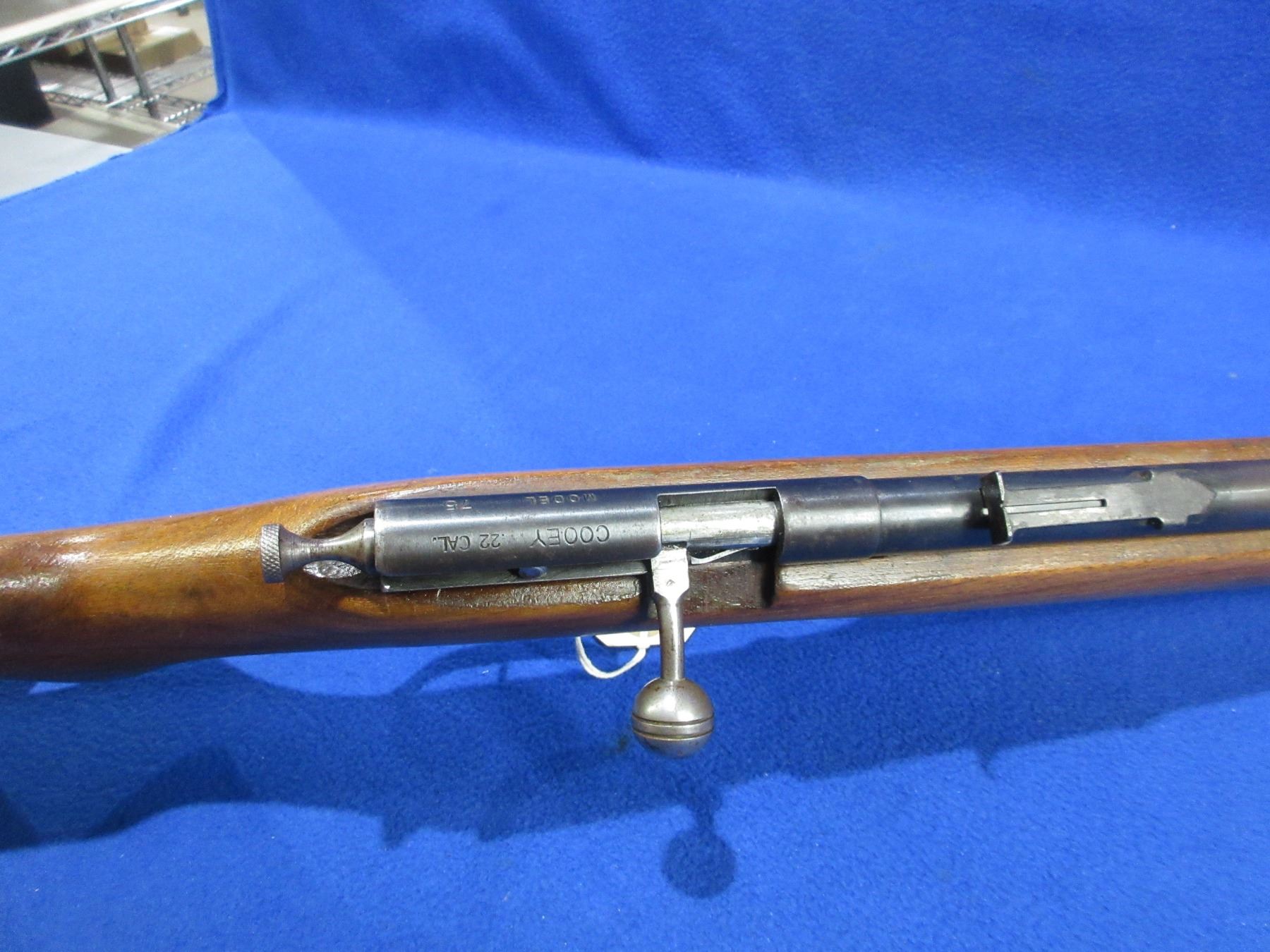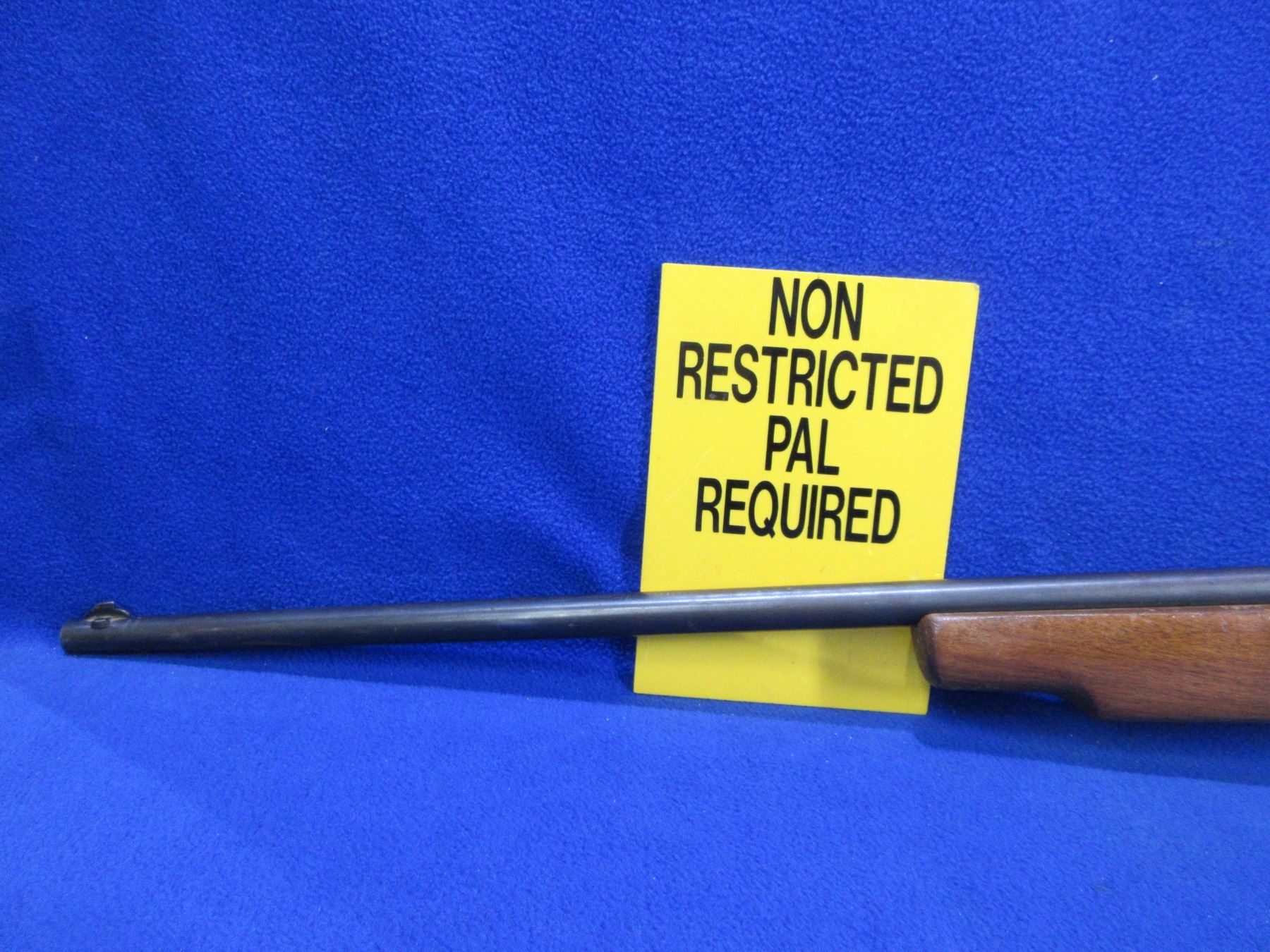 Non-Restricted - Cooey Model 75 in 22 Cal.- This is a single shot bolt action rifle, action appears to be in good working order. Barrel is 27", rifling is good to very good, bluing is turning grey with some light pitting, has both sights but missing ramp from rear sight, stock is good with usage marks and has been refinished, length of pull is 13 1/4", metal butt plate, swivel studs missing. Ser # None