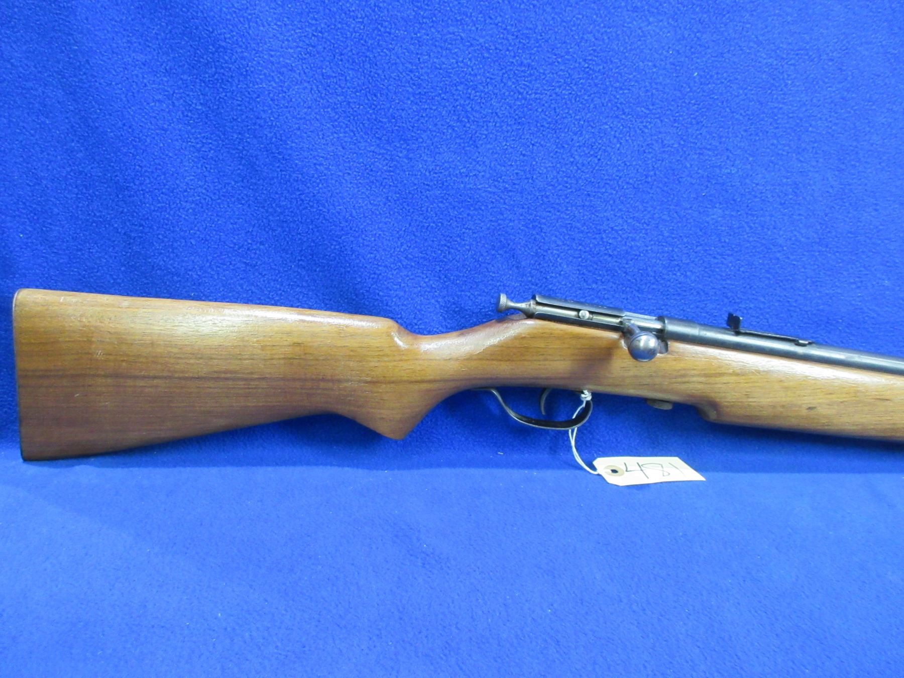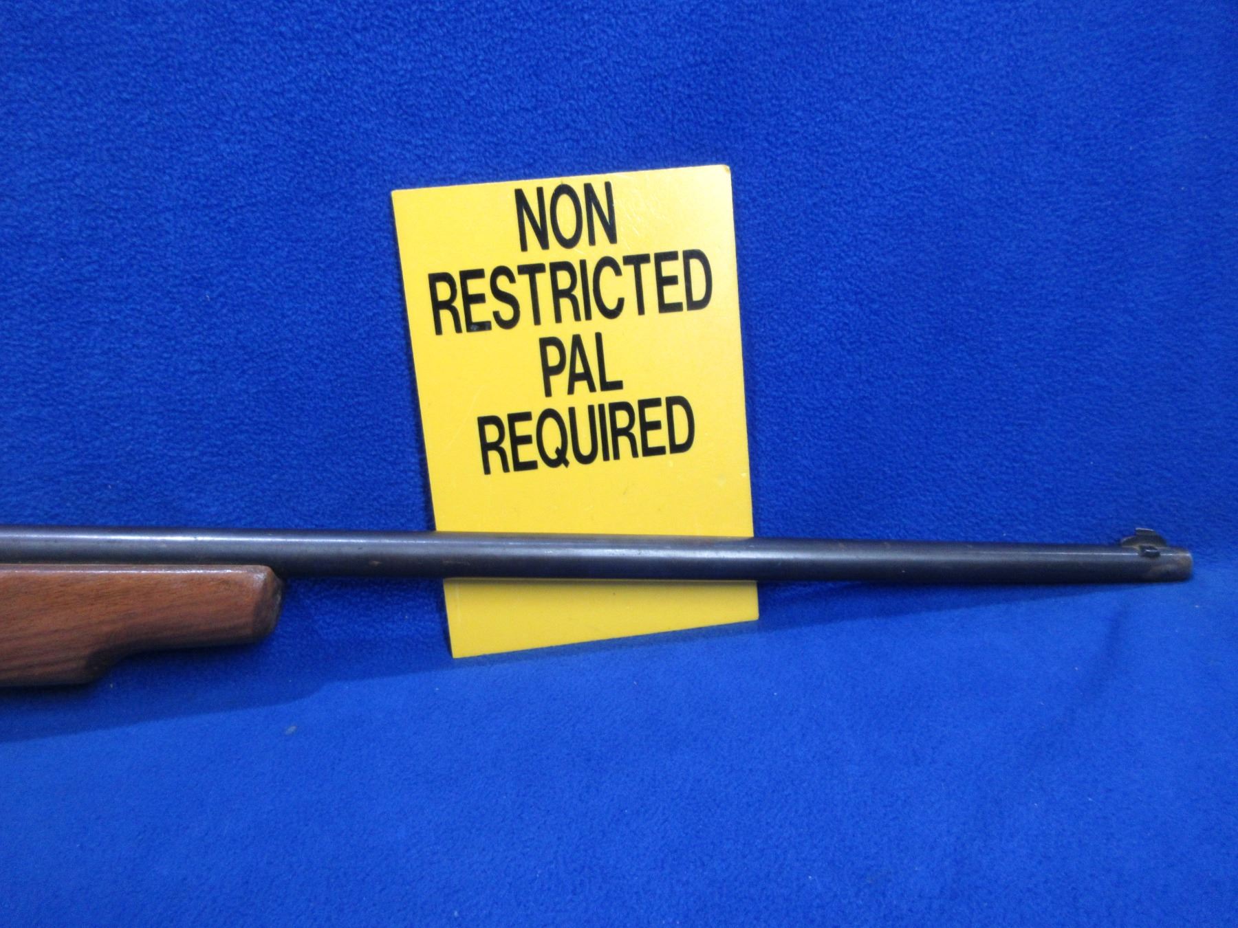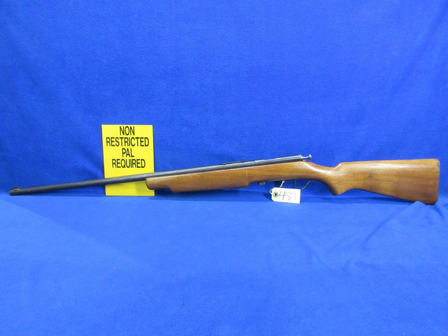 Non-Restricted - Cooey Model 75 in 22 Cal.- This is a single shot bolt action rifle, action appears to be in good working order. Barrel is 27", rifling is good to very good, bluing is turning grey with some light pitting, has both sights but missing ramp from rear sight, stock is good with usage marks and has been refinished, length of pull is 13 1/4", metal butt plate, swivel studs missing. Ser # None