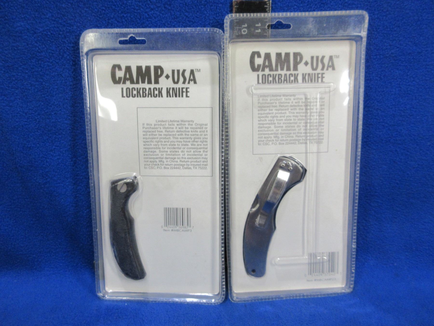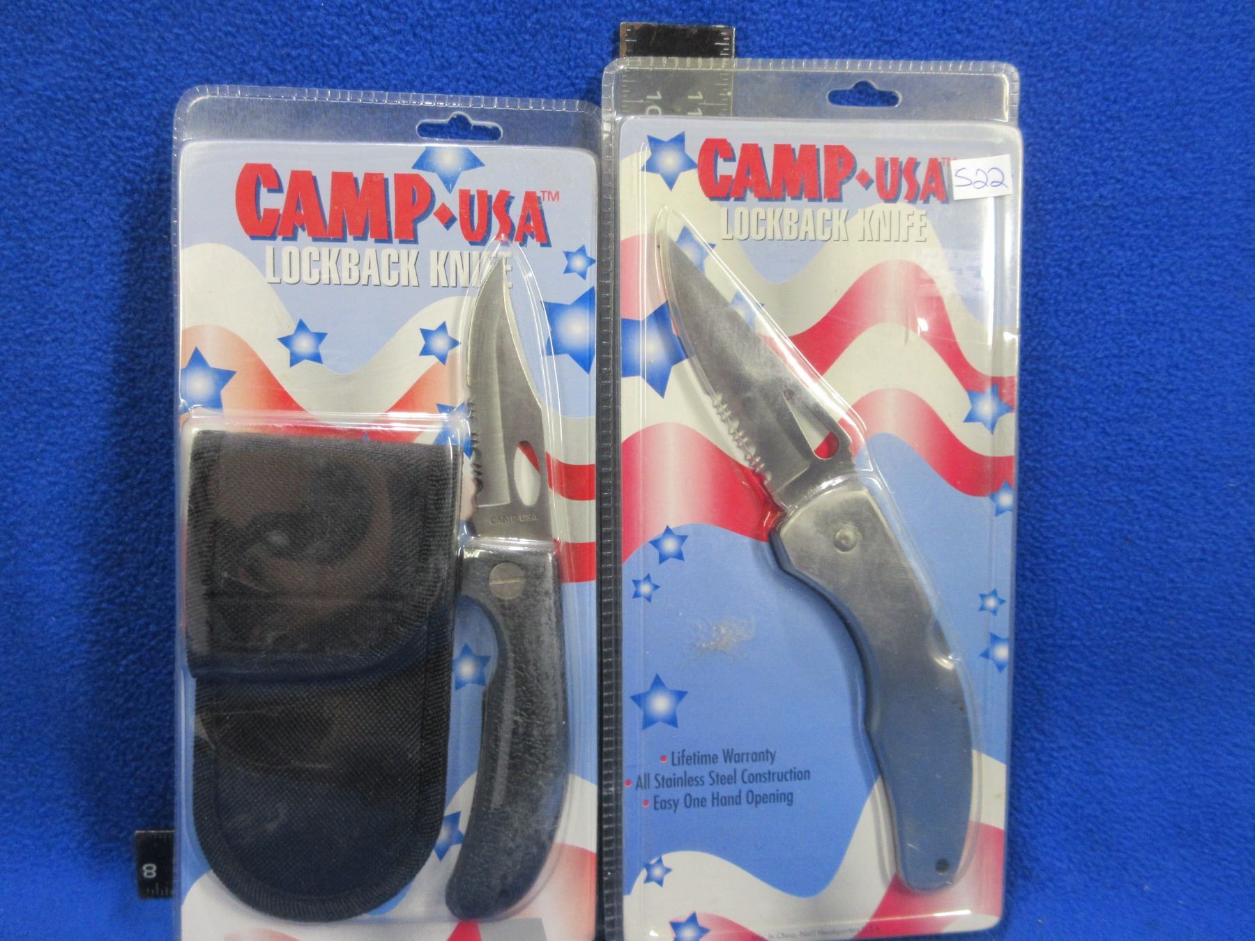 2 Camp USA Lockback Partially Serrated Blade Knives - 1 with Sheath, 1 Belt Clip - New Old Stock