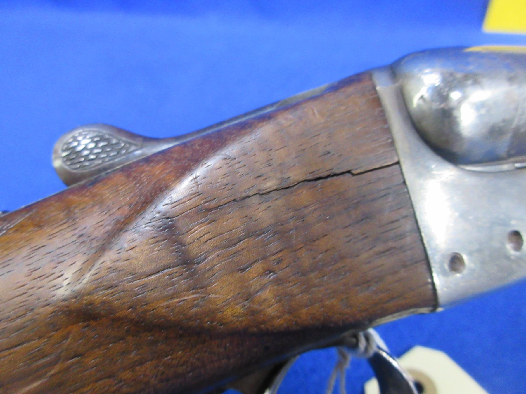 Non-Restricted - Belgian SXS in 16 Ga 2 1/2" - This is a tip up SXS shotgun, action is tight and appears to be in good working order. Barrels are 29 3/8", bores are good, bluing is turning grey, has bead front sight, stock has a crack on the right side behind the action, forearm is good with usage marks, length of pull is 14", metal butt plate good, comes with rear swivl, front swivel missing. Ser # 36293