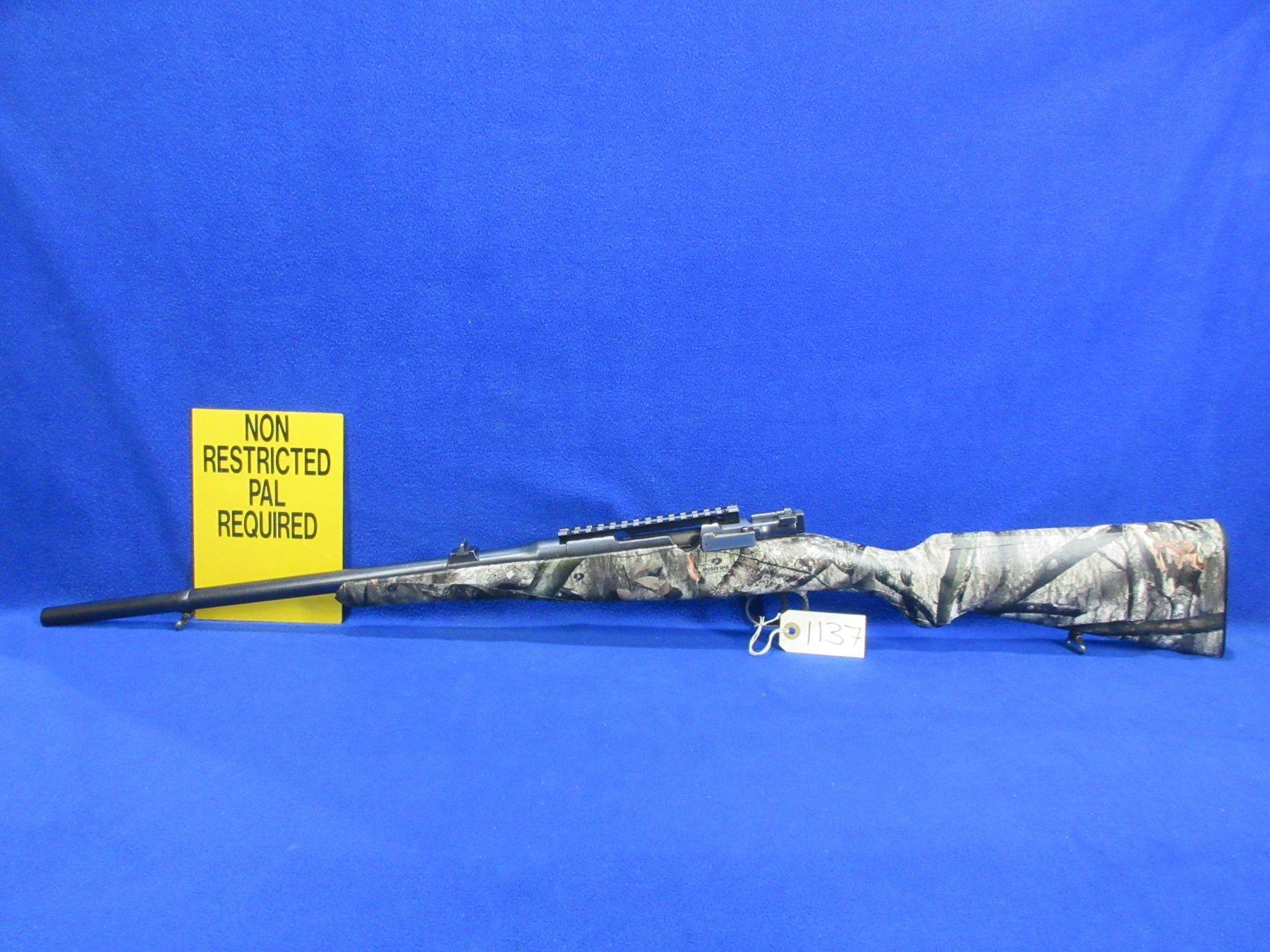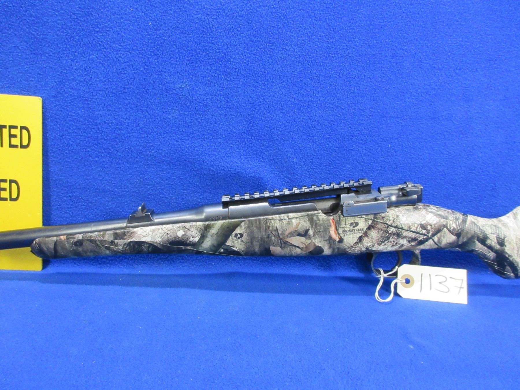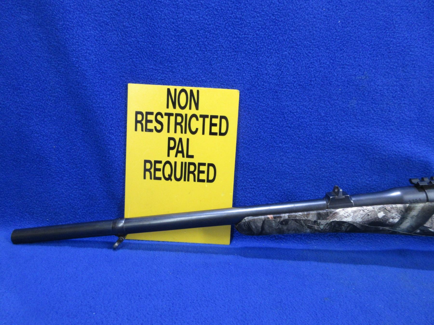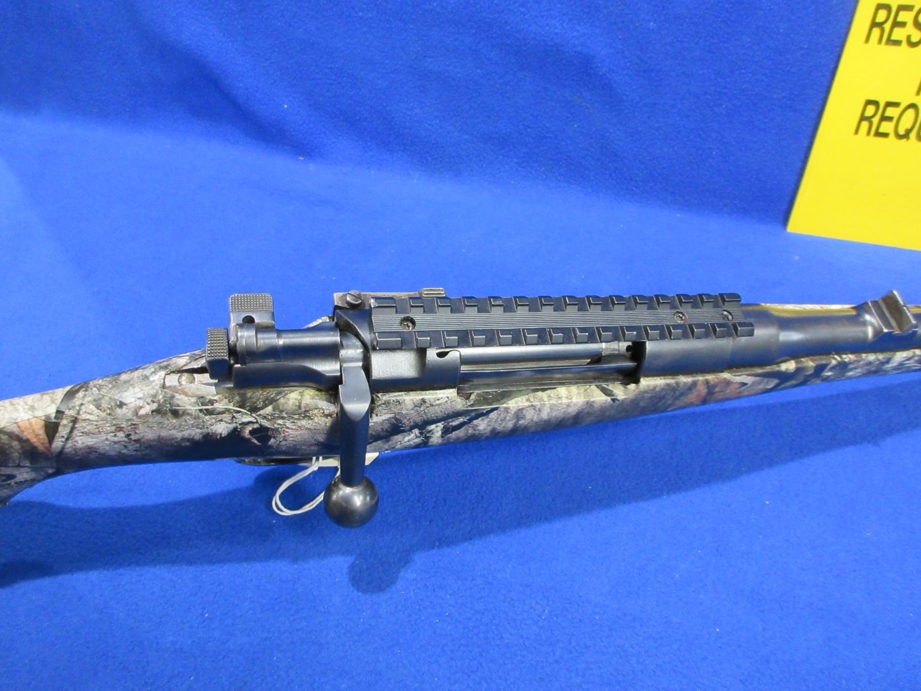 Non-Restricted - Husqvarna Model 46 in 9.3x57 - This is a bolt action rifle with floorplate magazine, action appears to be in good to very good working order. Barrel is 19" and has been shortened, rifling is good, bluing is good, has rear sight, front sight missing but has picatinny rail, Mossy Oak Treestand camo wrapped stock is good, length of pull is 14 1/2", butt plate good, comes with swivels. Ser # 4706