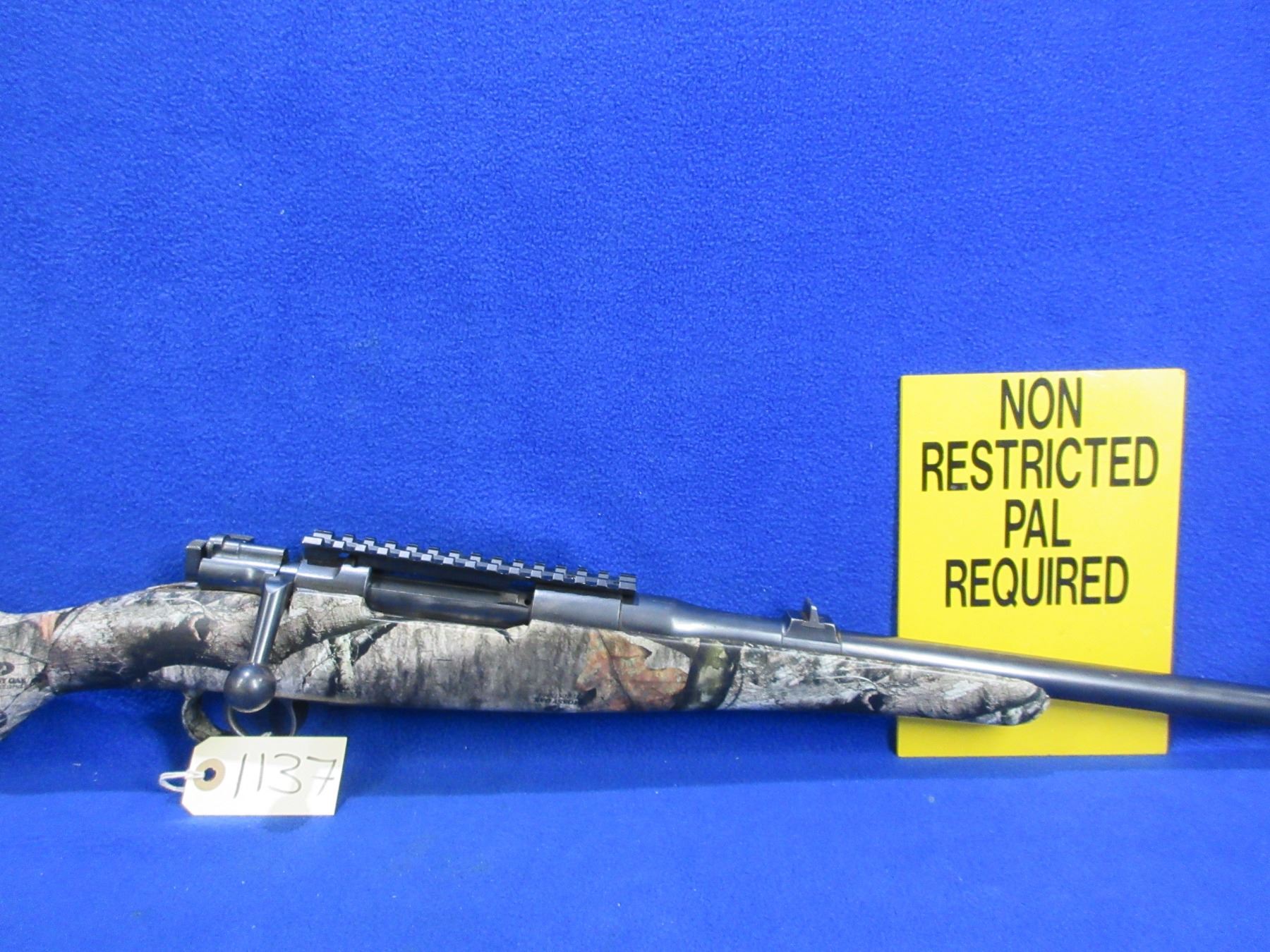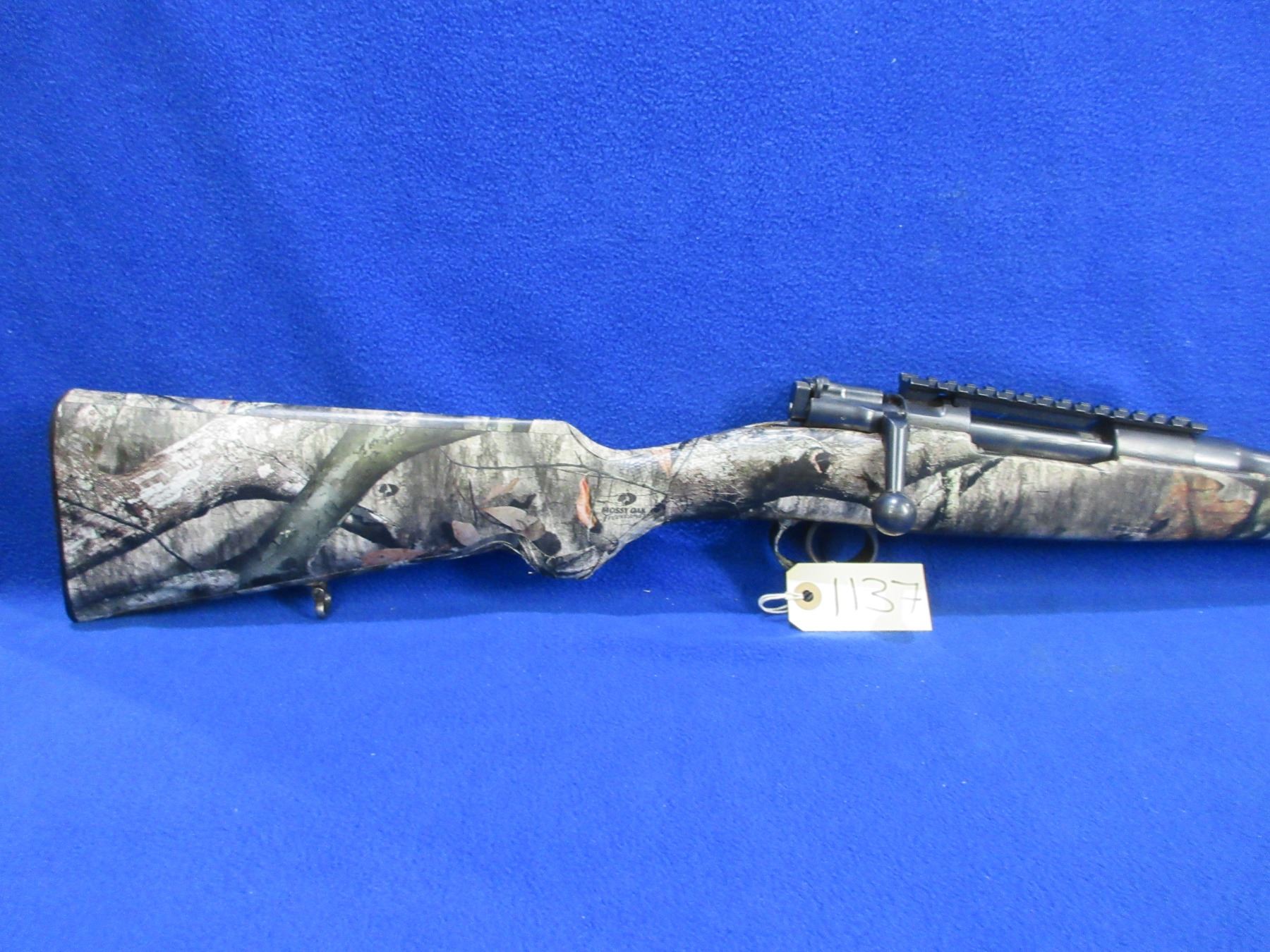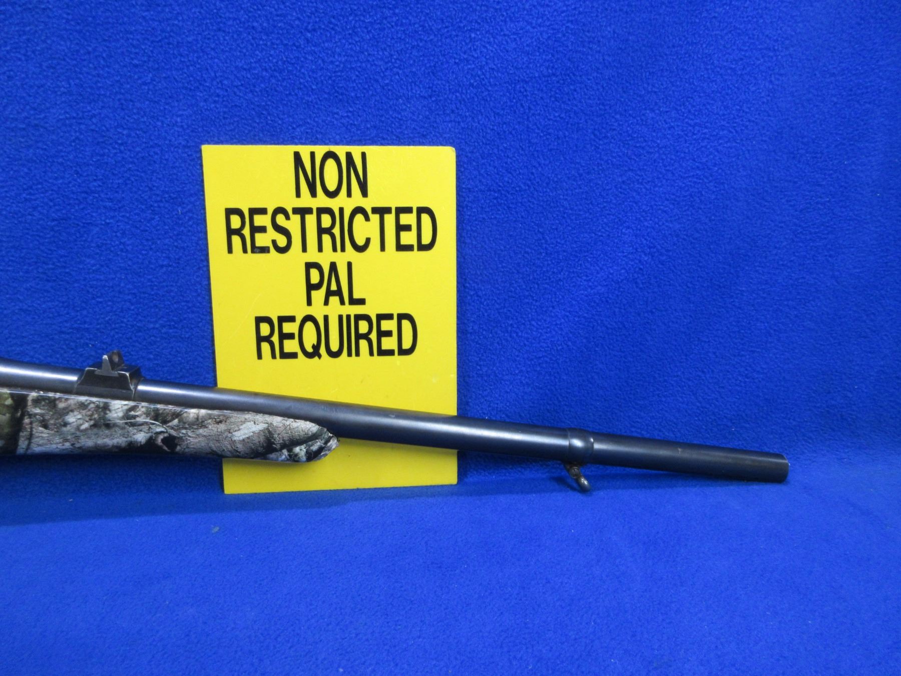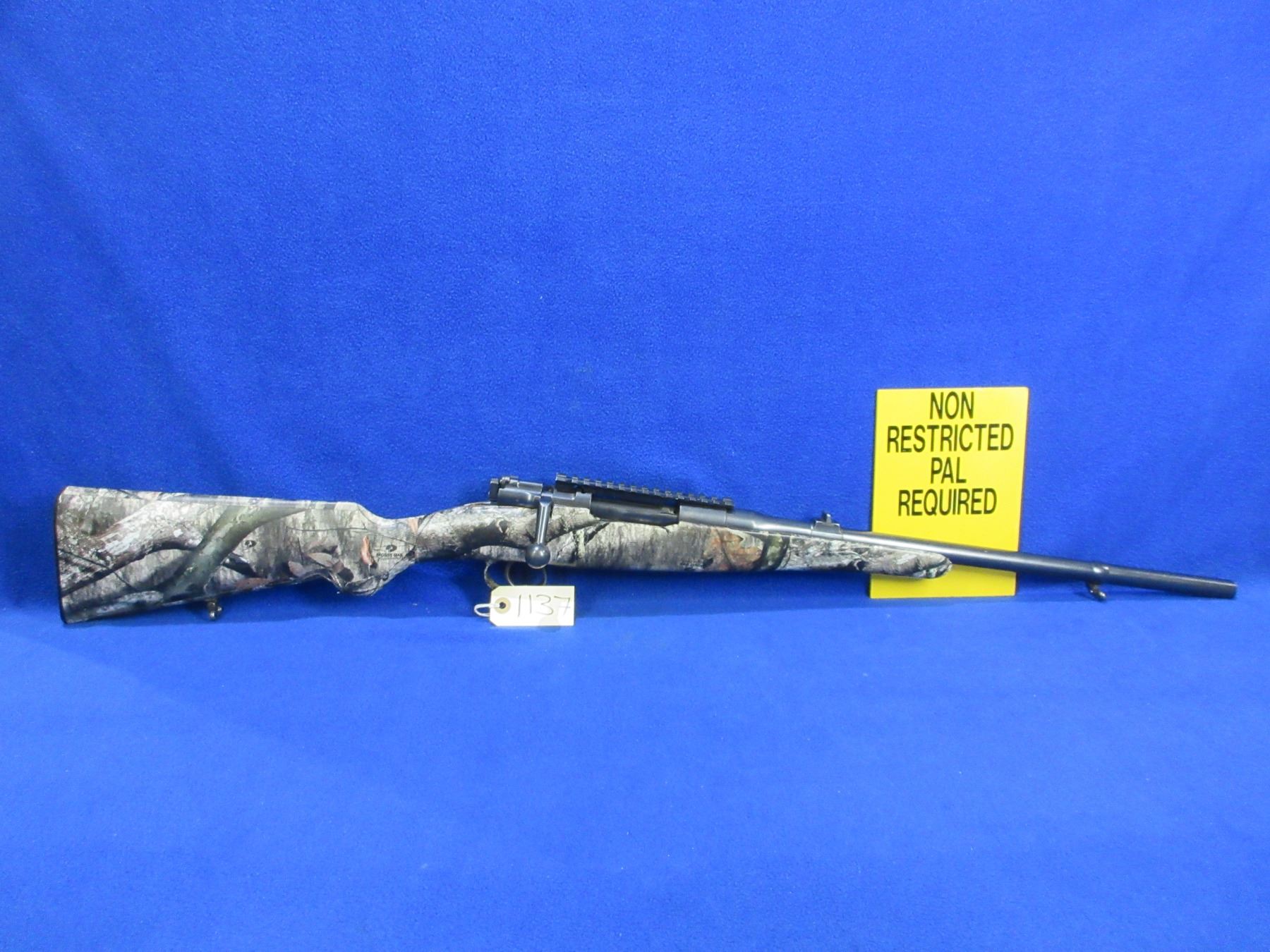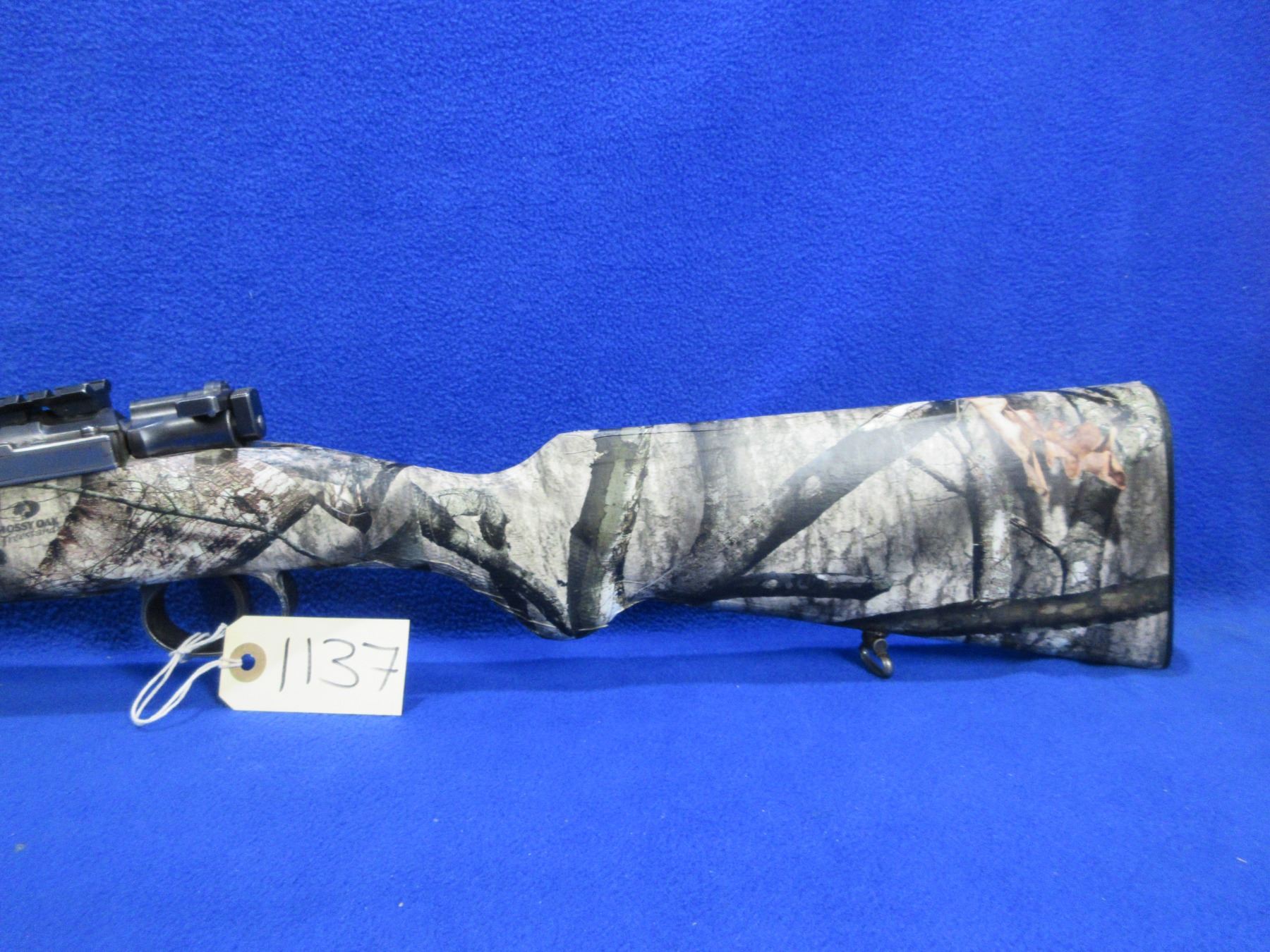 Non-Restricted - Husqvarna Model 46 in 9.3x57 - This is a bolt action rifle with floorplate magazine, action appears to be in good to very good working order. Barrel is 19" and has been shortened, rifling is good, bluing is good, has rear sight, front sight missing but has picatinny rail, Mossy Oak Treestand camo wrapped stock is good, length of pull is 14 1/2", butt plate good, comes with swivels. Ser # 4706