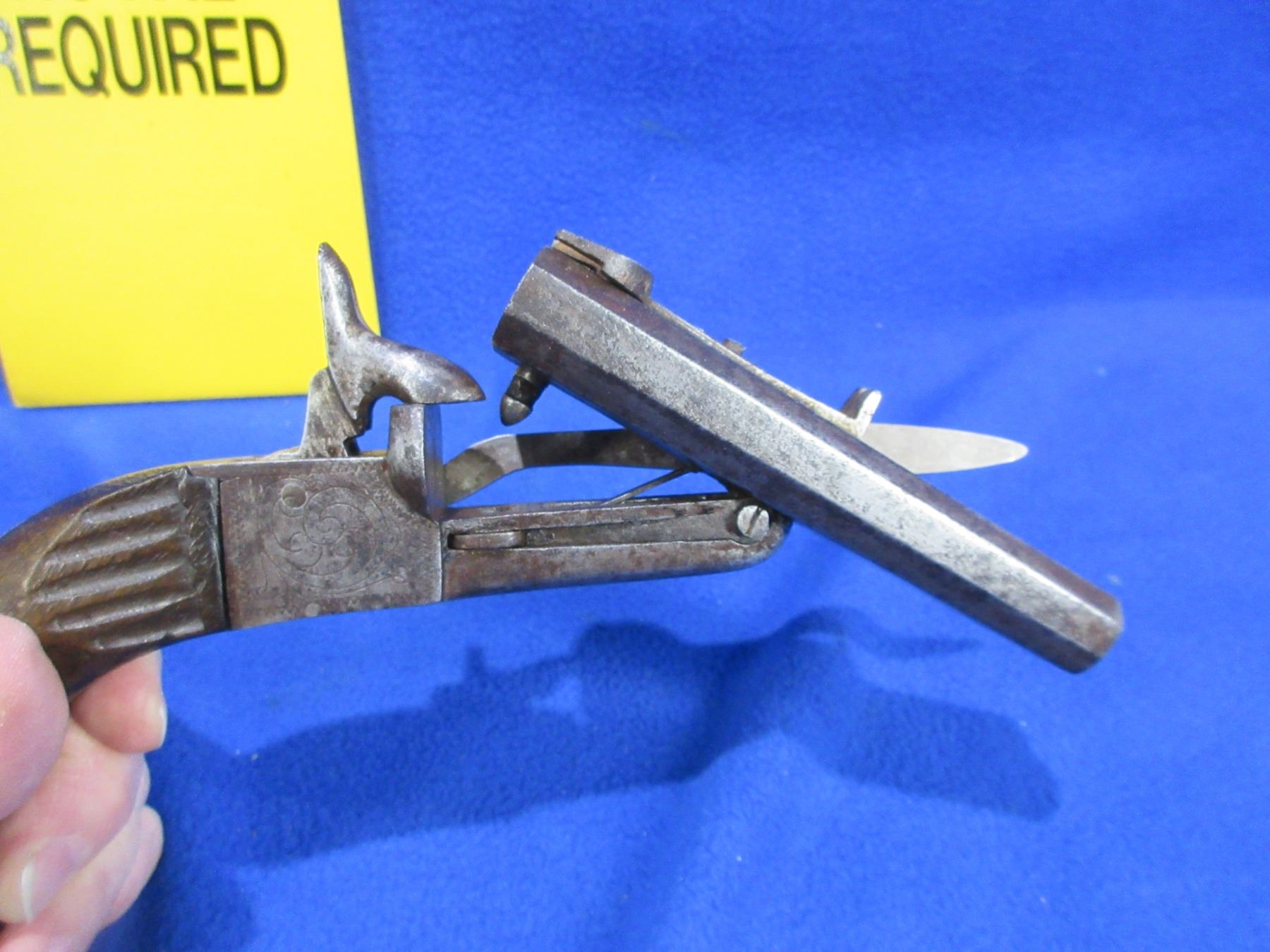 Antique - No PAL Required - Unknown Pinfire SXS Pistol in 15mm - This is a hammer pinfire SXS pistol, action appears to be in working order but has a bit of side to side play. 5" barrels, has a bayonet on the left side. Has rear sight, bores are fair for age, bluing is mostly gone, the lock is engraved. Grips are good for age, comes with lanyard ring. Ser #58