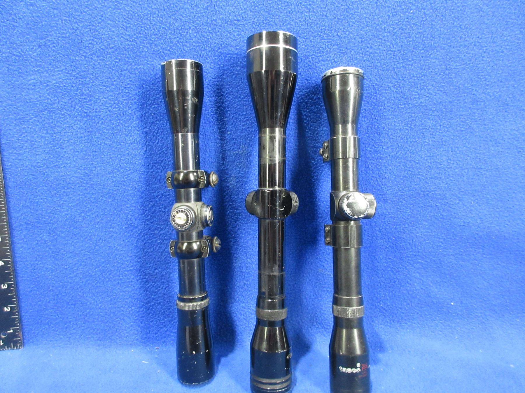 3 Scopes - Focus 4x40, Tasco 4x32, Fontaine Sportview 4x32 - All 3 Appear Clear - Fontaine has rings but is missing turret covers and has a dent on edge of eyepiece, Tasco has rings but one ring is missing the screw. Tasco has a Post Reticle, other 2 are duplex reticle.