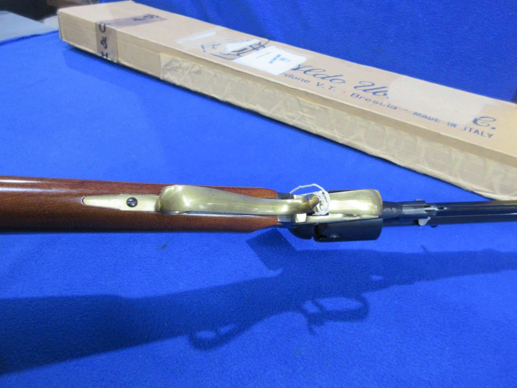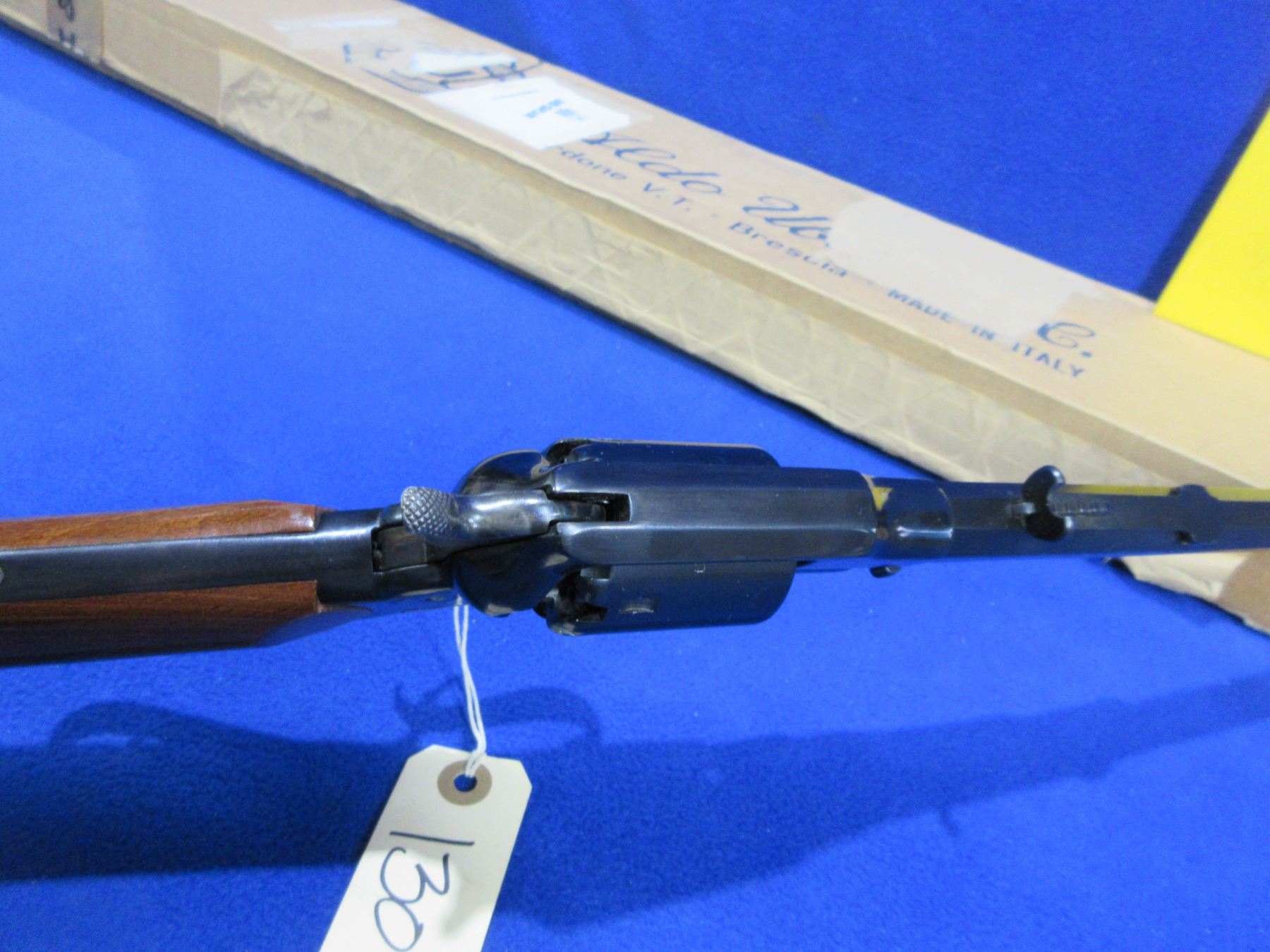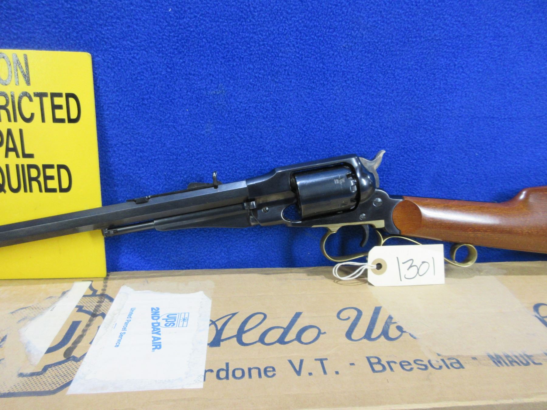 Non-Restricted - 1858 New Army Carbine in 44 Cal. - This is a 6 shot percussion cap black powder revolver rifle in like new condition, action with brass trigger guard is in very good working order. Octagon tapered barrel is 18", rifling is very good, bluing is very good, has both sights, stock is good to very good, length of pull is 14", crescent brass butt plate good, comes with original box. Ser # 99004