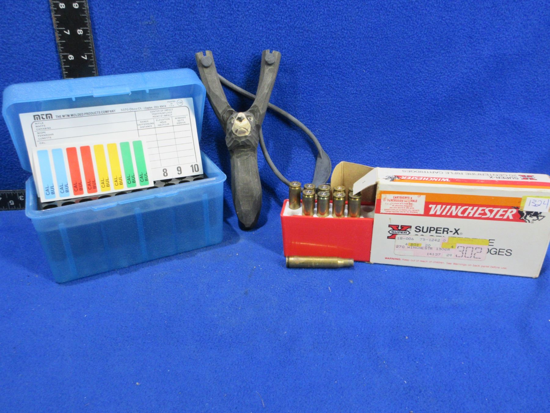 Lot 1324 Lot of Misc. - Slingshot, 270 Win. Brass x 10, New MTM H-50 Ammo Box