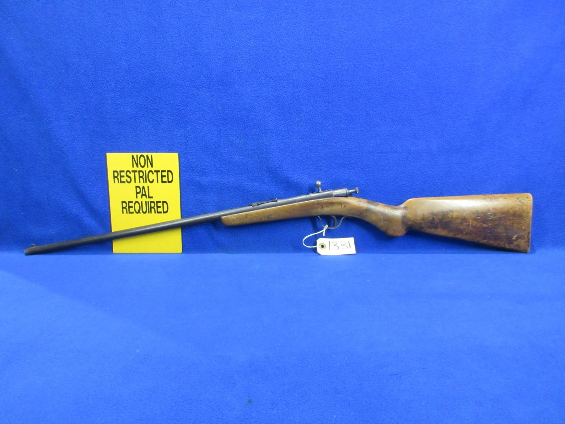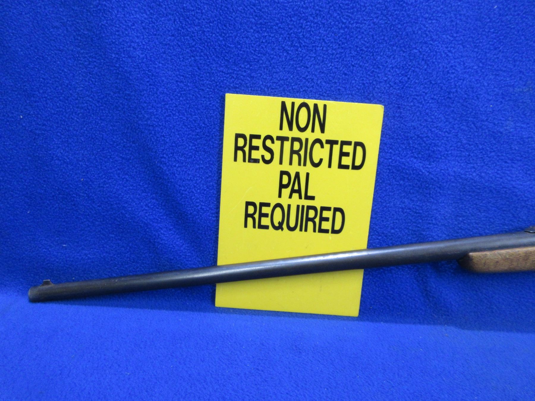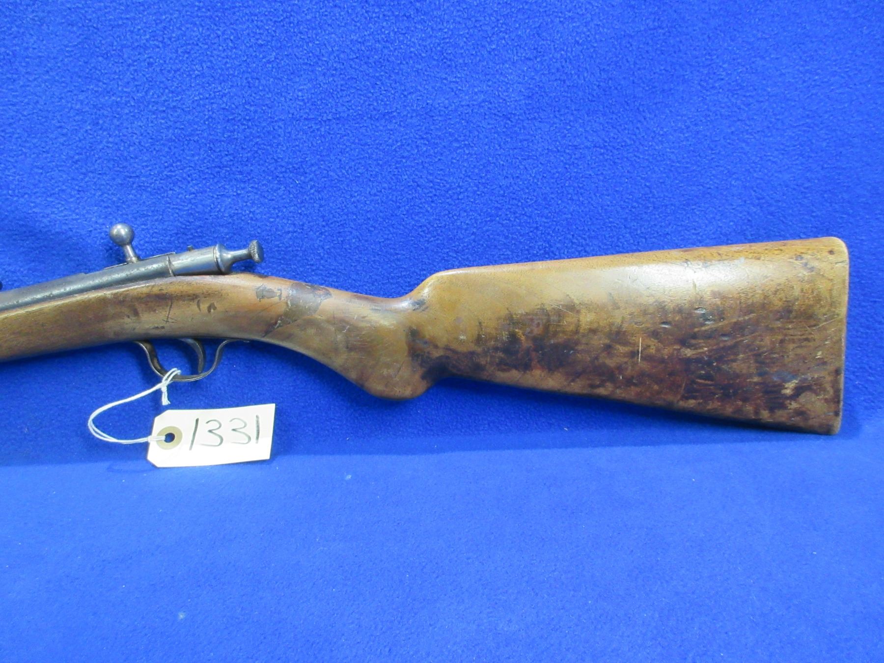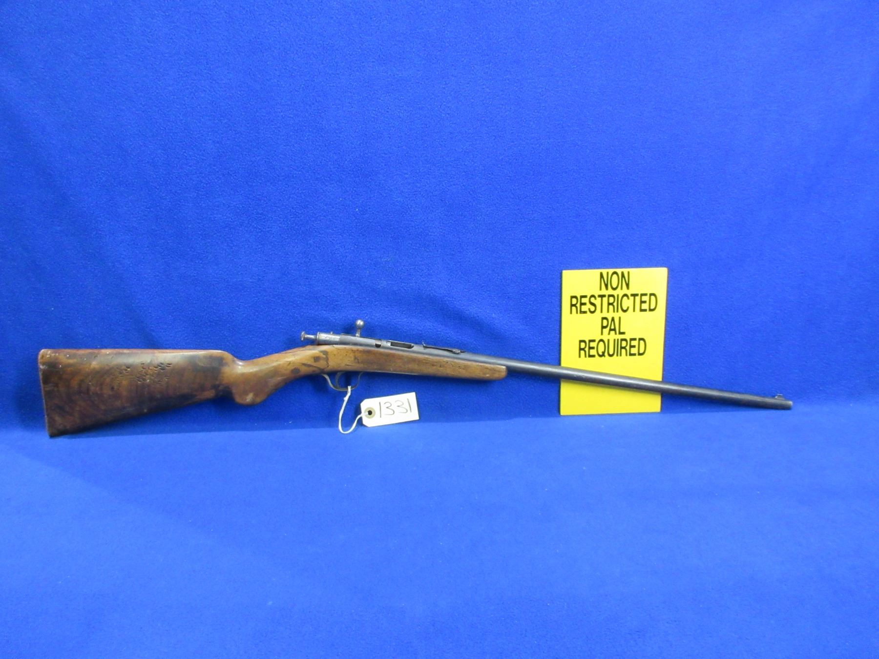 Non-Restricted - Anciens Belgian Single Shot in 22 L - This is a single shot bolt action rifle, action appears to be in working order. Barrel is 19 1/2", rifling is good, bluing has some rust and pitting, has both sights but rear sight is missing ramp, stock has a major crack repair in the wrist area, length of pull is 14". Ser # 34447