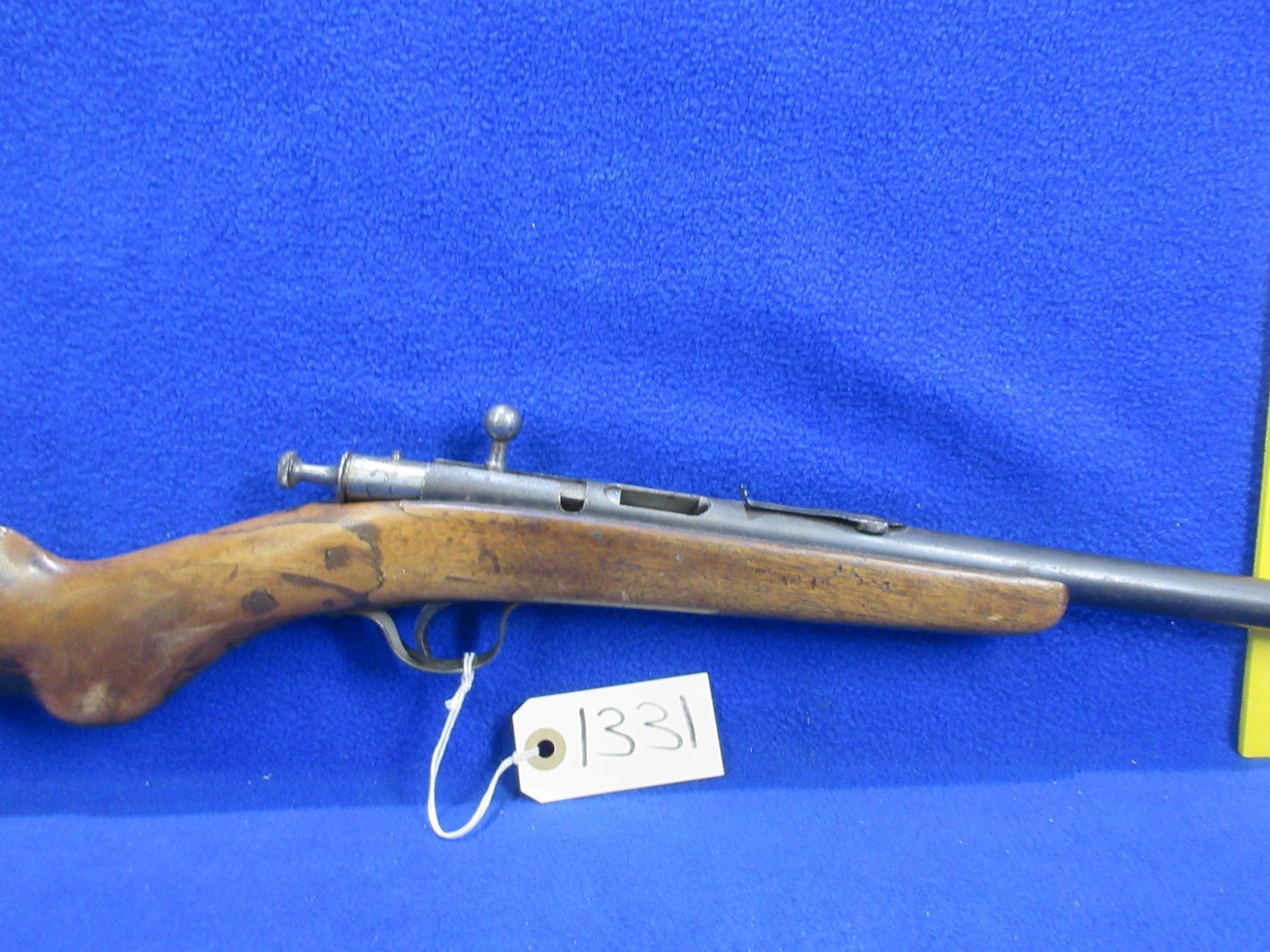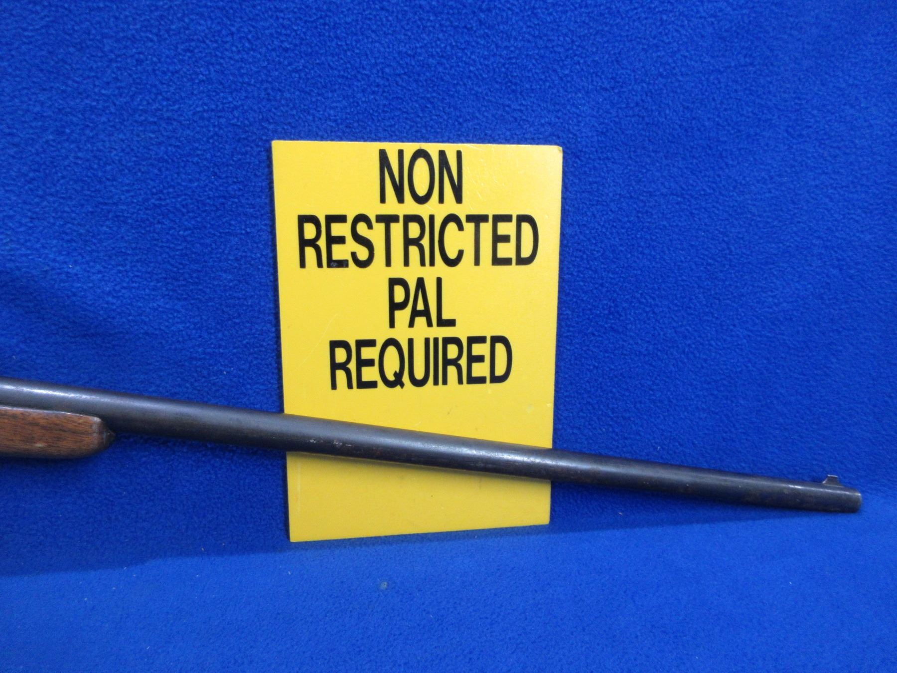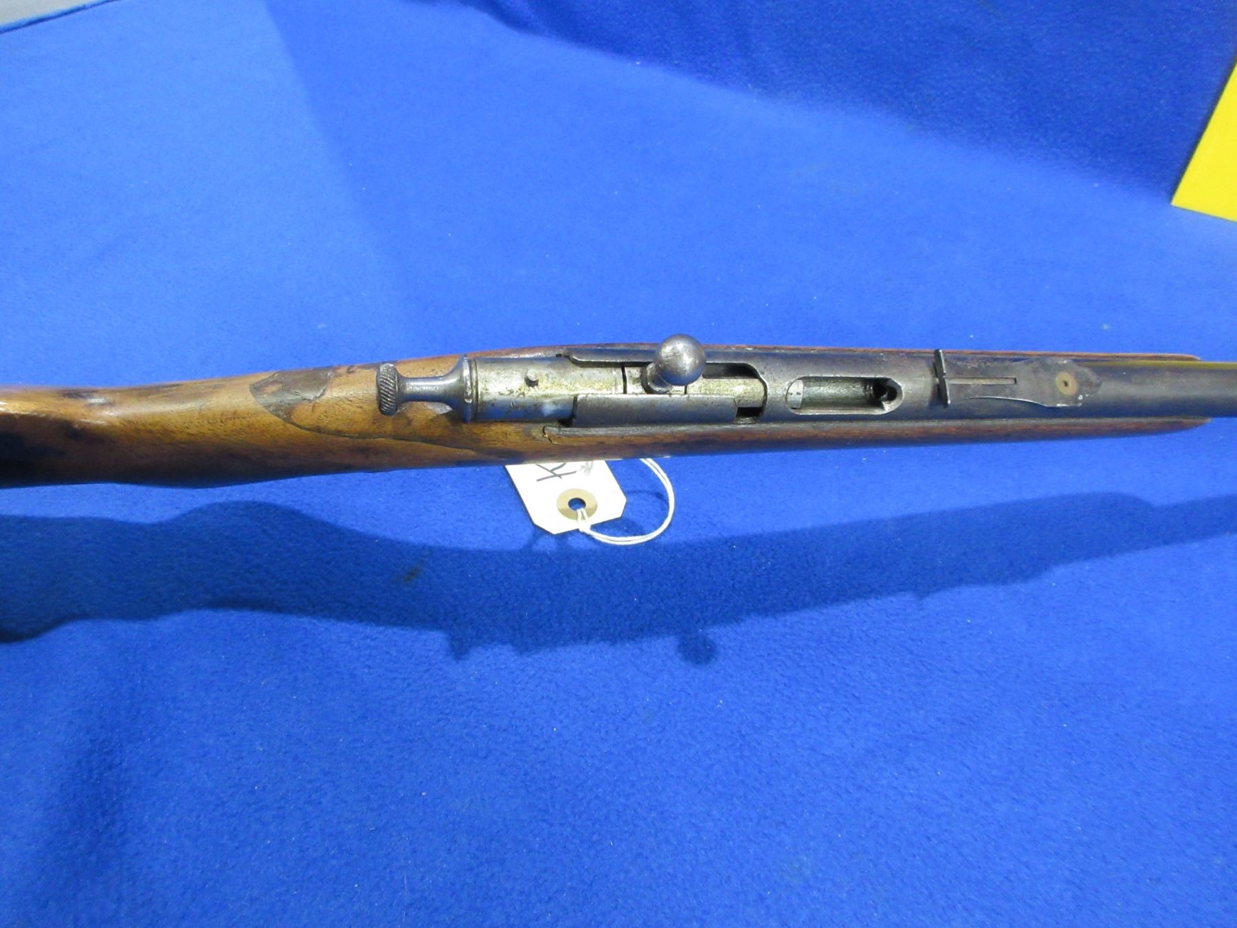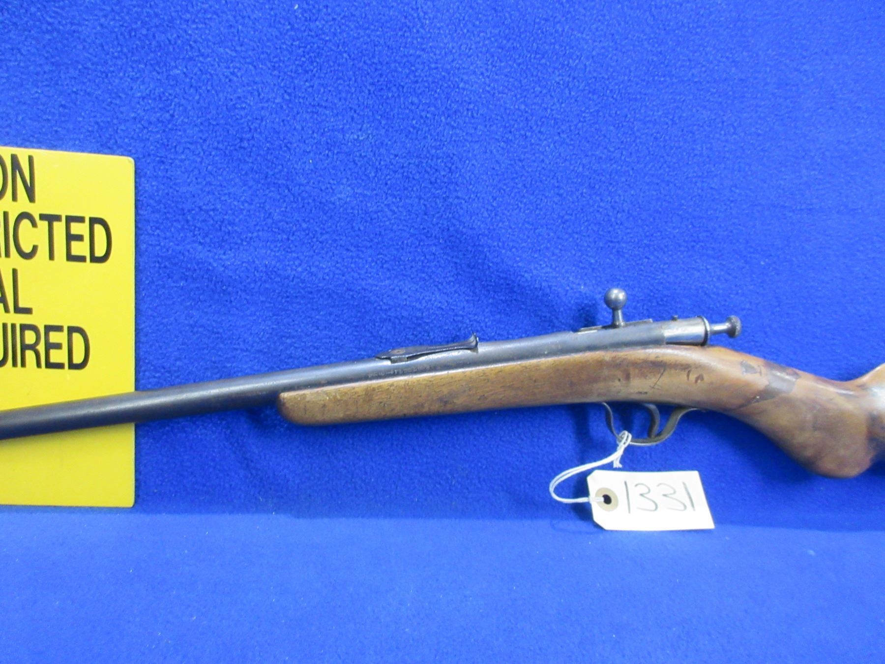 Non-Restricted - Anciens Belgian Single Shot in 22 L - This is a single shot bolt action rifle, action appears to be in working order. Barrel is 19 1/2", rifling is good, bluing has some rust and pitting, has both sights but rear sight is missing ramp, stock has a major crack repair in the wrist area, length of pull is 14". Ser # 34447