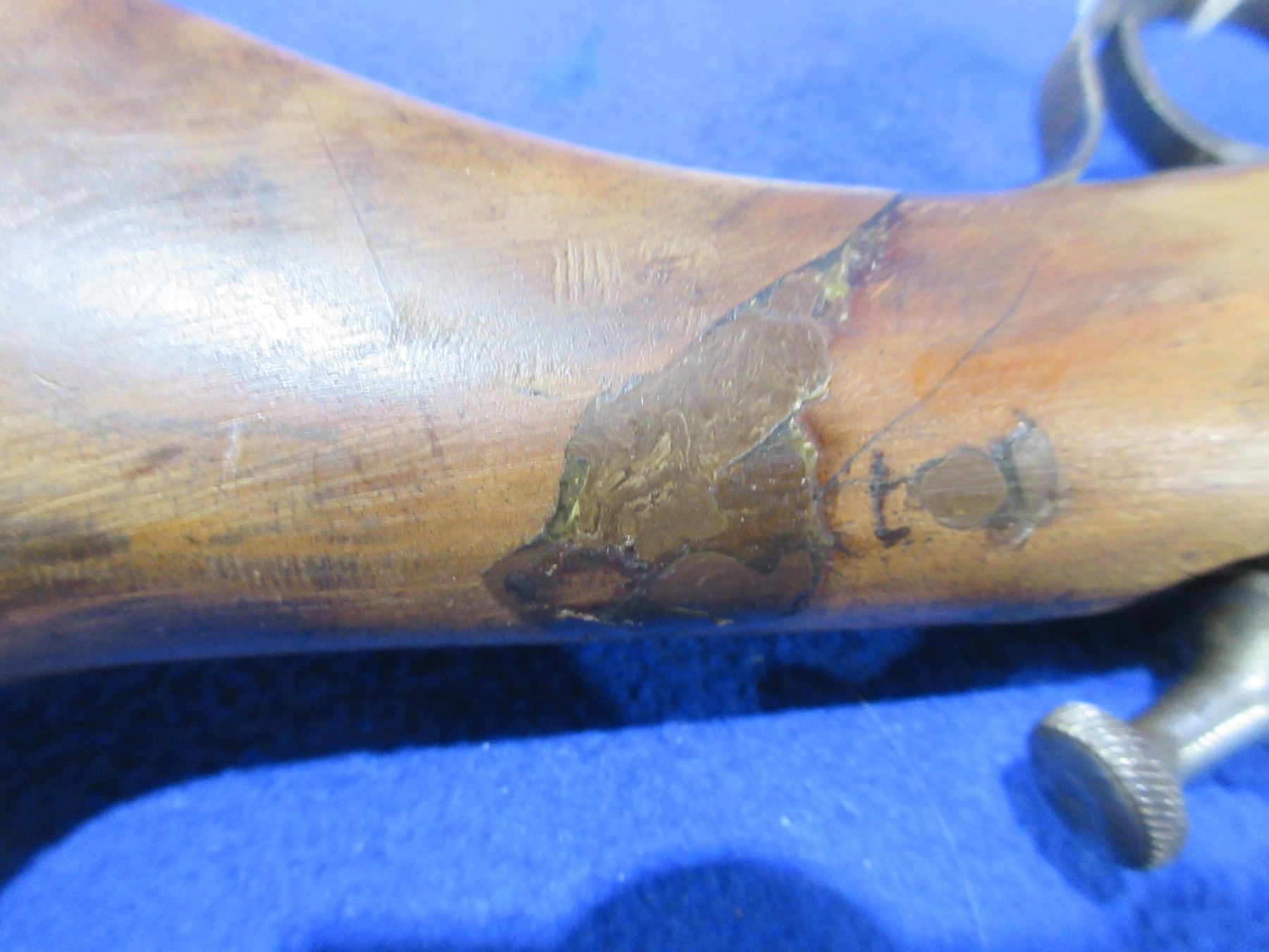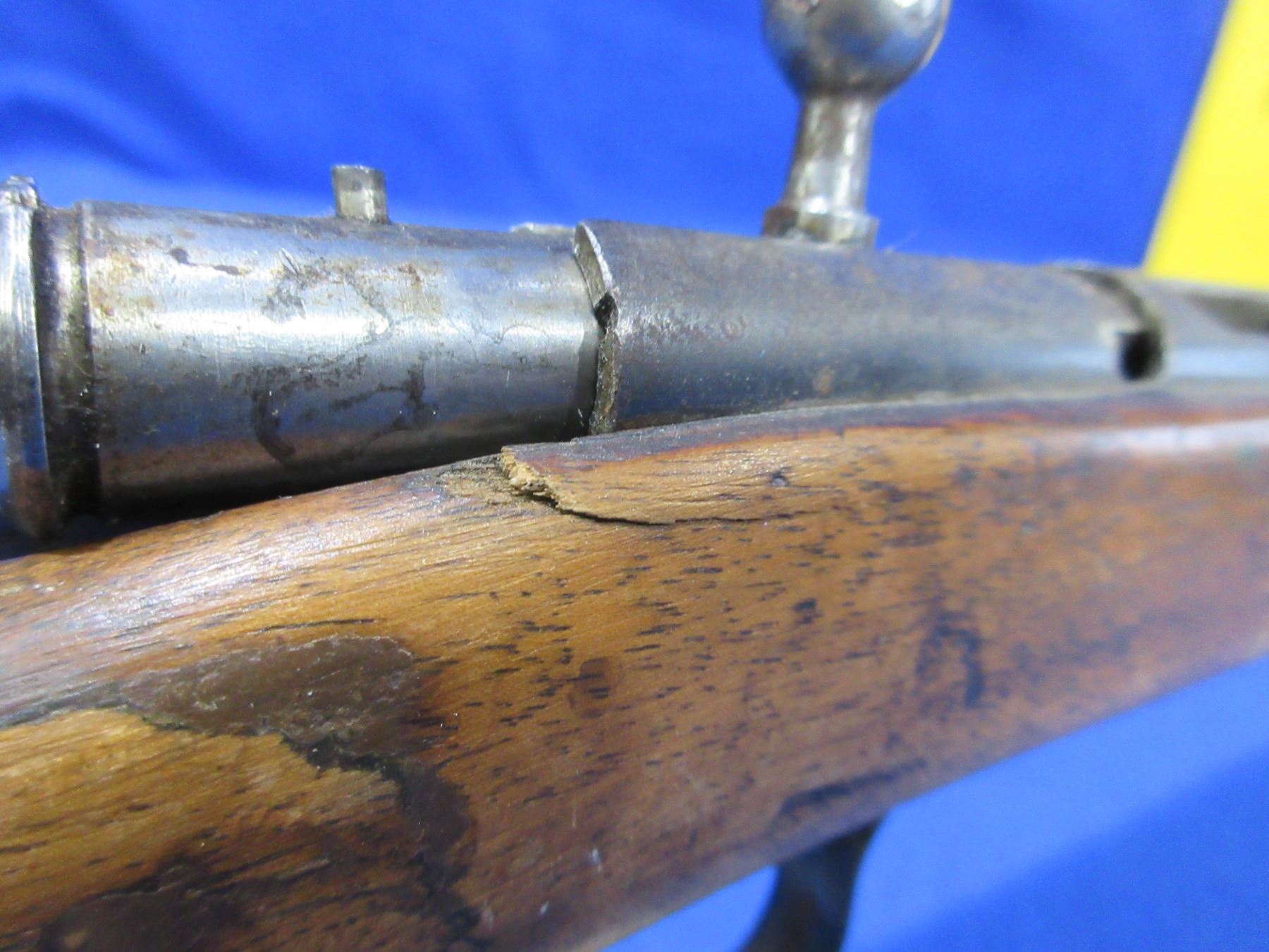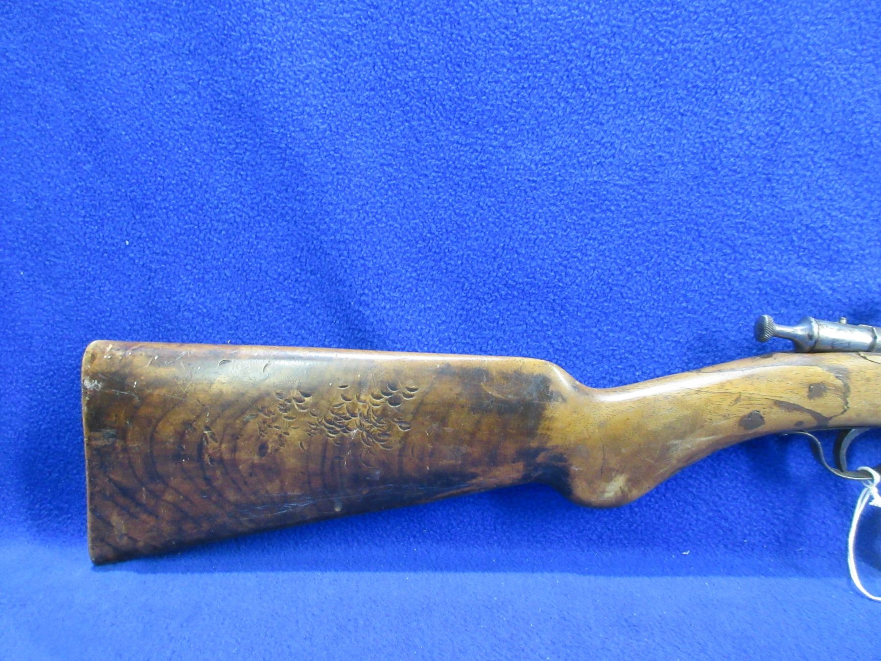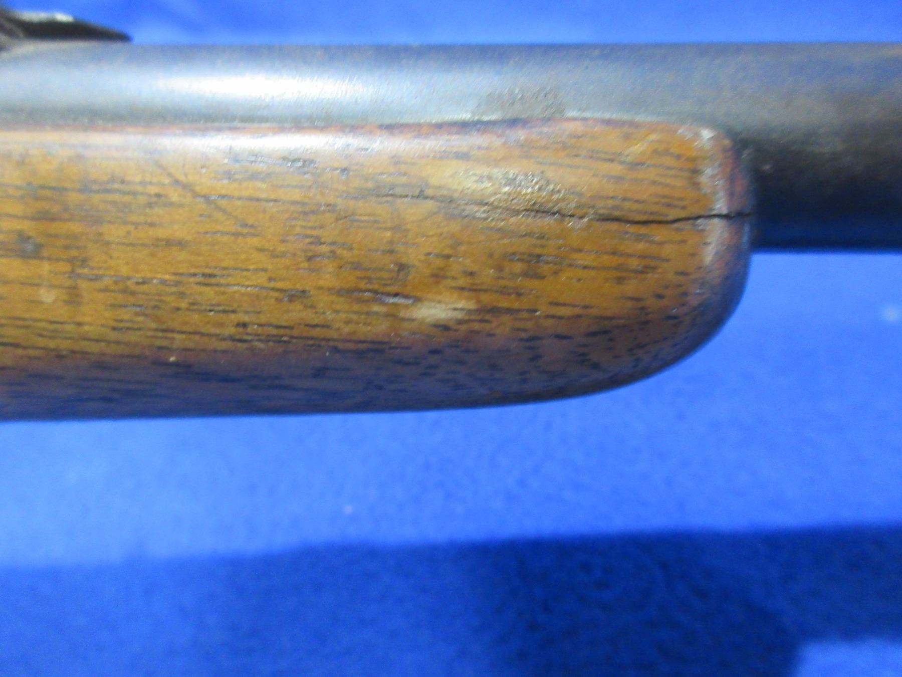 Non-Restricted - Anciens Belgian Single Shot in 22 L - This is a single shot bolt action rifle, action appears to be in working order. Barrel is 19 1/2", rifling is good, bluing has some rust and pitting, has both sights but rear sight is missing ramp, stock has a major crack repair in the wrist area, length of pull is 14". Ser # 34447
