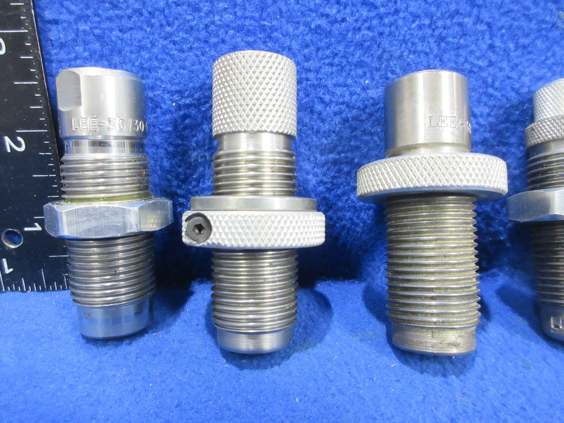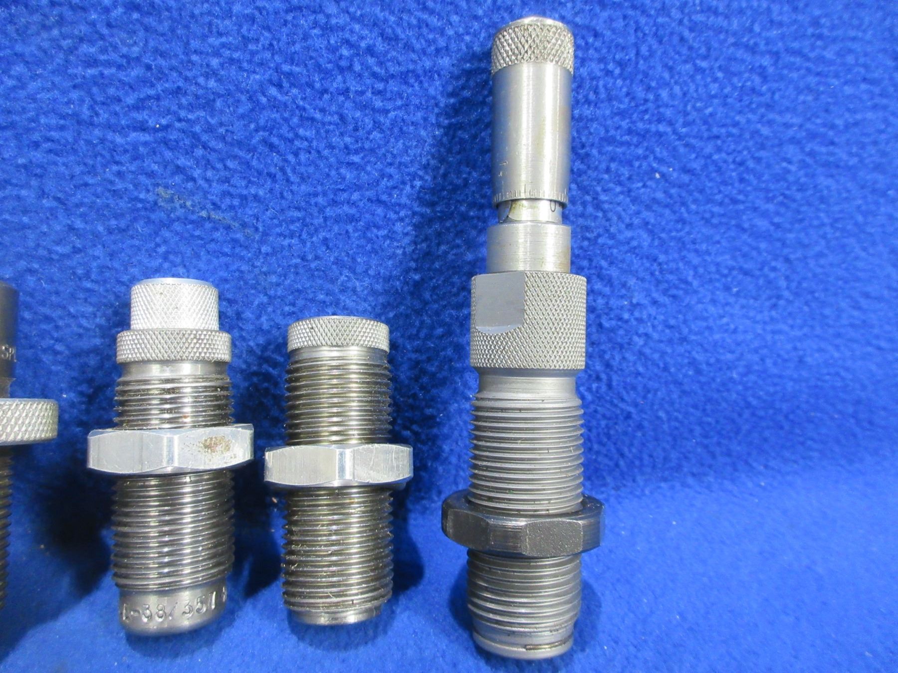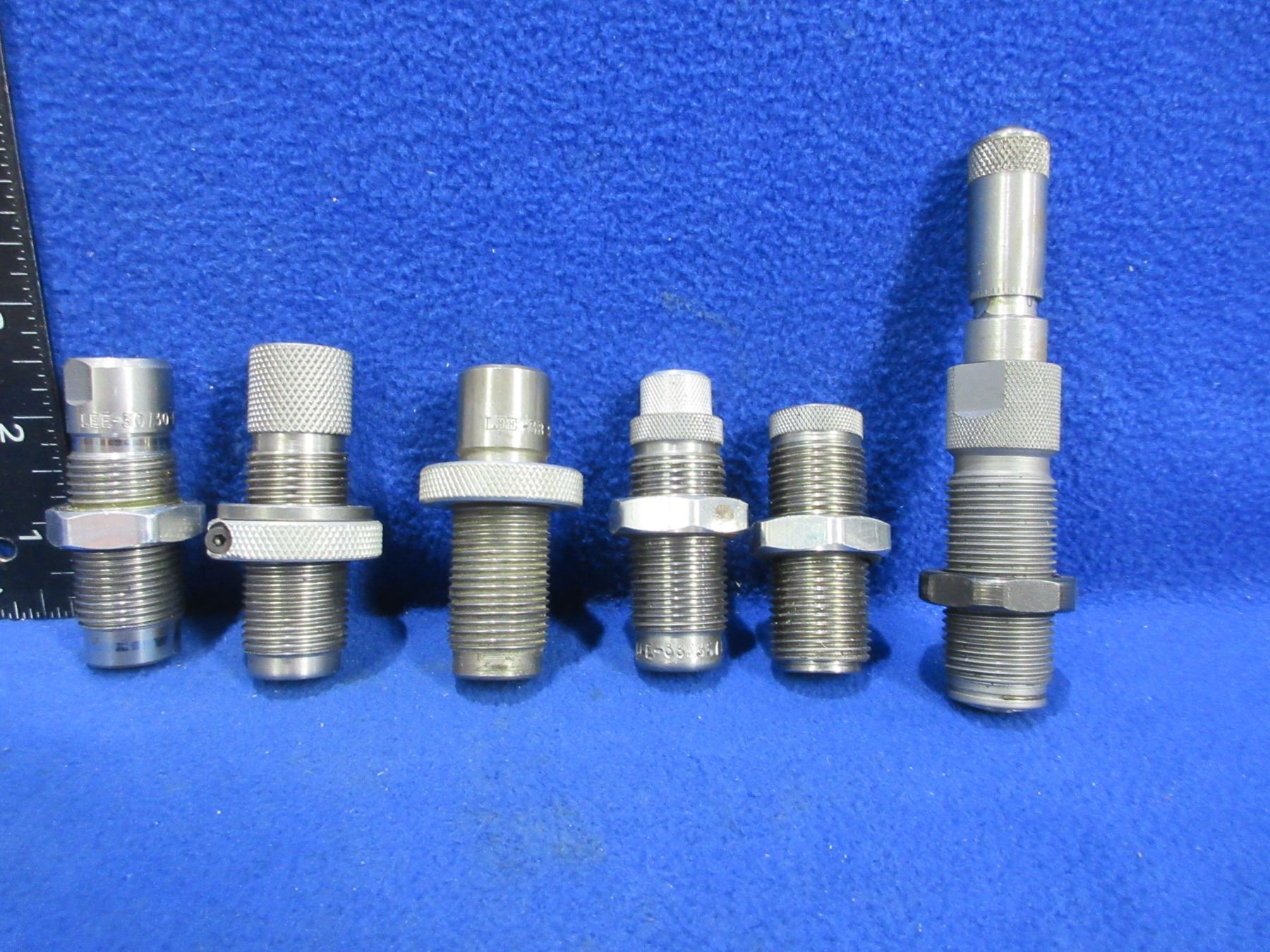 Lot of 6 Misc. Dies - As Is, Dies Maybe Missing Parts - Lee 30-30-F5, RCBS 45 Colt Seat 89, Lee 38 Spl-E3, Lee 38/357-H4, Unknown 38/357 and Unknown Taper Crimp Die