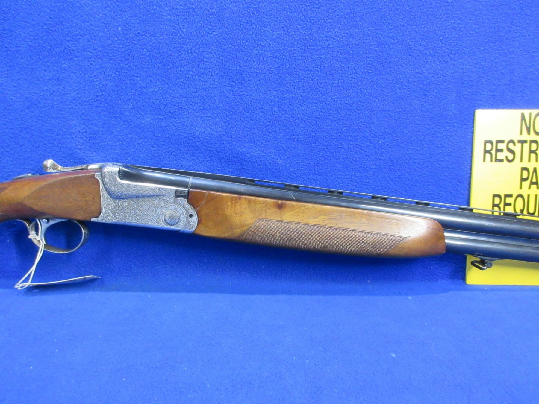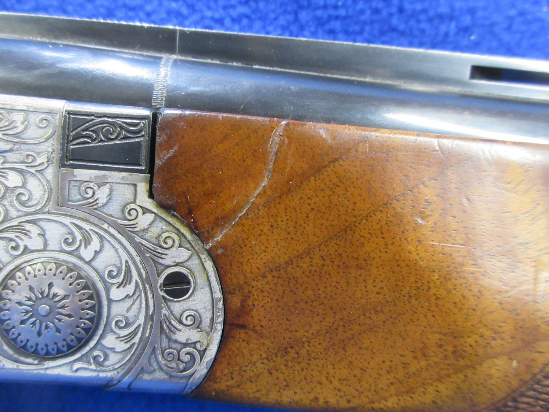 Non-Restricted - SKB Arms Co. Model 600 in 12 Ga.2 3/4" - This is an over/under shotgun with single trigger and ejectors. The action and trigger assembly are very nicely engraved in high relief, action is tight and appears to be in good to very good working order. Vent rib barrels are 28", bores are good to very good, bluing is good to very good, has bead front and mid sights, stock is good to very good, forearm has a crack repair on the right side by the action, length of pull is 13 1/2", butt plate may be incorrect to gun, comes with swivels. Ser # S5625669