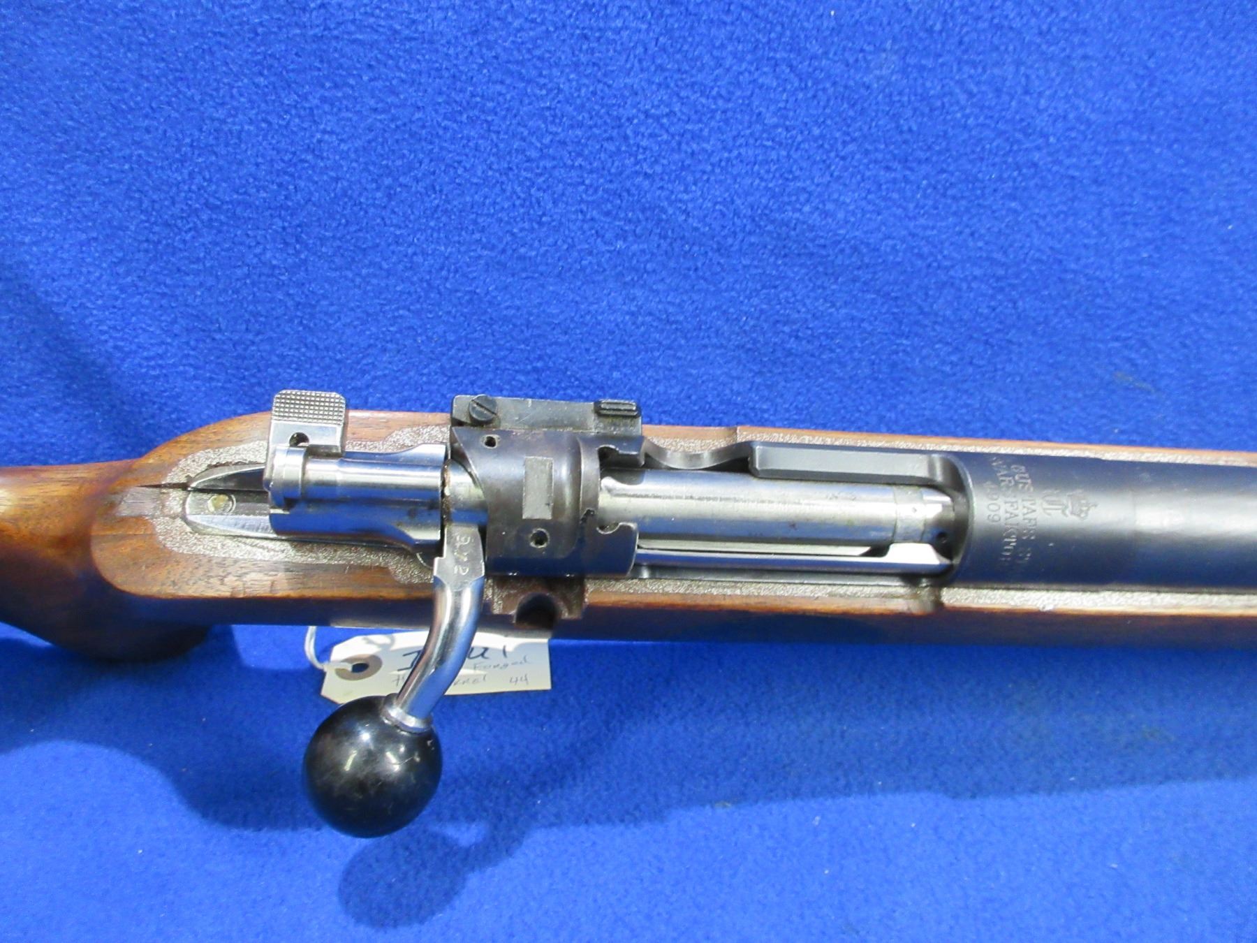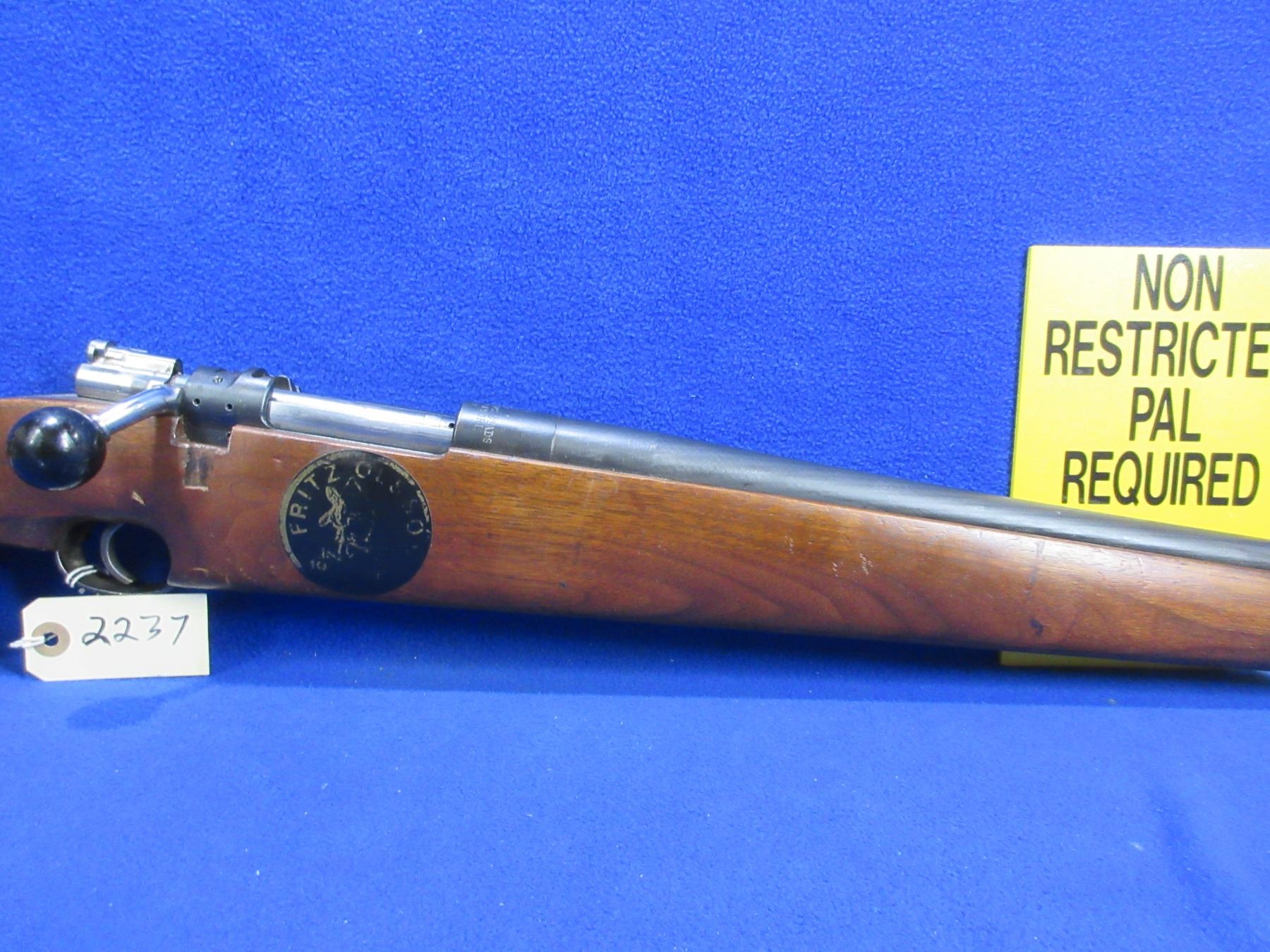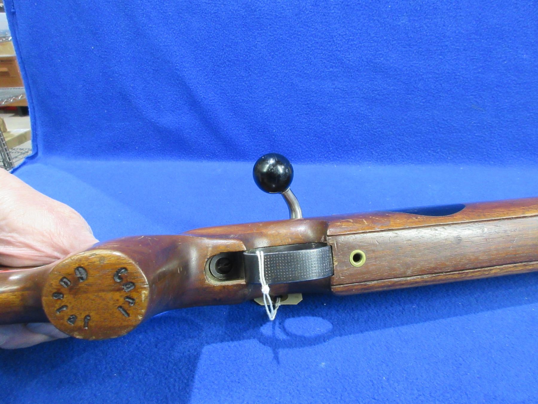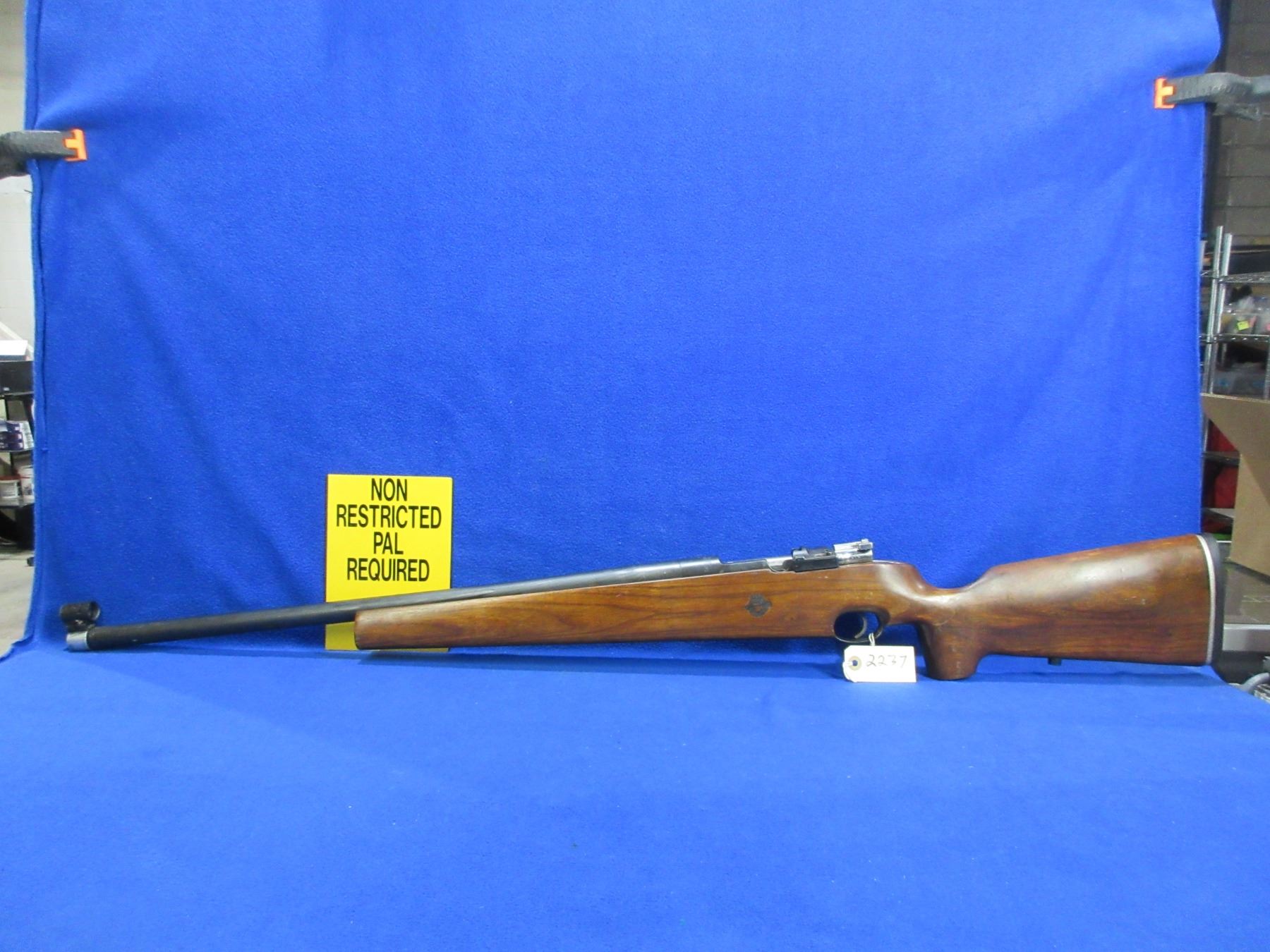 Non-Restricted - Carl Gustof Model 80 in 6.5x55 - This is a bolt action rifle with removable magazine, action appears to be in good to very good working order. Hammer forged heavy barrel is 25 1/2", action has been professionally bedded into the stock, rifling is good to very good, bluing is good to very good, has front peep sight, missing rear sight, Gustof target stock is good to very good but incorrect to gun and has three stickers adhered, length of pull is 14", adjustable pad good. Ser # 242972
