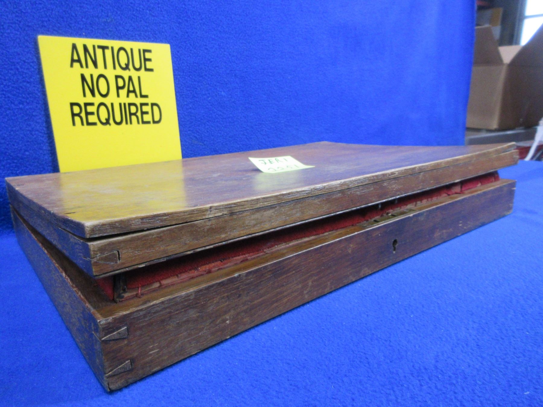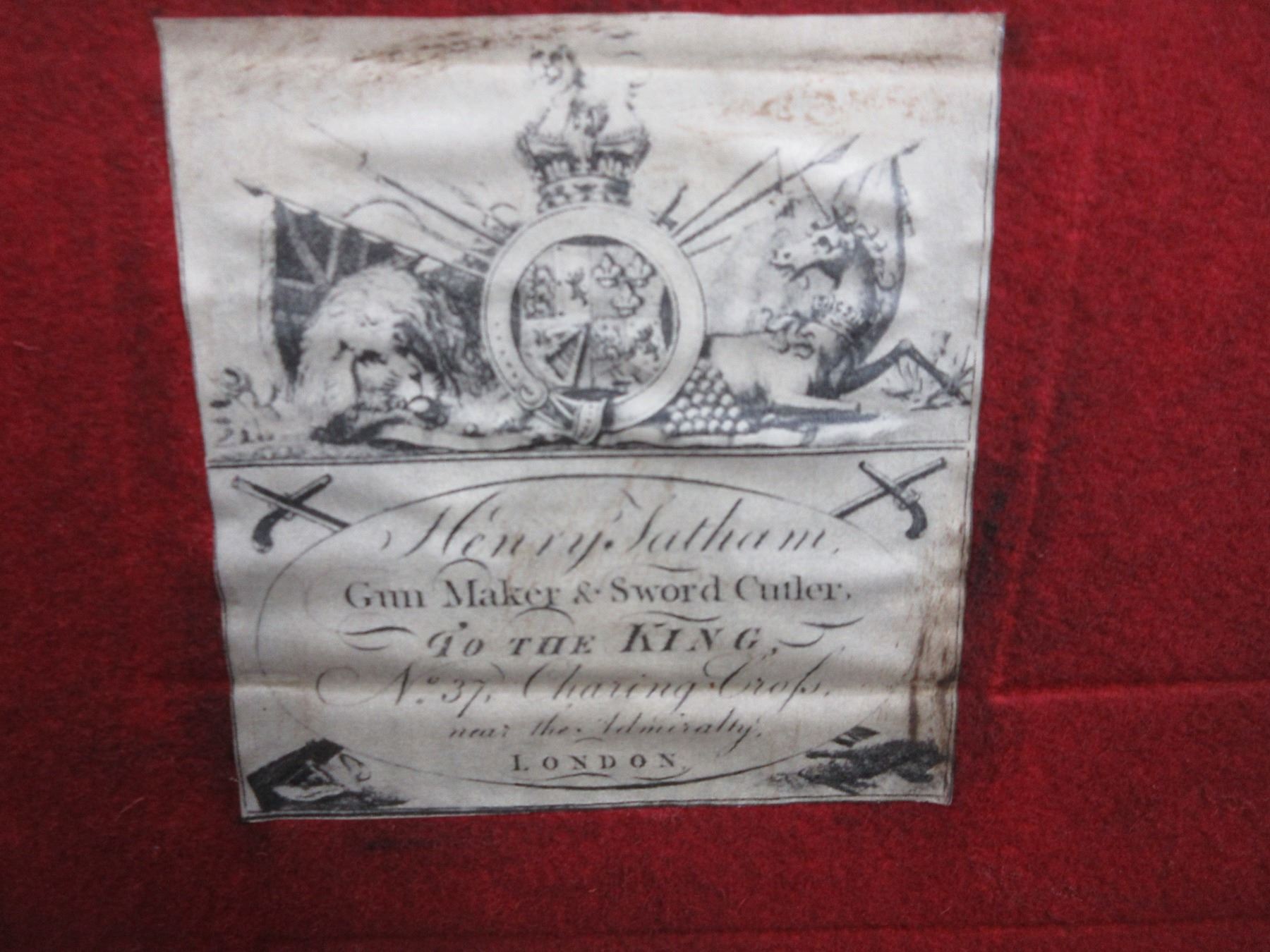 Antique - No PAL Required - Henry Tatham (Gun Maker & Sword Cutler to the King) Cap & Ball Pistol set in 50 Cal. - A unique piece of history, this is a matched set of cap and ball single-shot dueling pistols, actions appears to be in good to very good working order. Octagon barrels with beautiful brown Damascus finish are very good and approx. 10", has engraving on the lock, butt plate and trigger bottom, wood stocks are good to very good but one has a repaired chip by the ram rod, comes with case (appears original), bullet mold, powder flask (unsure if powder flask and bullet mold are correct to guns), Case lid is warped and will likely straighten up in a higher humidity. No keys for the case. Ser #'s None