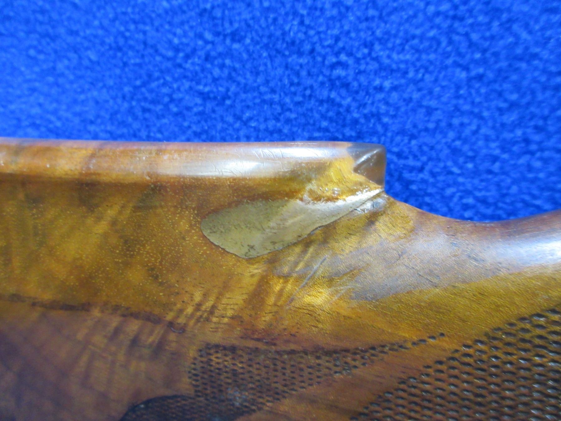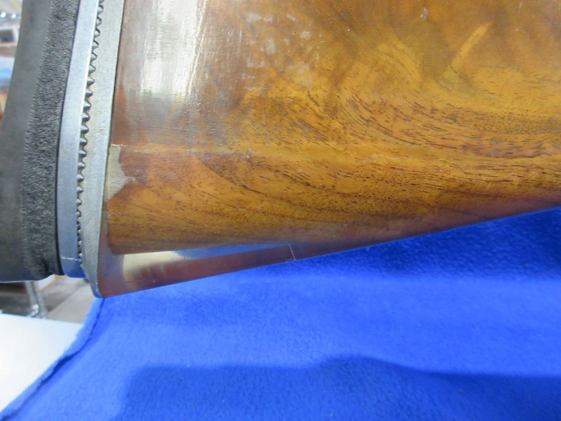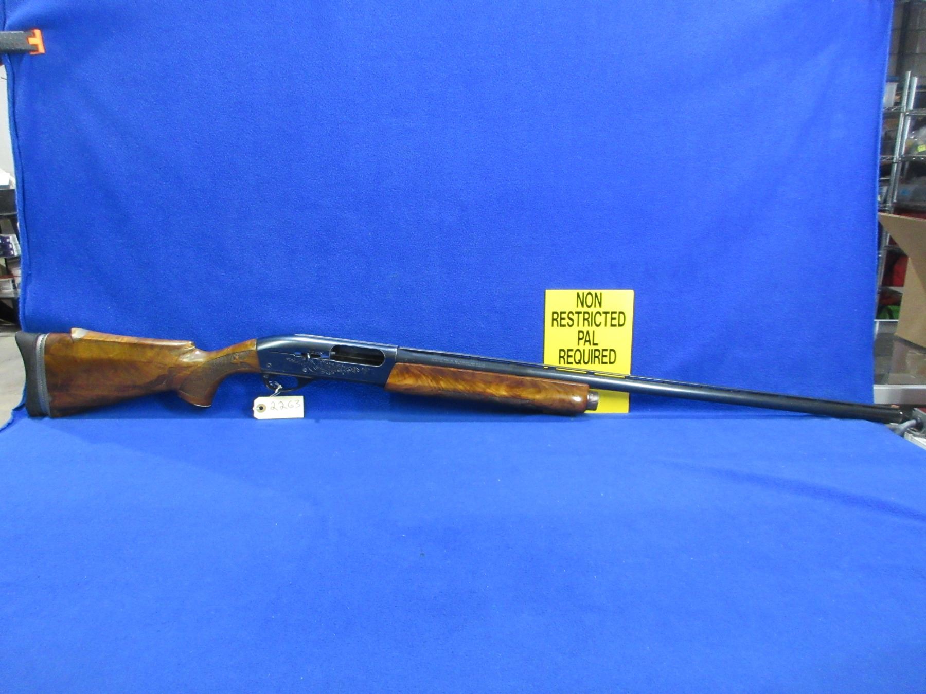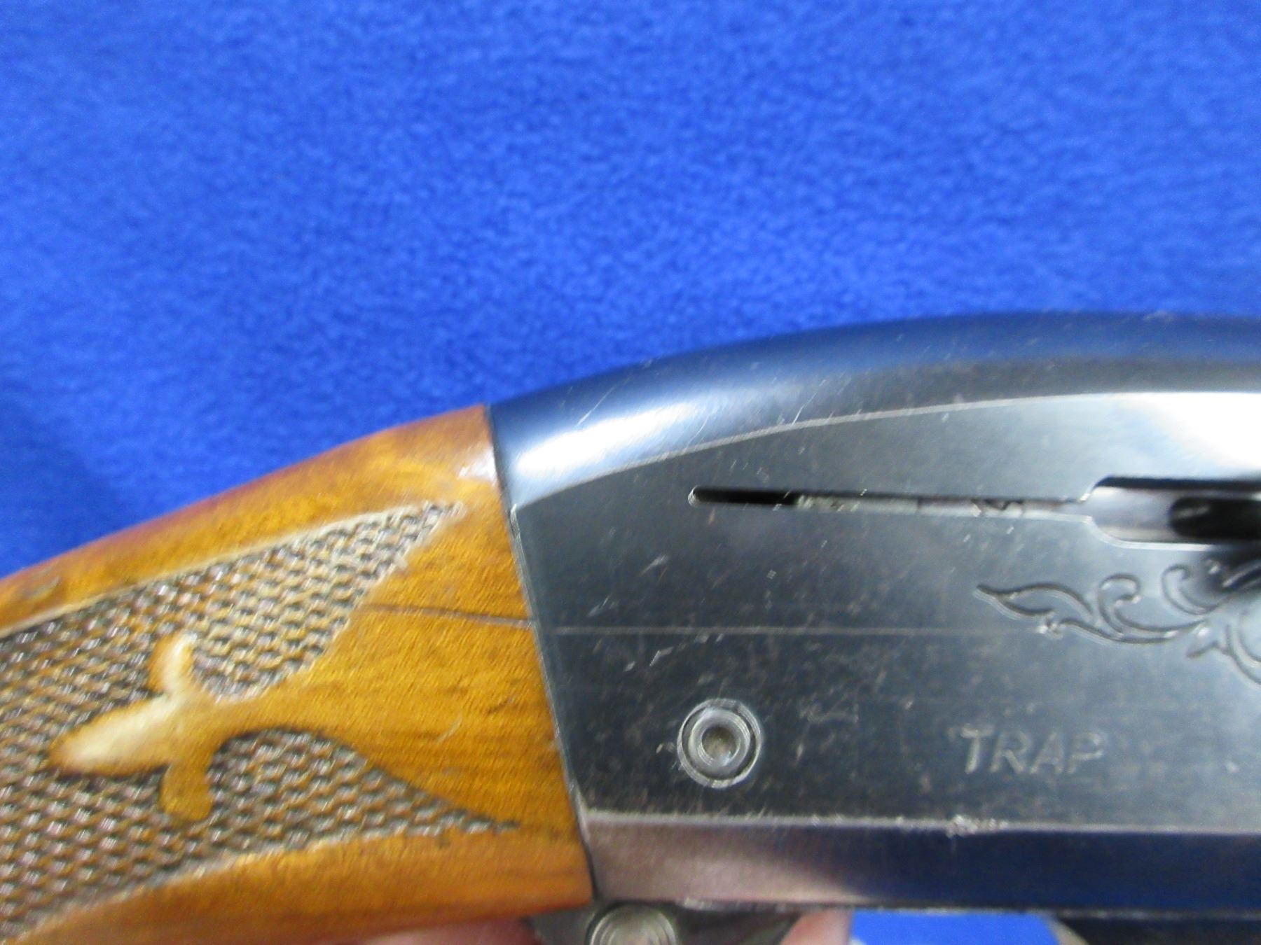 Non-Restricted - Remington Model 1100 Trap in 12 Ga. 2 3/4" Full - This is a semi-auto shotgun, action appears to be in good to very good working order. Vent rib barrel is 30", bore is good to very good, bluing is good to very good, has fiber optic front sight and mid bead sight, stock is good to very good with a beautiful grain but has an epoxy molded comb and toe area added and has a scratch on right side by action, forearm also has a beautiful grain and is good to very good, length of pull is 13 3/4", adjustable Trap style butt plate rubber is starting to come loose. Ser # L899365V