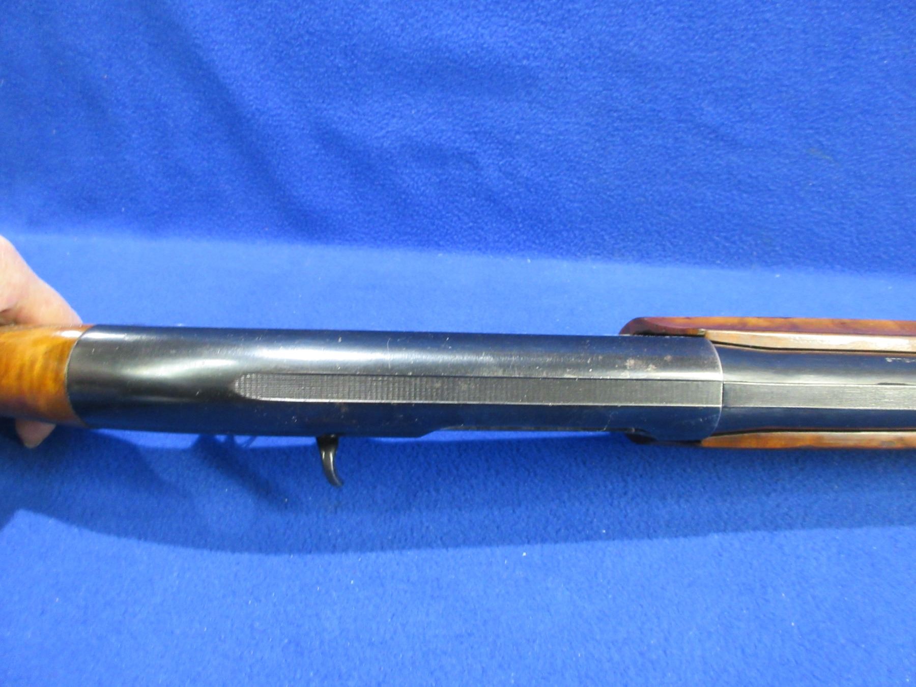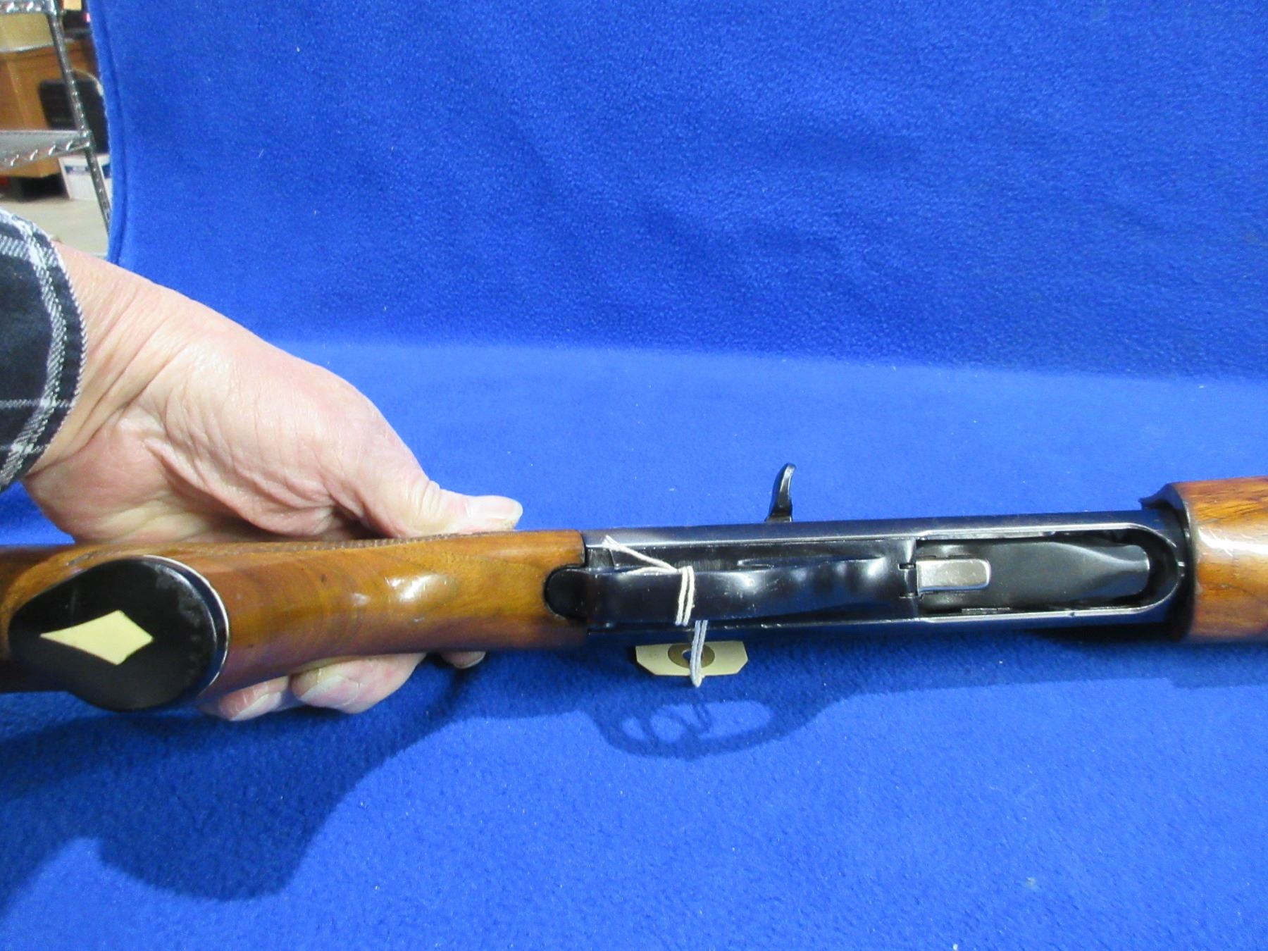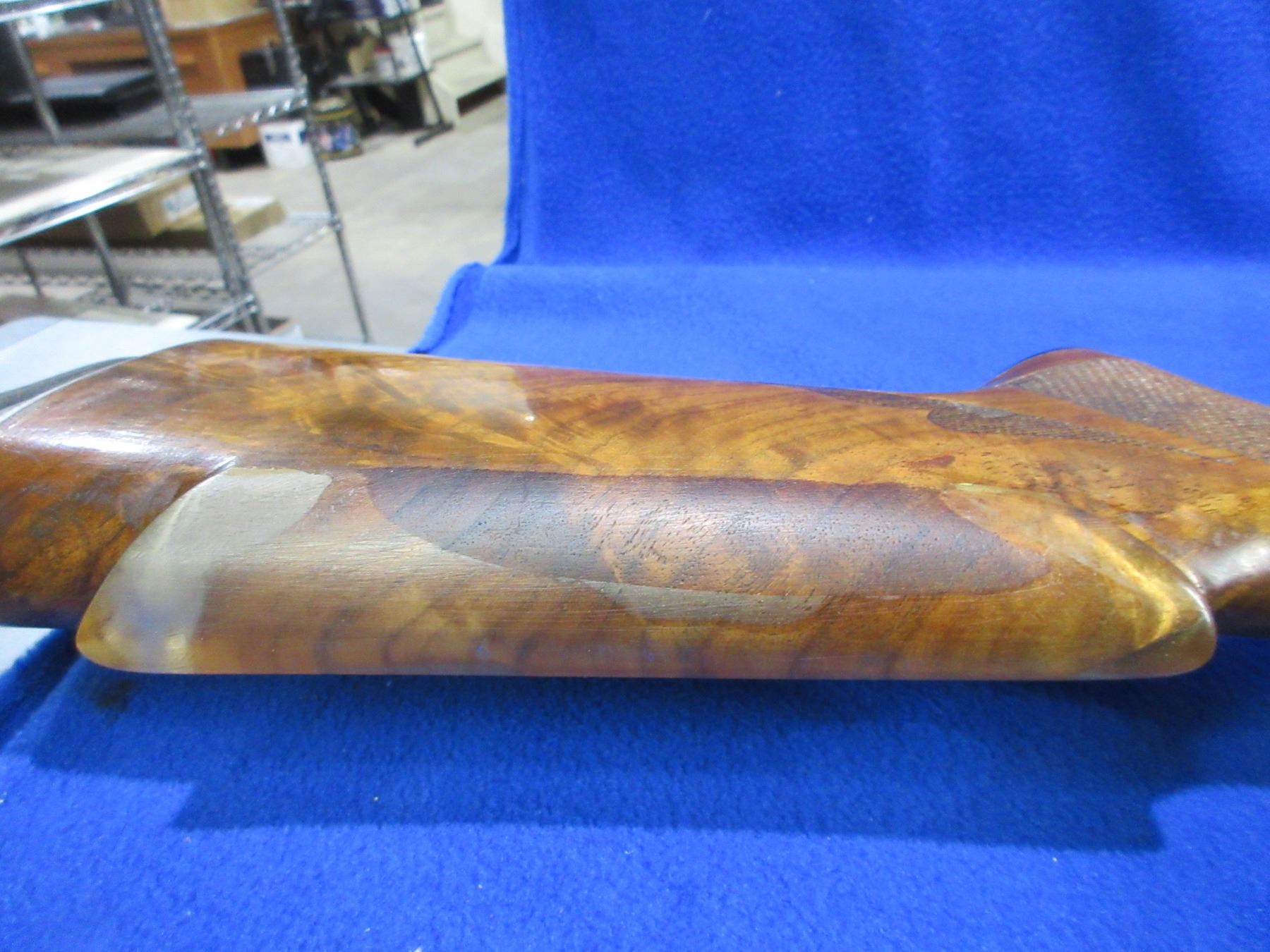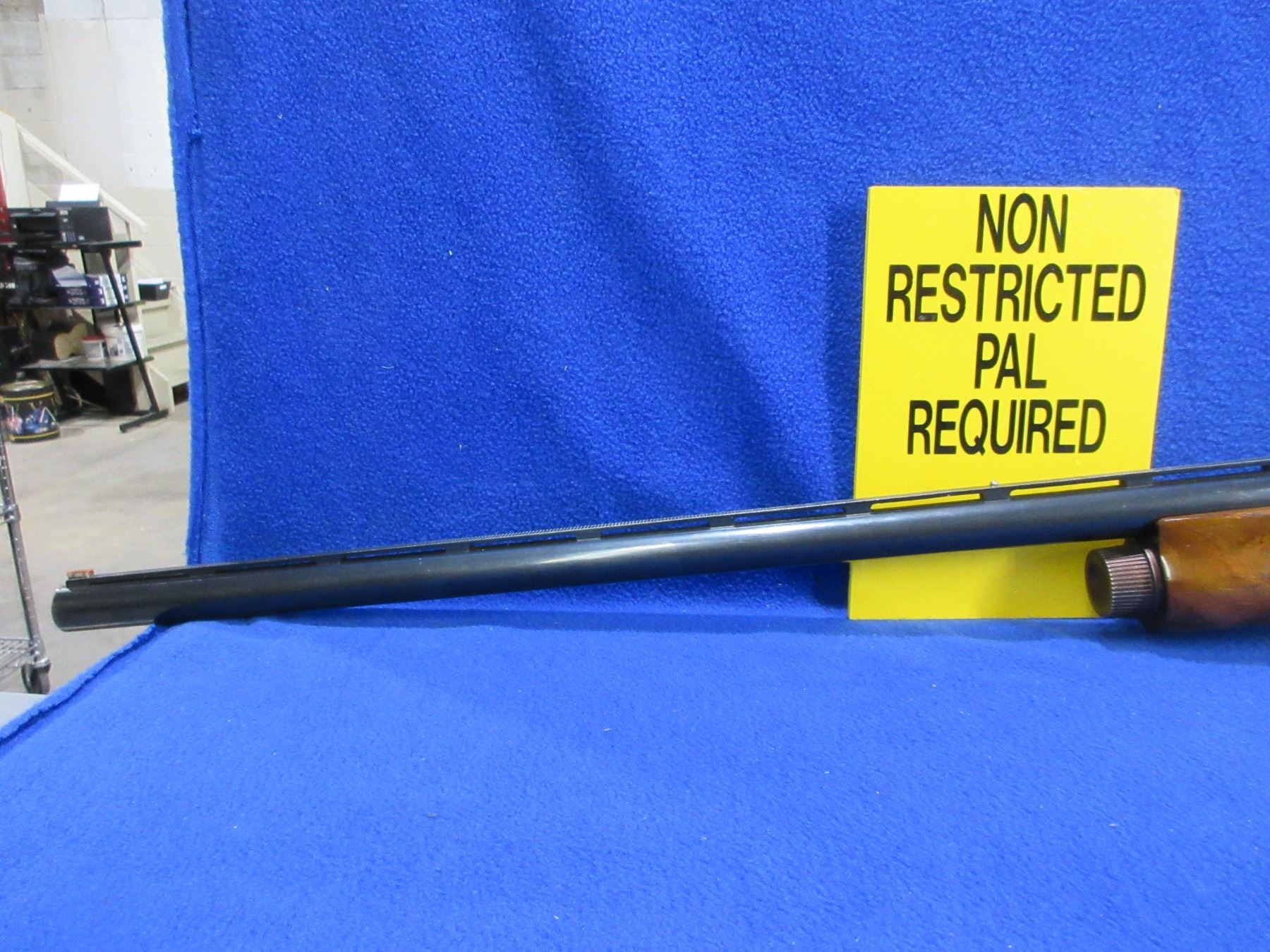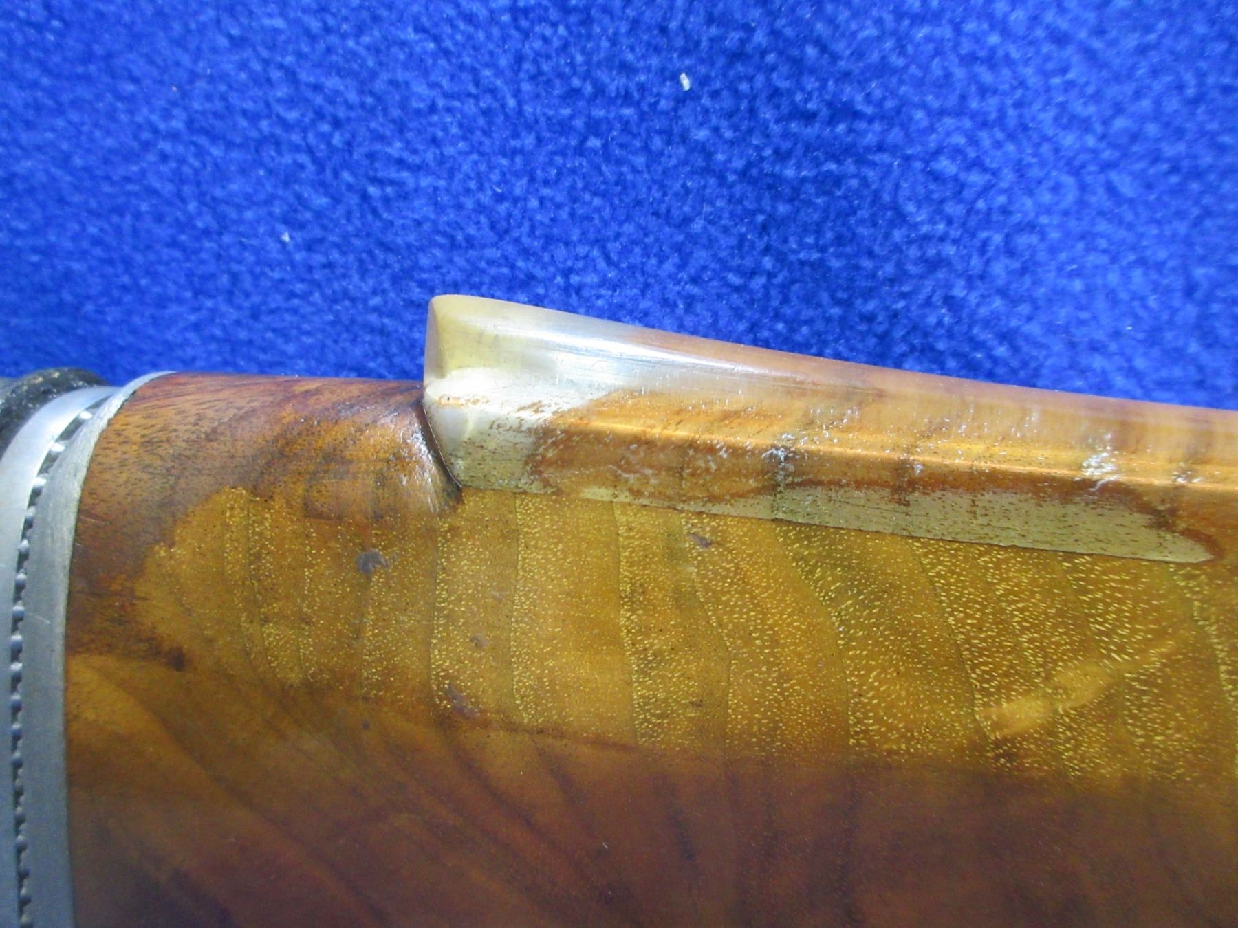 Non-Restricted - Remington Model 1100 Trap in 12 Ga. 2 3/4" Full - This is a semi-auto shotgun, action appears to be in good to very good working order. Vent rib barrel is 30", bore is good to very good, bluing is good to very good, has fiber optic front sight and mid bead sight, stock is good to very good with a beautiful grain but has an epoxy molded comb and toe area added and has a scratch on right side by action, forearm also has a beautiful grain and is good to very good, length of pull is 13 3/4", adjustable Trap style butt plate rubber is starting to come loose. Ser # L899365V