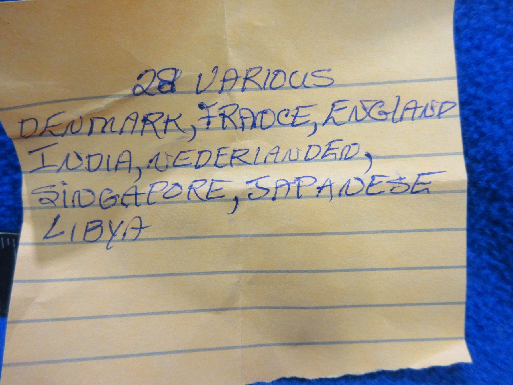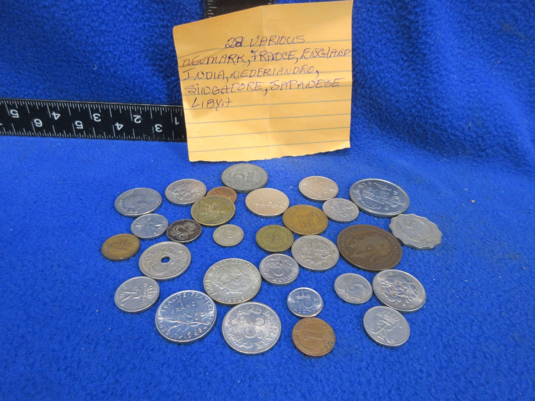28 Assorted Coins - Denmark, France, England, India, Netherlands, Singapore, Japan, Libya