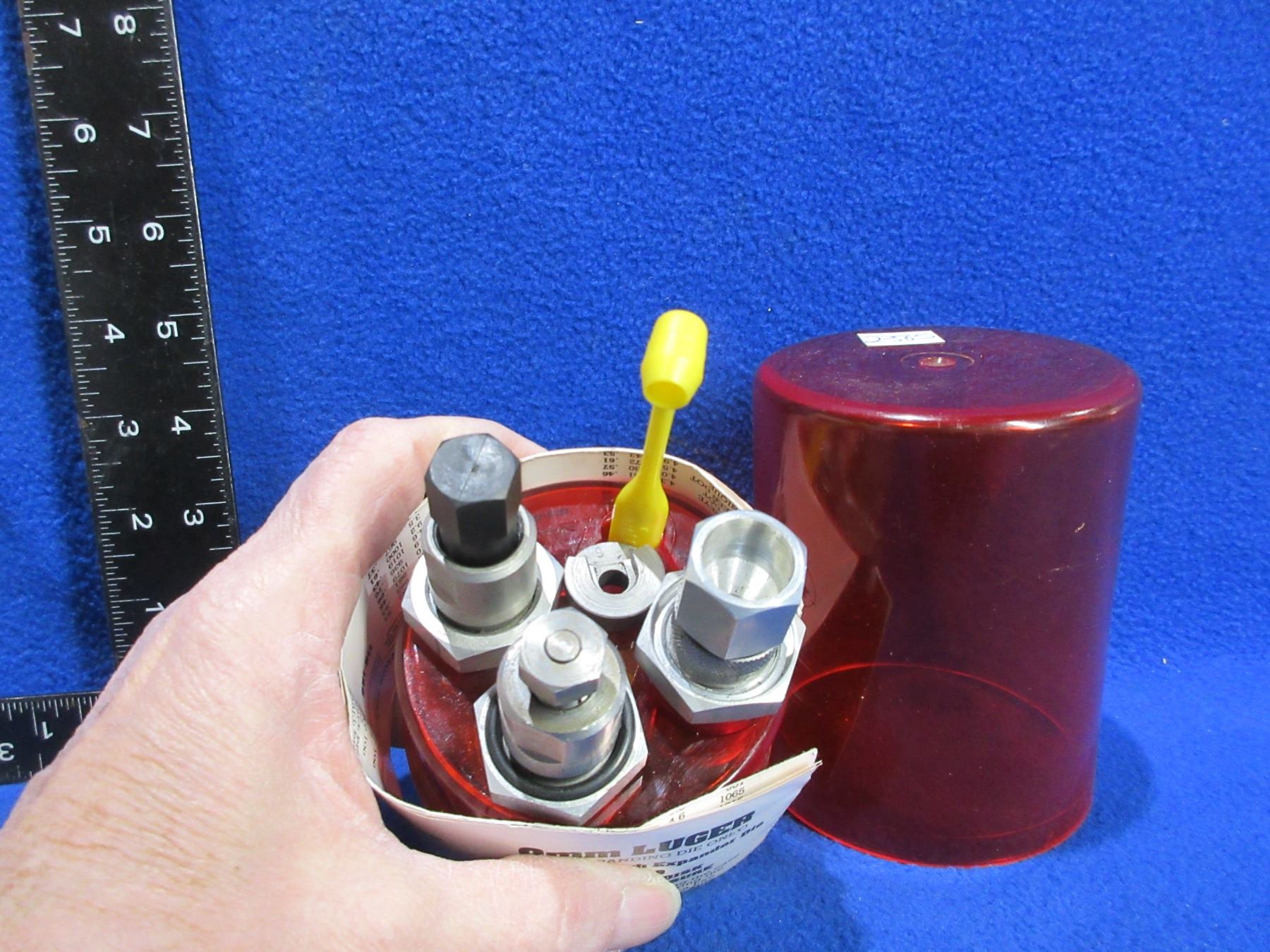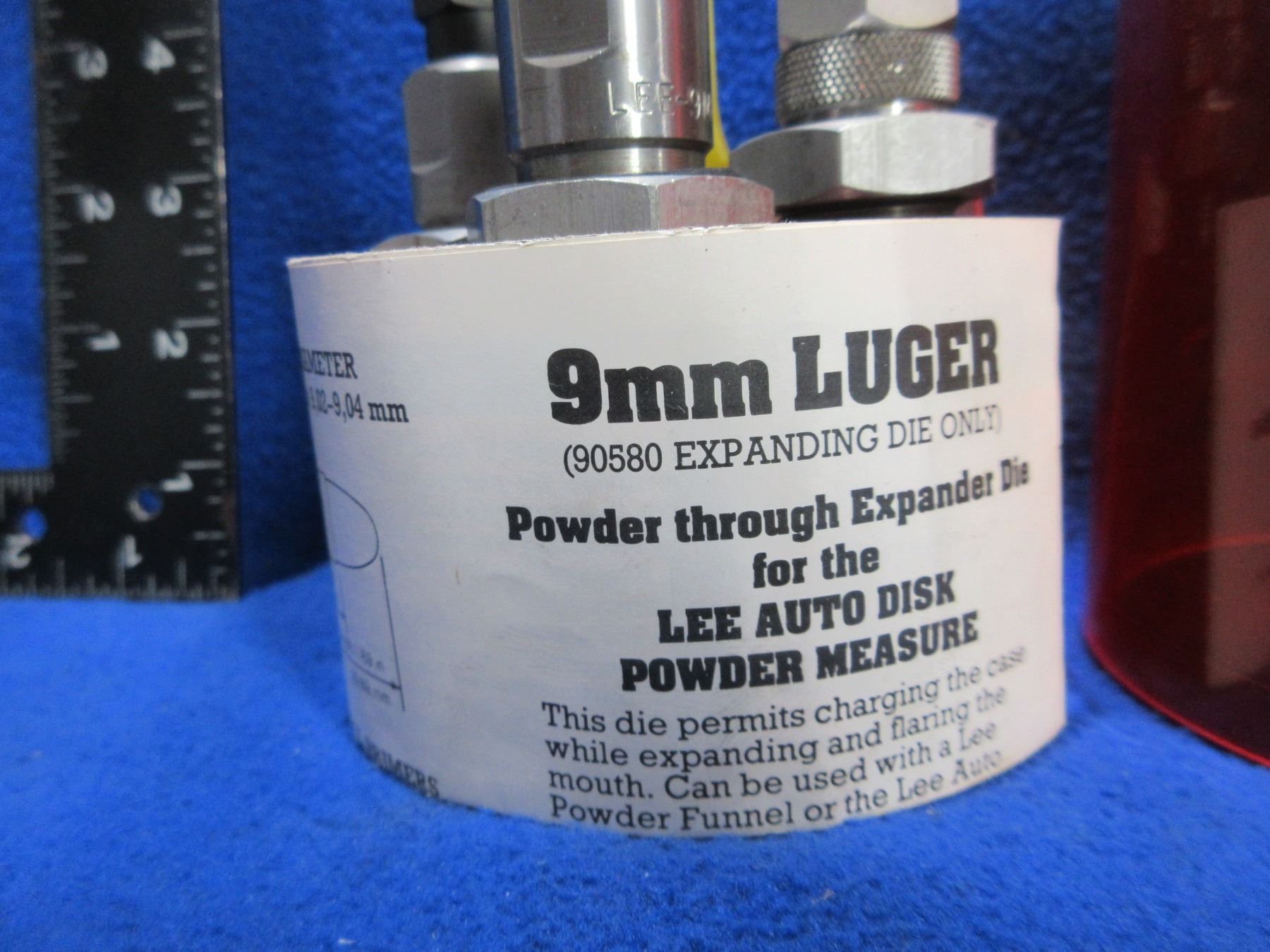 Lot 2385 Lee 9MM Luger Carbide 3 Die Set with Shell Holder # 6 and Powder Measure