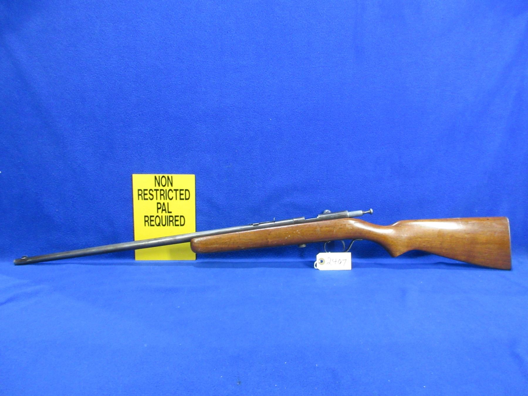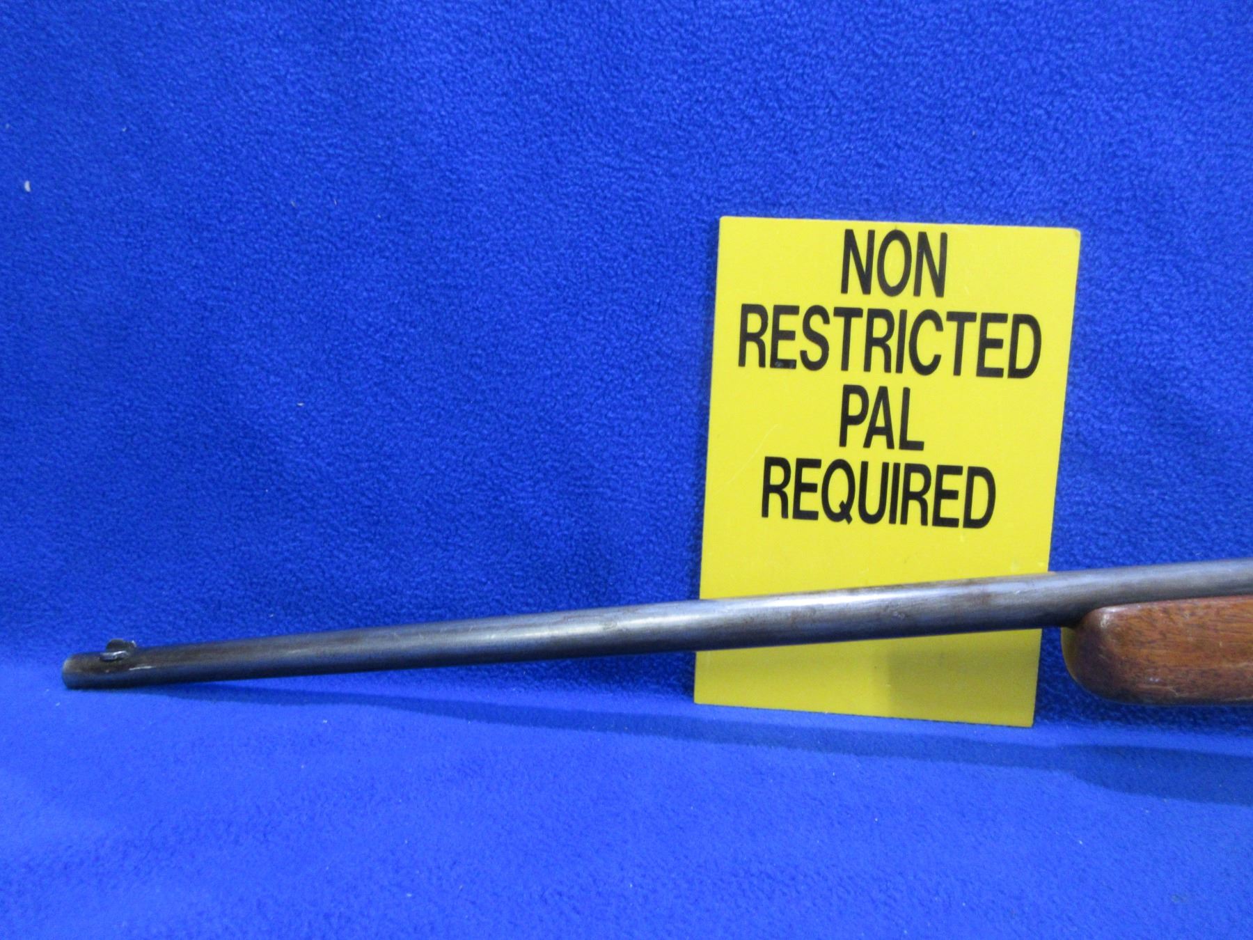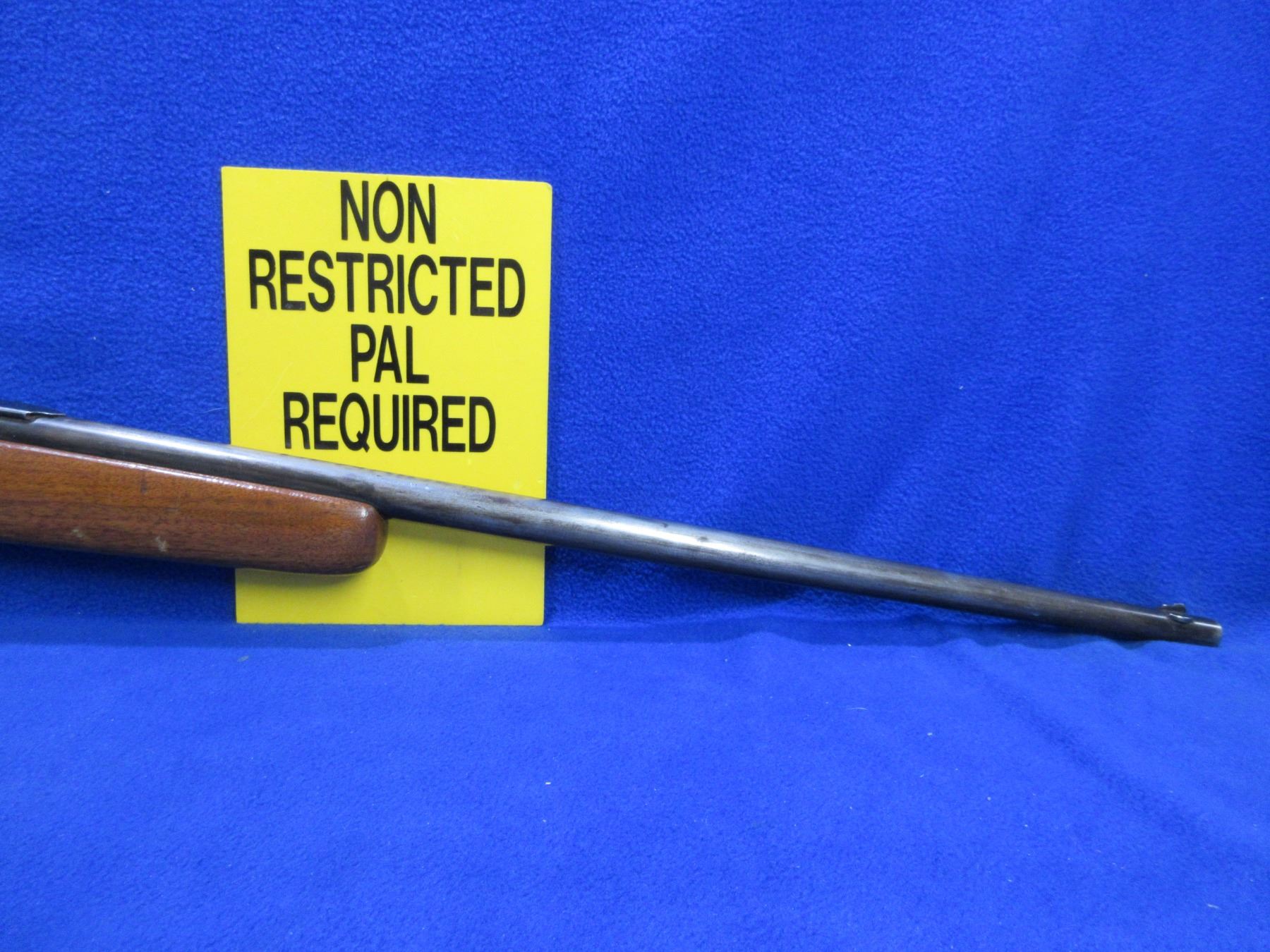 Non-Restricted - Cooey Model 39? Single Shot in 22 Cal. - This is a single shot bolt action rifle, action appears to be in good to very good working order. Barrel is 24", rifling is good to very good, bluing is mostly grey, has both sights but rear sight is missing the ramp, stock is good to very good with usage marks, length of pull is 13 3/8", metal butt plate good. Ser # None