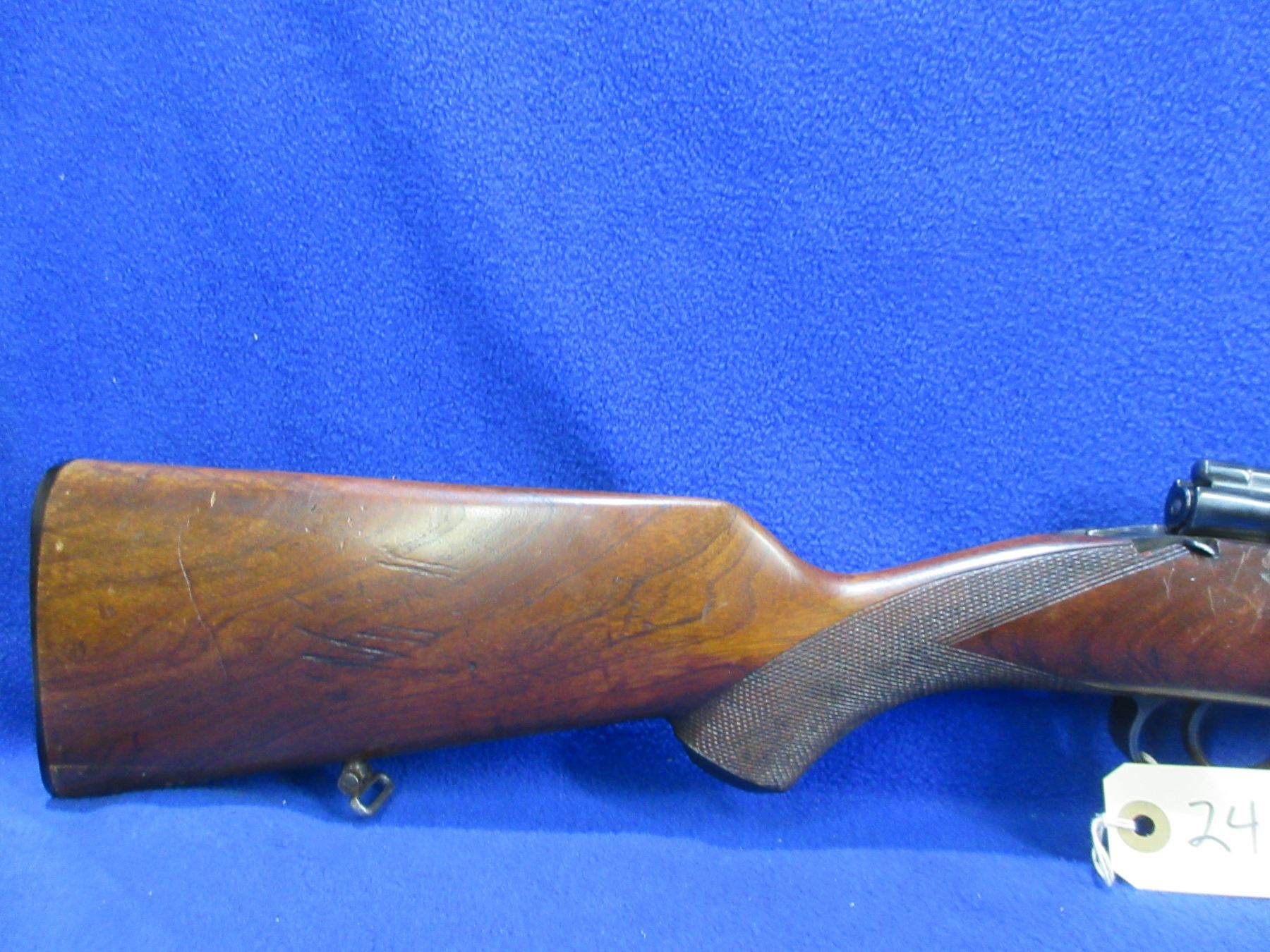 Non-Restricted - Husqvarna Model M96 in 6.5x55 - This is a bolt action rifle with floorplate magazine, action works well but magazine follower twists and pops out as may be incorrect to gun. Barrel is 23 1/2", rifling is good but dark, bluing is good to very good, has front sight, missing rear sight but has Weaver style bases, stock is good but has a crack on the toe, length of pull is 14 3/4", butt plate good, comes with swivels. Ser # 45385