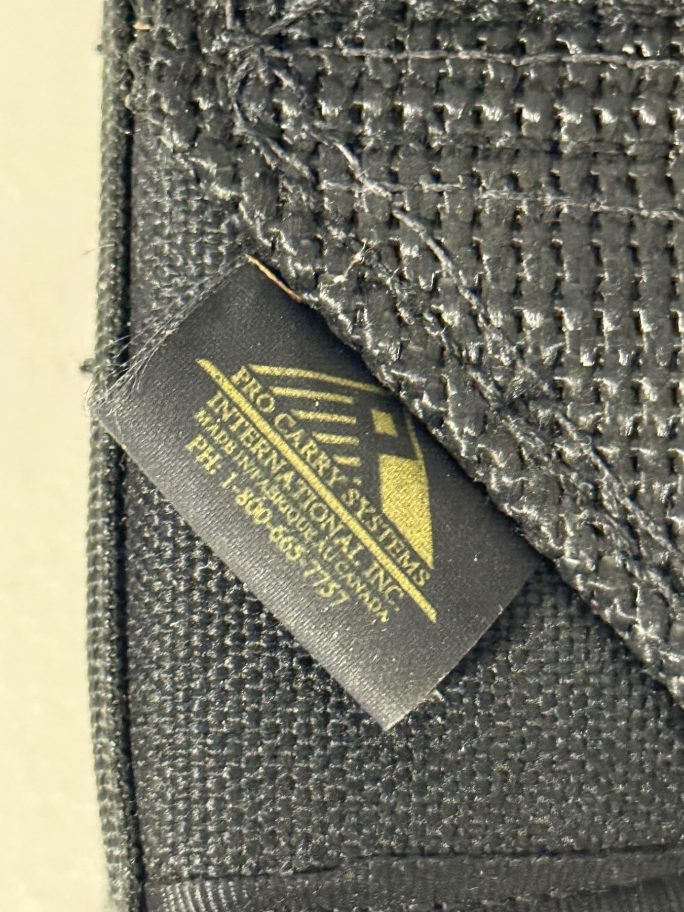 Black nylon belt holster by Pro Carry Systems (International Inc.), made in Canada. Features snap-retention strap and belt loop. Shows damage and fraying on the strap and stitching. Sold as shown.