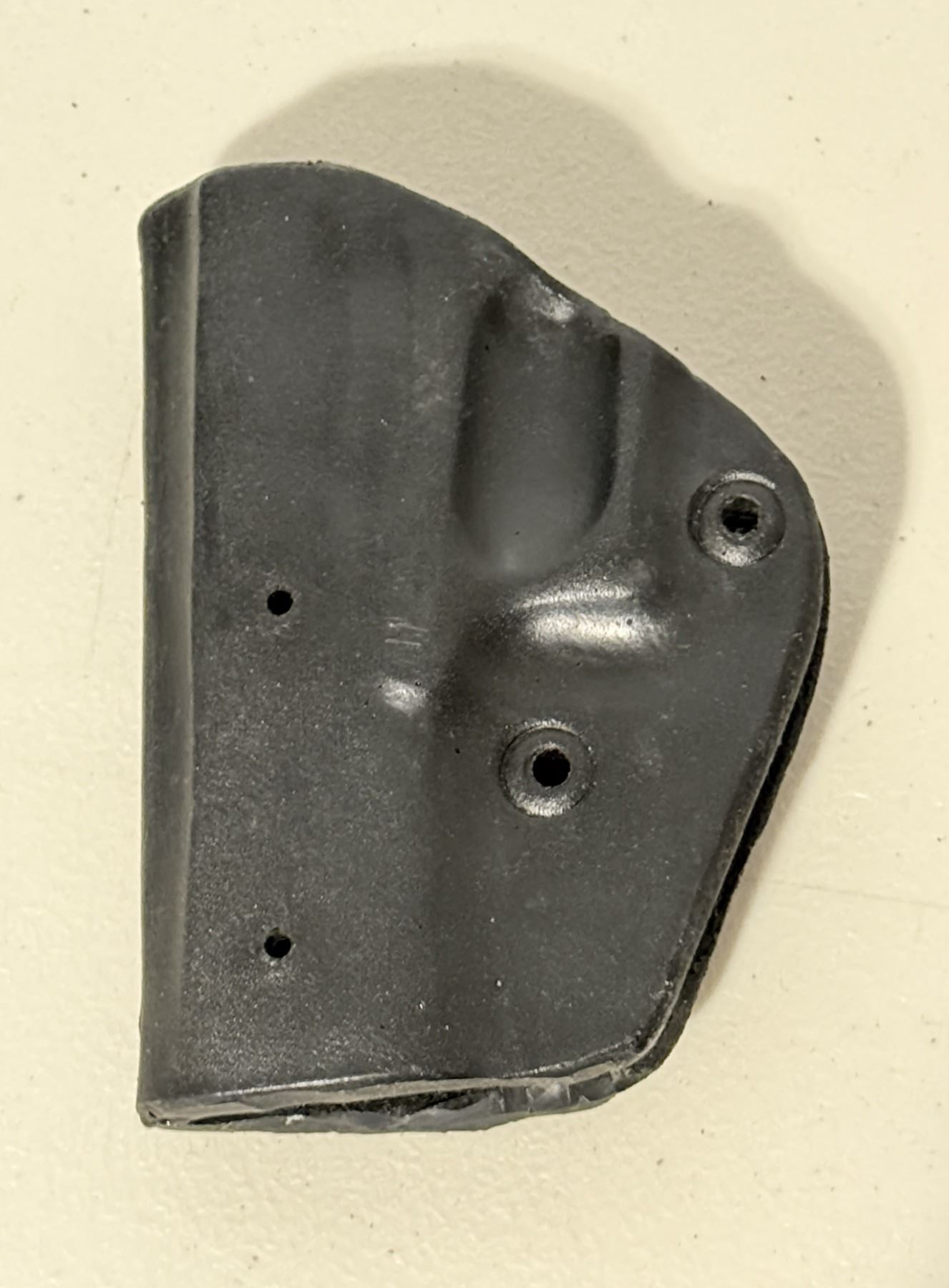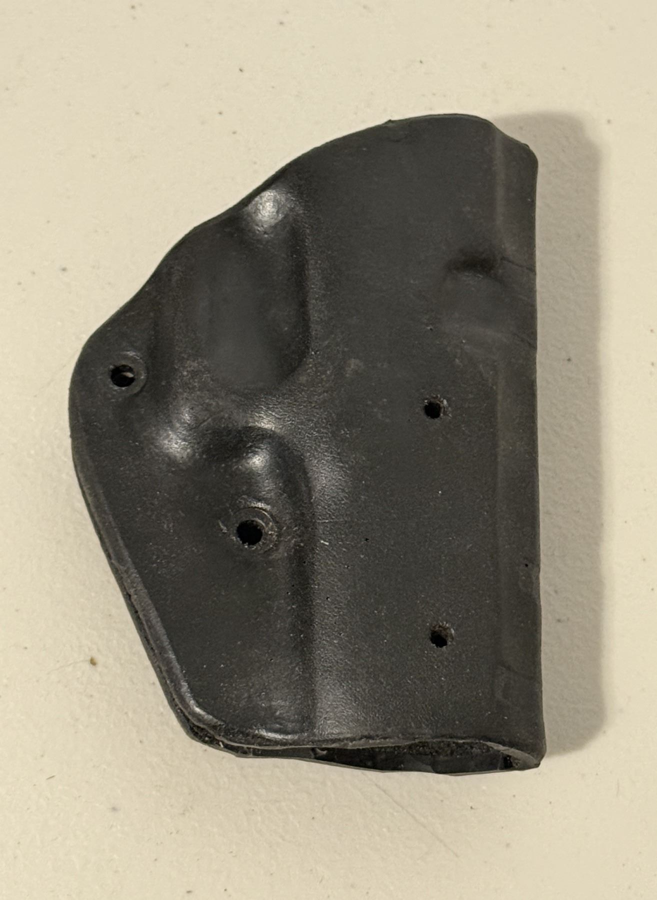 Black molded handgun holster shell. Rigid construction with multiple mounting holes for belt clips or mounting hardware (not included). Solid and intact with no cracks. Suitable as a replacement shell or project holster. Sold as shown.