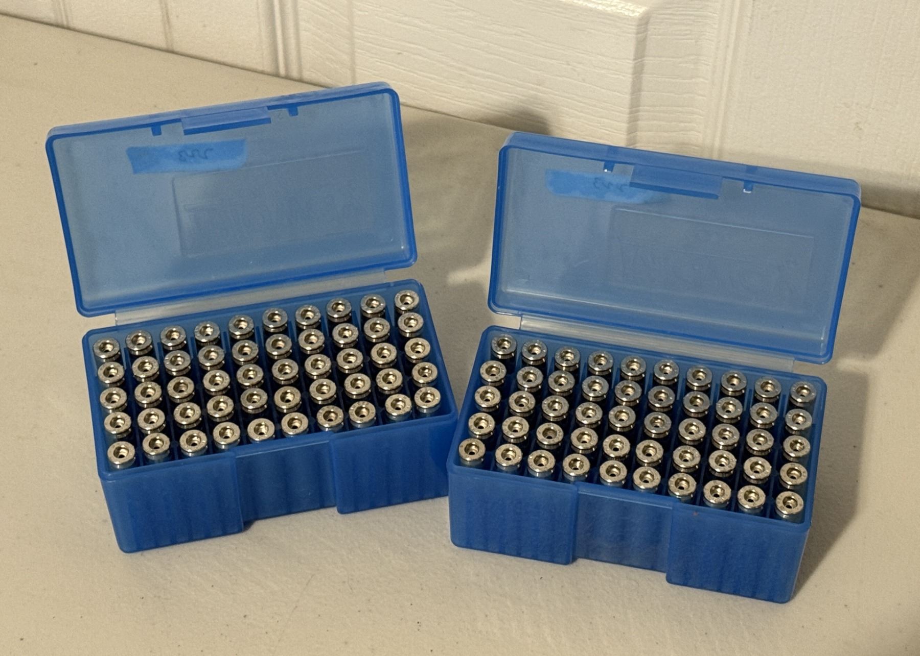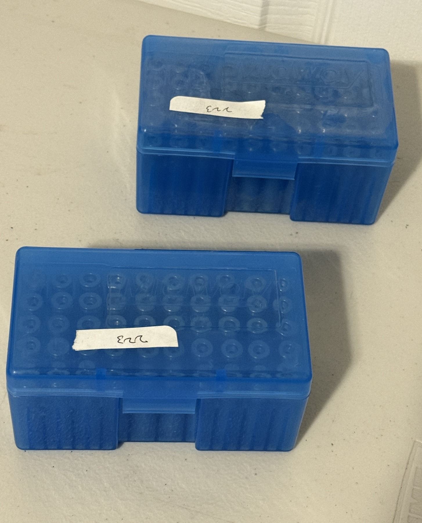 Two blue ammo boxes filled with clean .223 Rem brass. Appear uniform and well cared for. Ideal for reloading. Sold as shown.