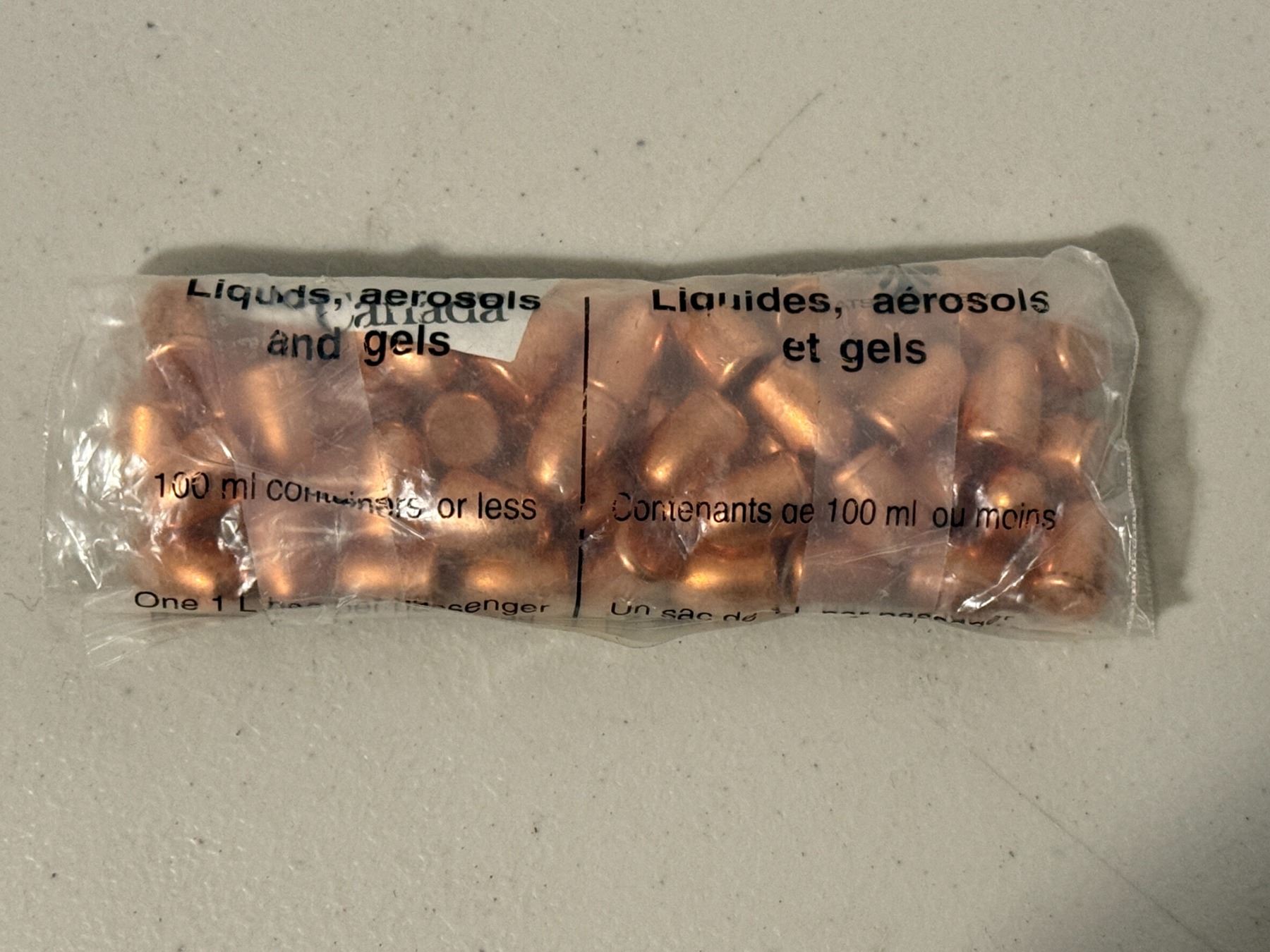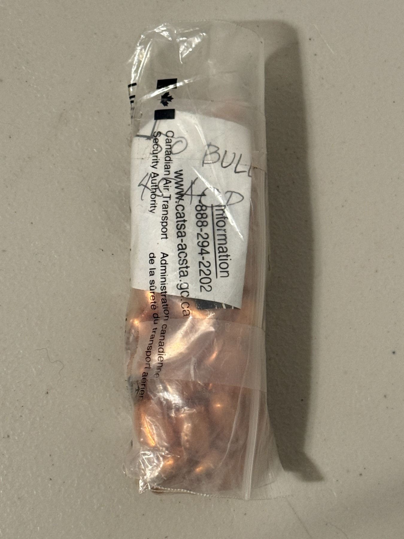 Lot of approximately 45 copper-colored bullets/projectiles. Caliber unspecified. As pictured. Sold as-is.