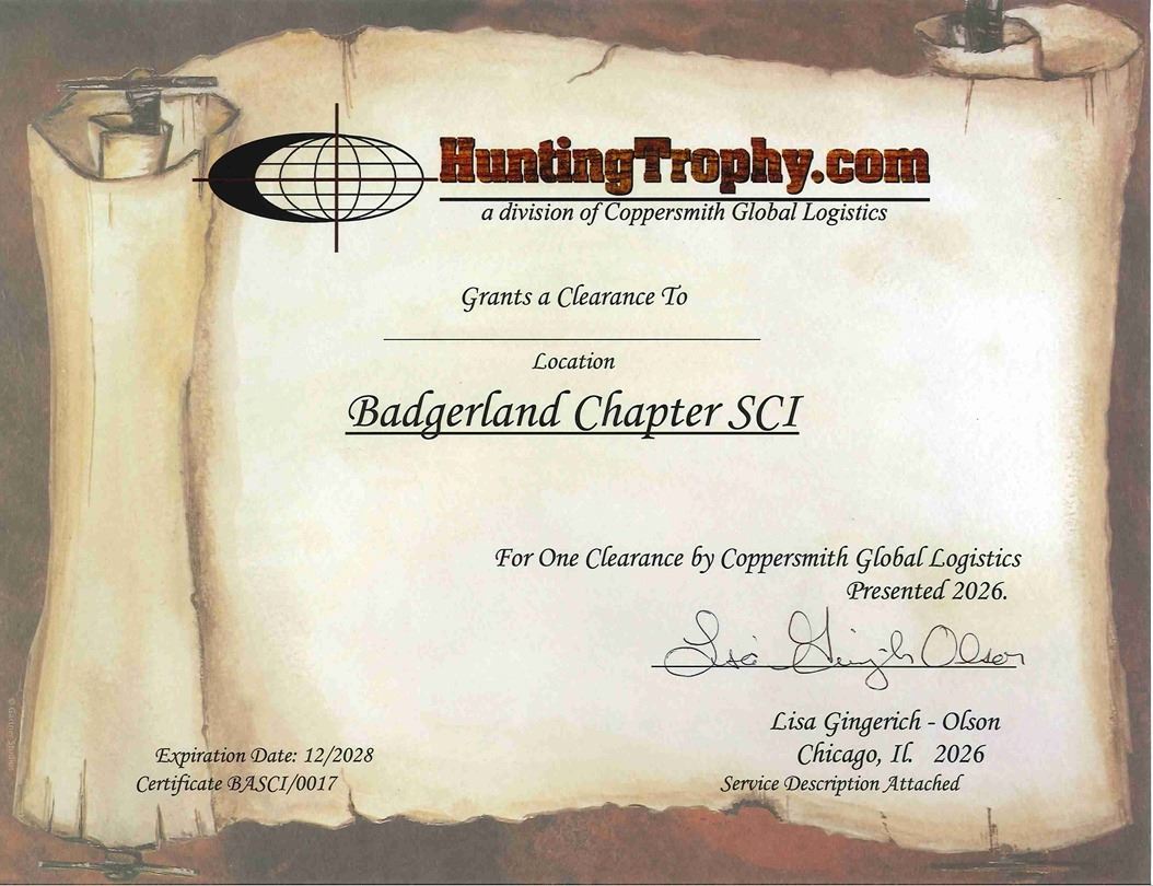**Exhibitor** Coppersmiths/HuntingTrophy.com has donated 1 customs clearance Fee. Includes: Classification of merchandise, preparation and transmission of entry information to U.S. Customs and Border Protection for cargo release and summary presentation. FWS entry preparation and filling E-decs entry to US Fish & Wildlife for release processing. CBP Agriculture - document submission, Inspection and clearance. $400.00 USDA Animal Plant health Inspection Servise (Aphis) Fee. Fee for mandatory filling of all animal products in ACE for Aphis review & release. Fee is Per Genus and species. First 4 animals $25 + Additional $3.00 per animal thereafter.$25 : Servise fees for our messenger to hand deliver all documentationto and from the variousgovernment agencies and airline terminals. $40.00 Coppersmiths Warehouse Handling Fee: Unloading, handling, Inspection of freight, loading of freight for customer pickup or delivery by carrier. Additional storage charges of $25 per week may be applied after given free time. $65.00 Value: $530.00 100% Donation www.coppersmiths.com lgingerich@coppersmiths.com