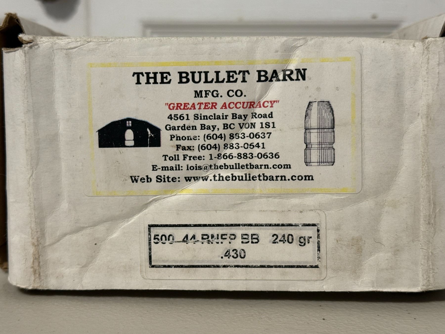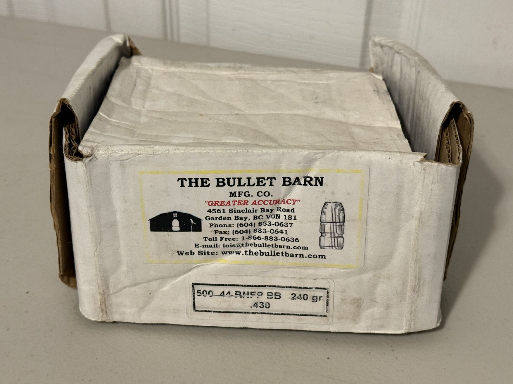 The Bullet Barn .44 caliber (.430) cast lead bullets, 240gr. Large quantity in original box (approx 450 pcs). As pictured. Sold as-is.