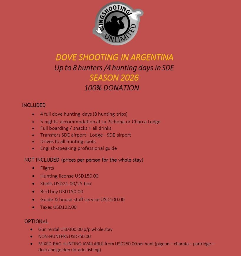 Wingshooting Unlimited has donated a massive dove shoot for 8 shooters in Argentina. This is a 4-day (8 shoots) trip that includes 5 nights of accommodations at La Pichona or Charca Lodge. Also included are airport transfers (SDE Airport); all meals, snacks and drinks; and accompaniment by English-speaking guides. This voucher is valid for up to one-year from the close of this auction, so grab 7 of your buddies and go to Argentina.