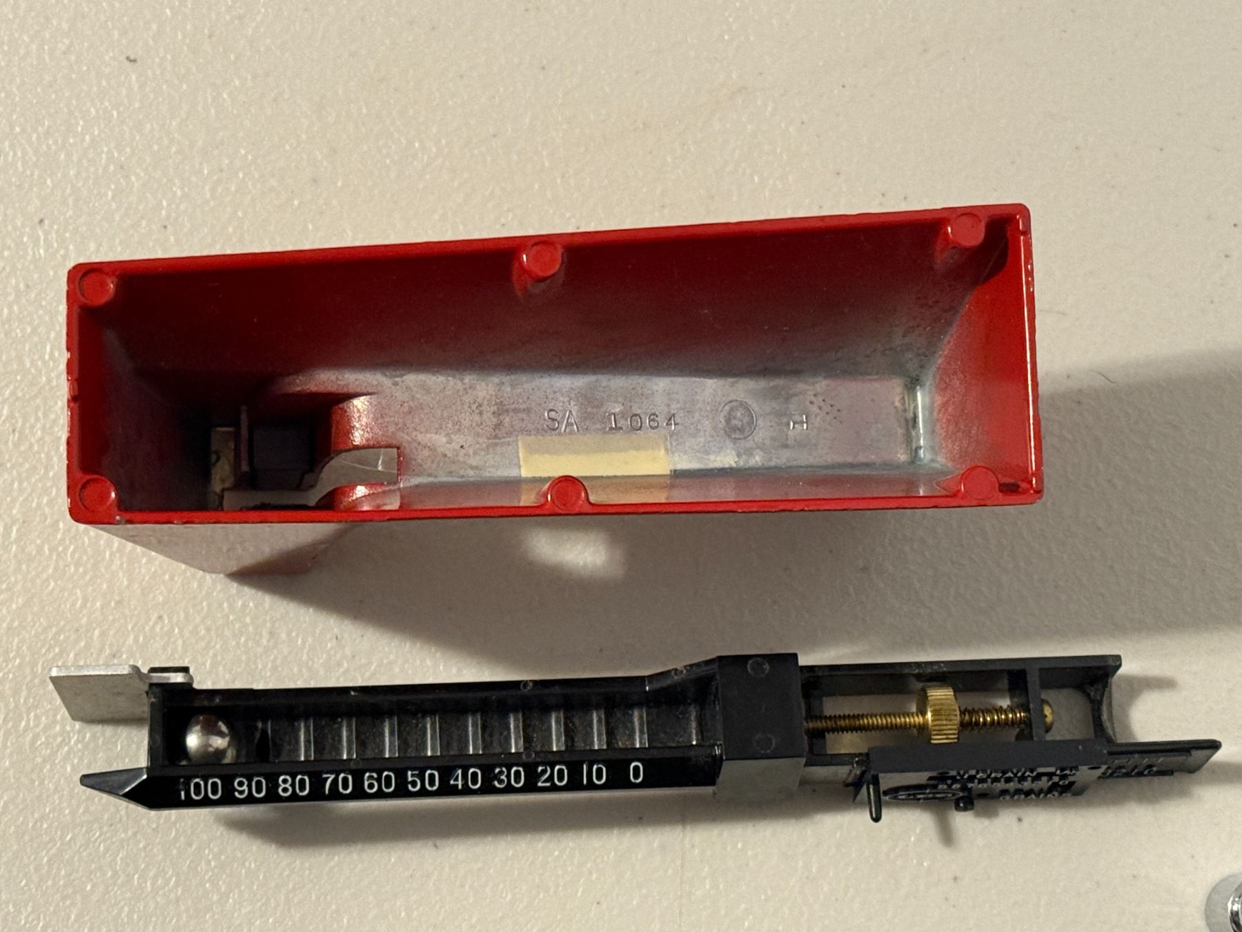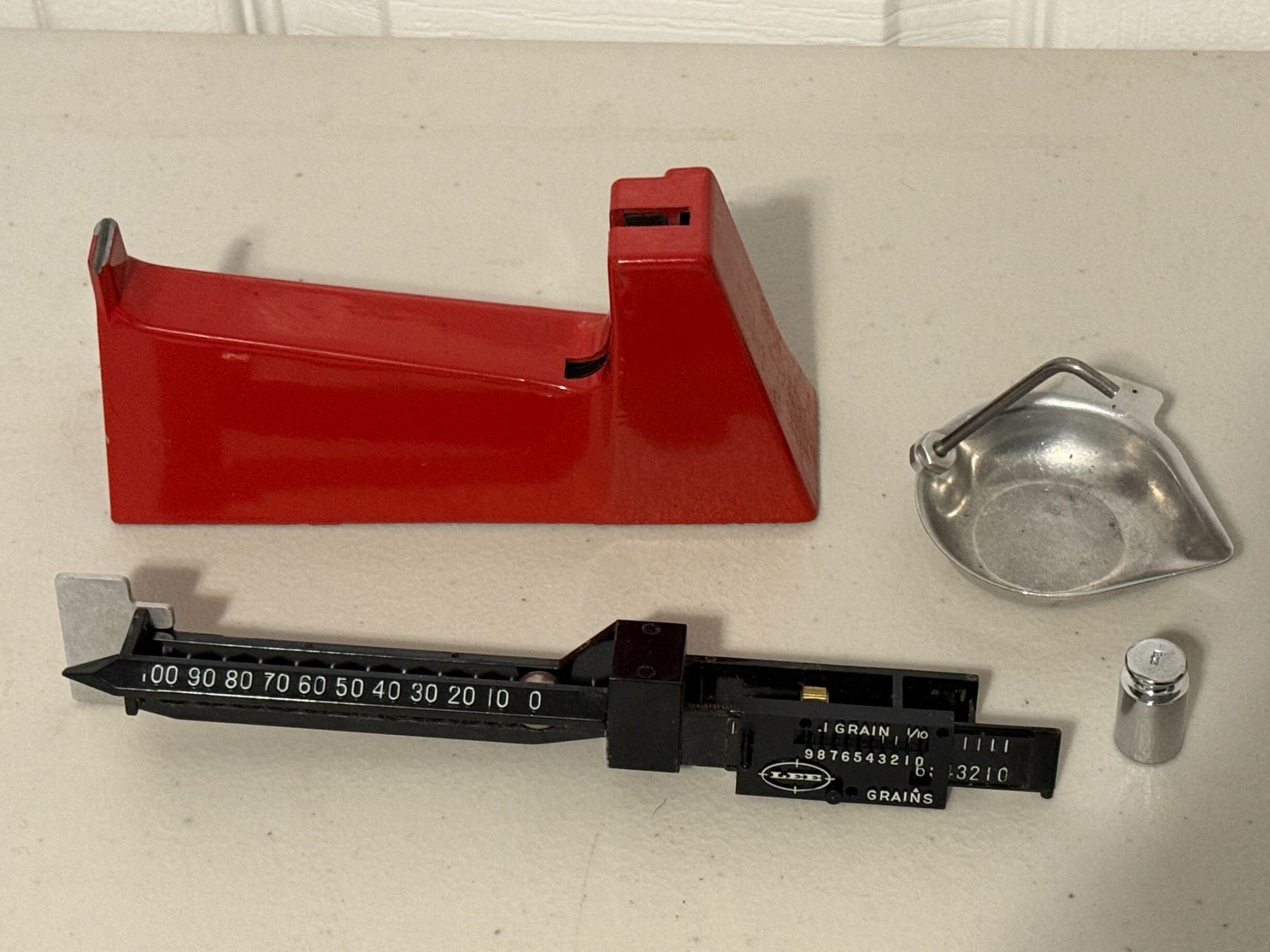 Lee Beam-style reloading powder scale with metal powder pan, check weight, and protective cover. Appears complete. Untested. As pictured. Sold as-is.