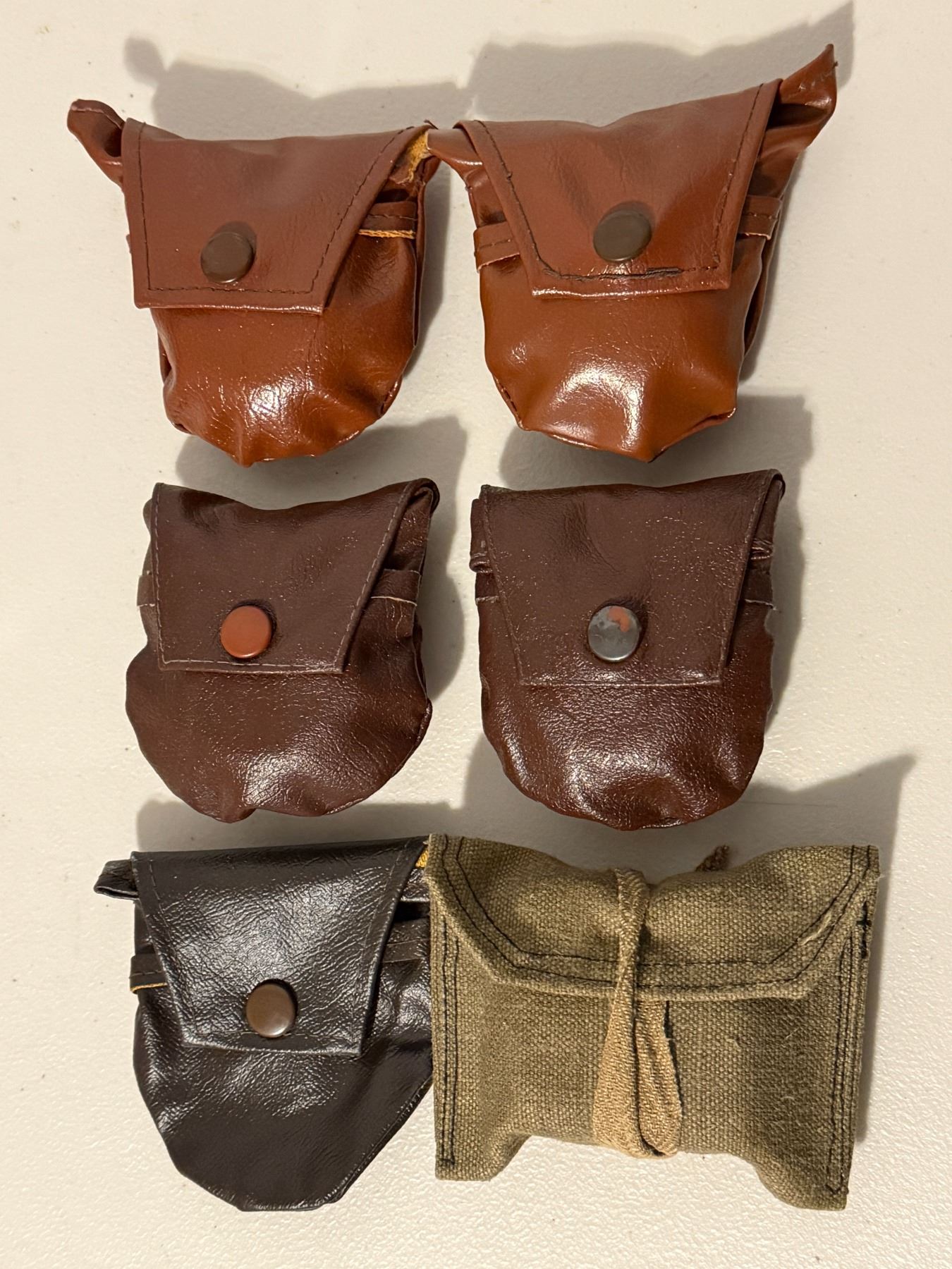 Mixed lot of vintage metal firearm oiler bottles with assorted leather and canvas pouches. Includes single and double-chamber oilers, some wrapped in original wax paper, along with loose tools and accessories. Condition ranges from good to well-used with age-appropriate wear. Ideal for military collectors, restorers, or display. Sold as one lot.
