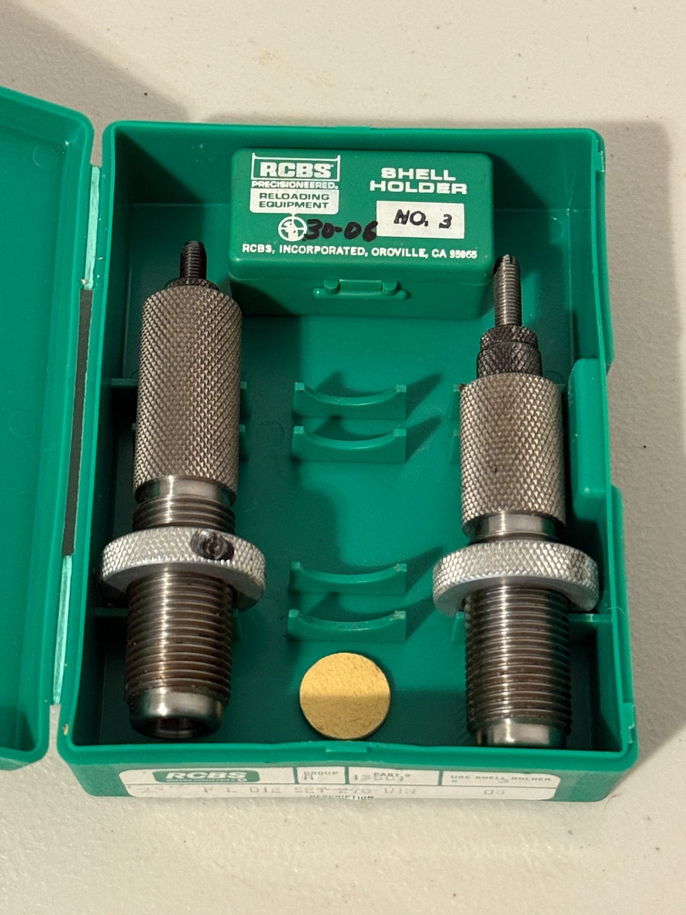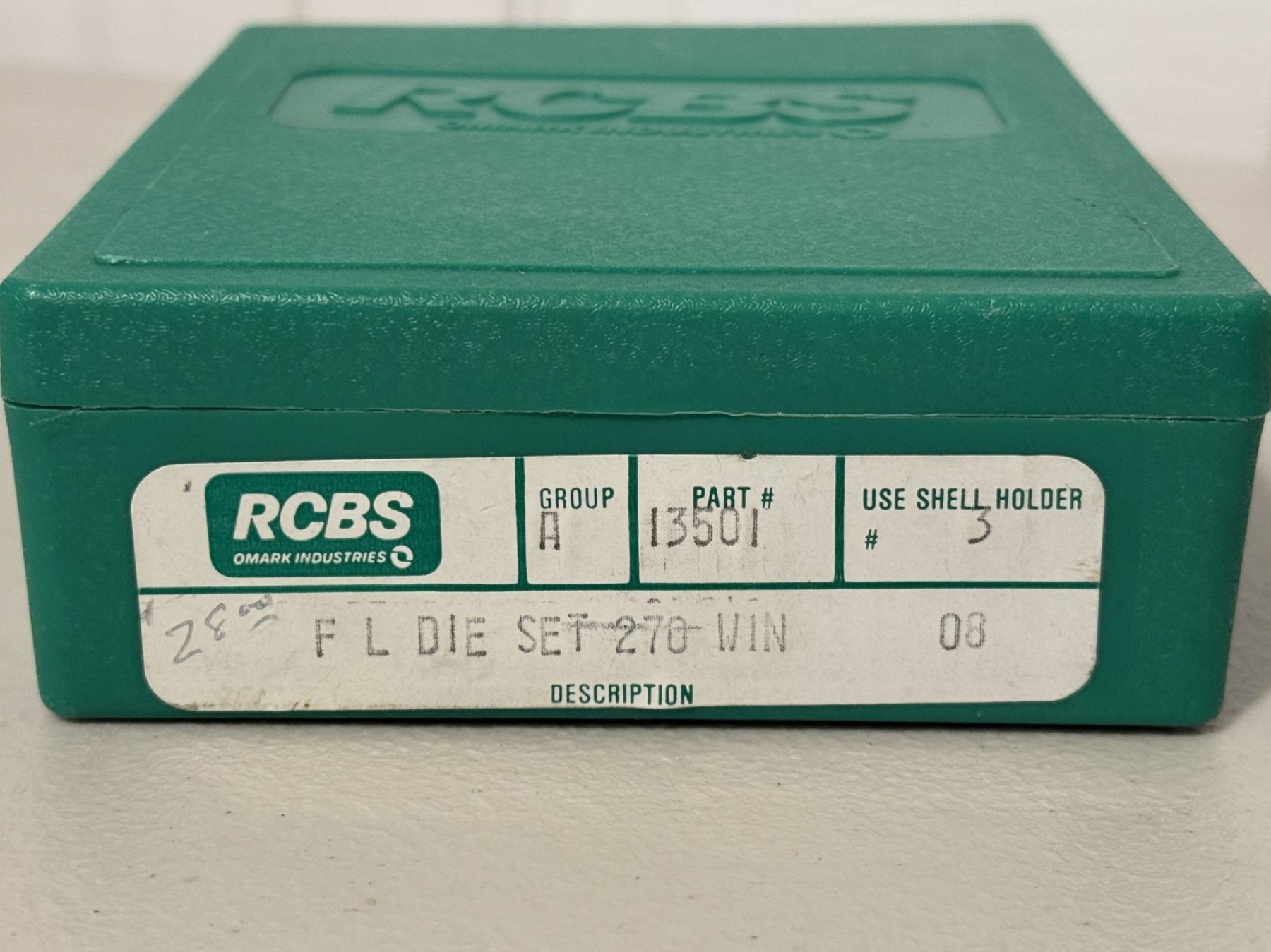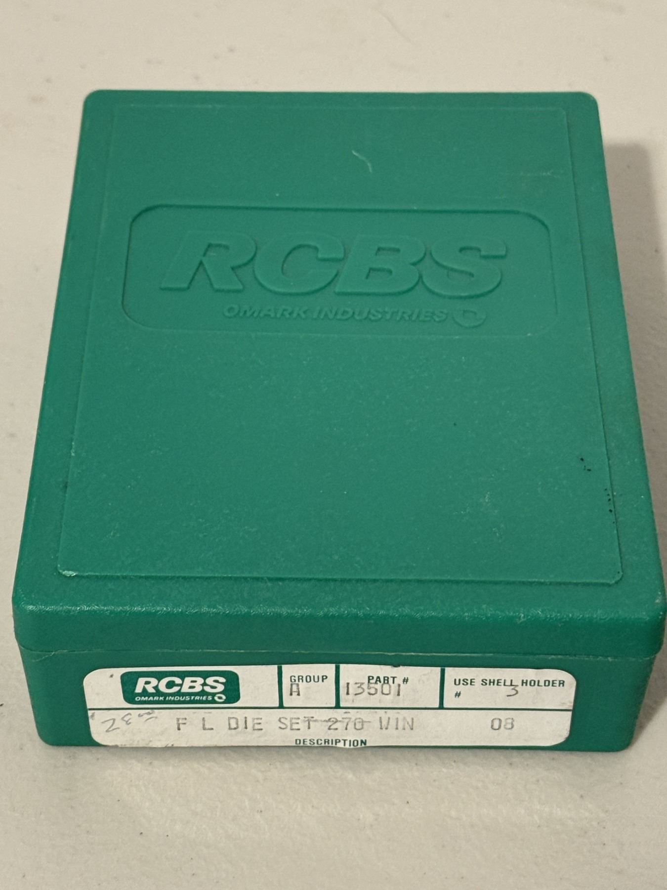 RCBS FL die set for .270 Winchester. Includes dies and shell holder #3. Clean condition, ready for reloading.