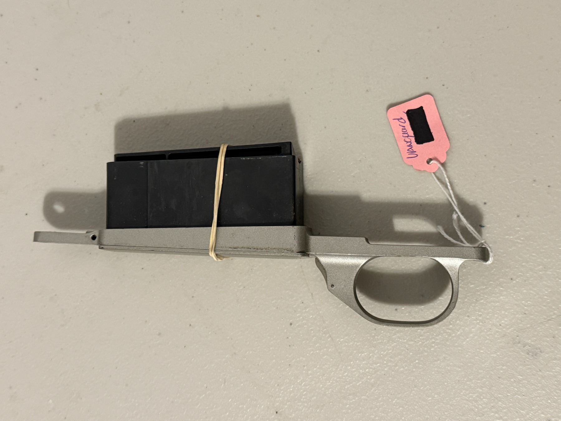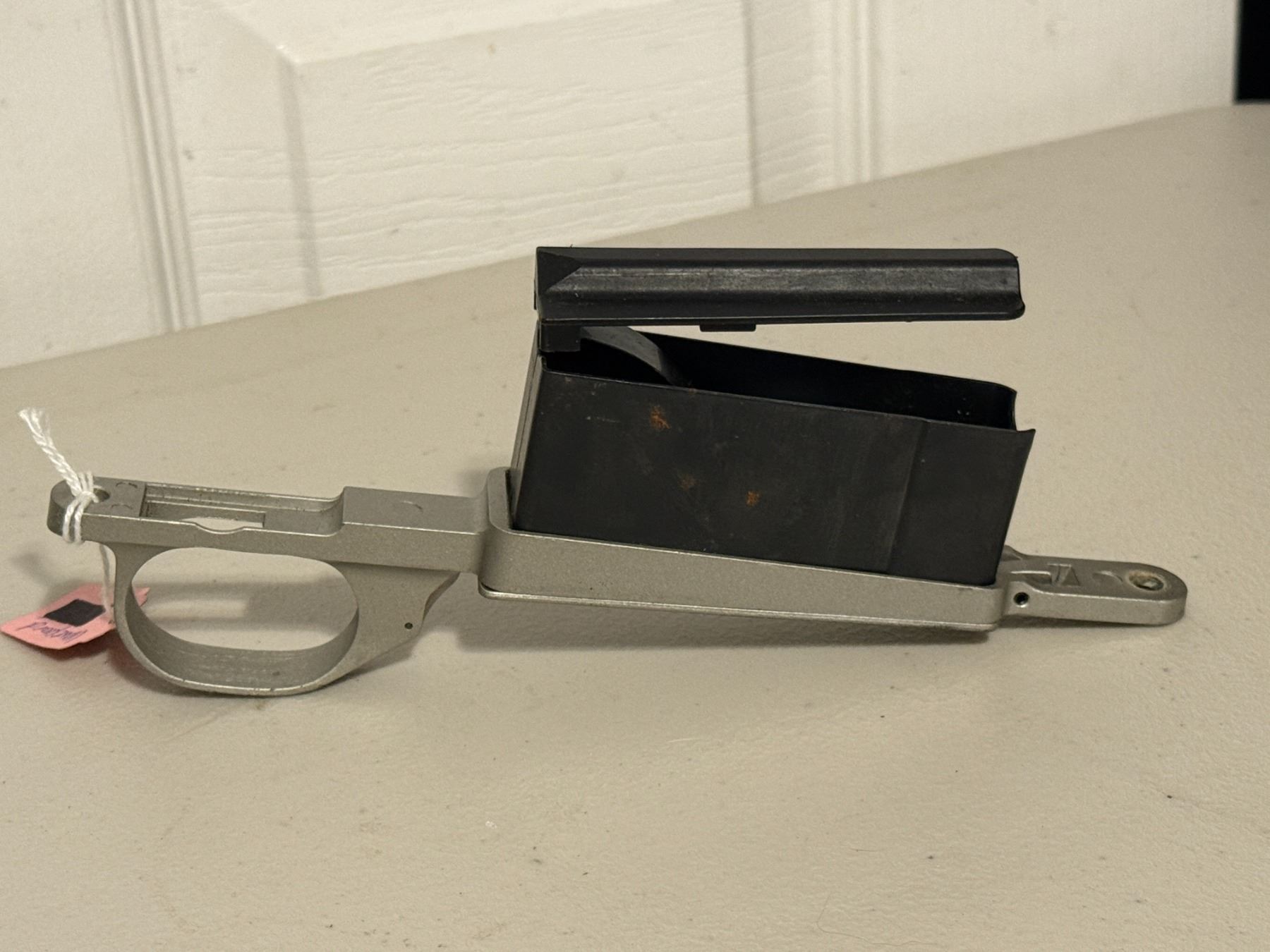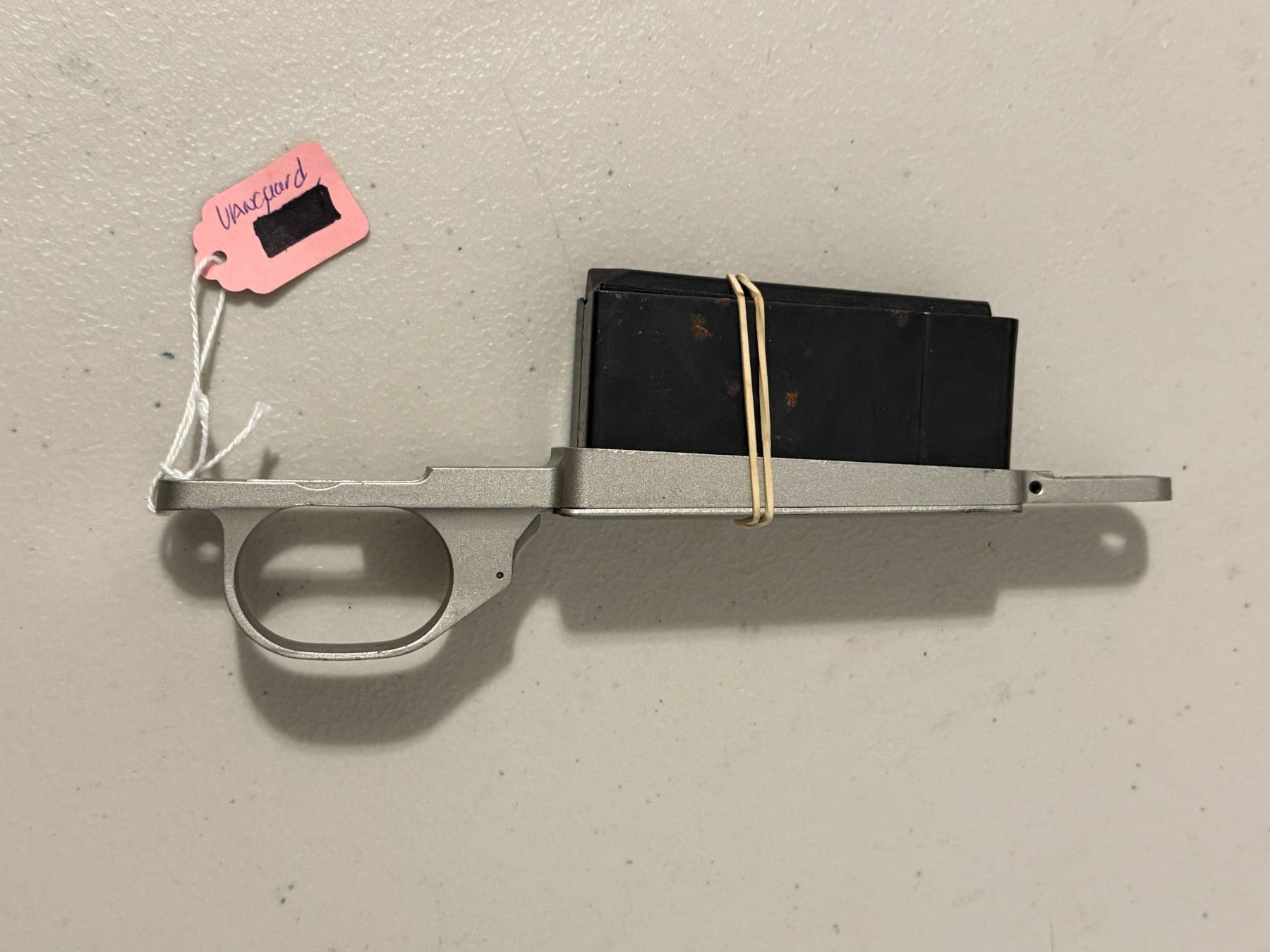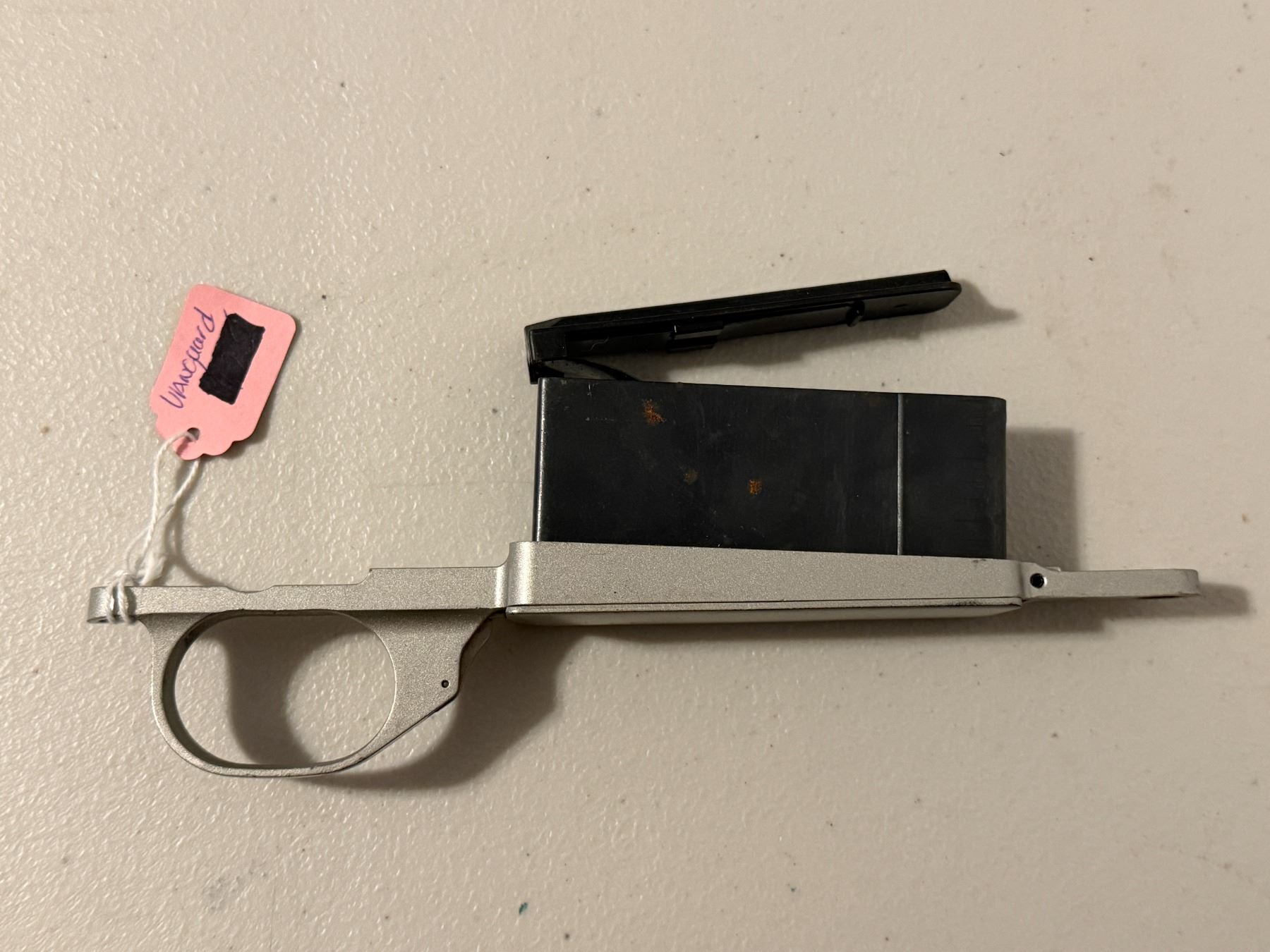 Vanguard firearm action/receiver assembly with detachable magazine. Includes trigger guard and magazine as shown.