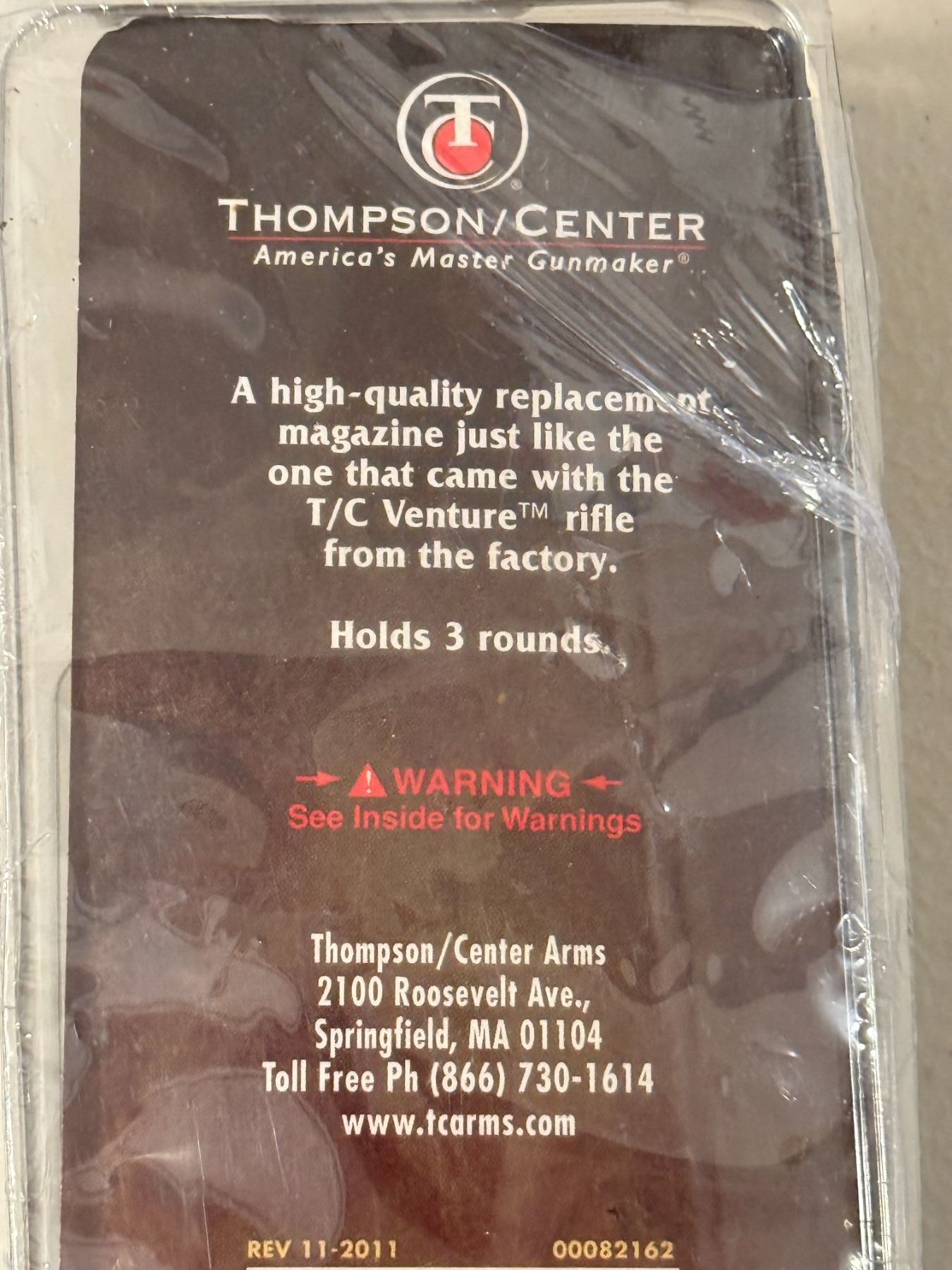 Factory OEM magazine for T/C Venture rifles. Holds 3 rounds. New in original packaging. Made in USA.