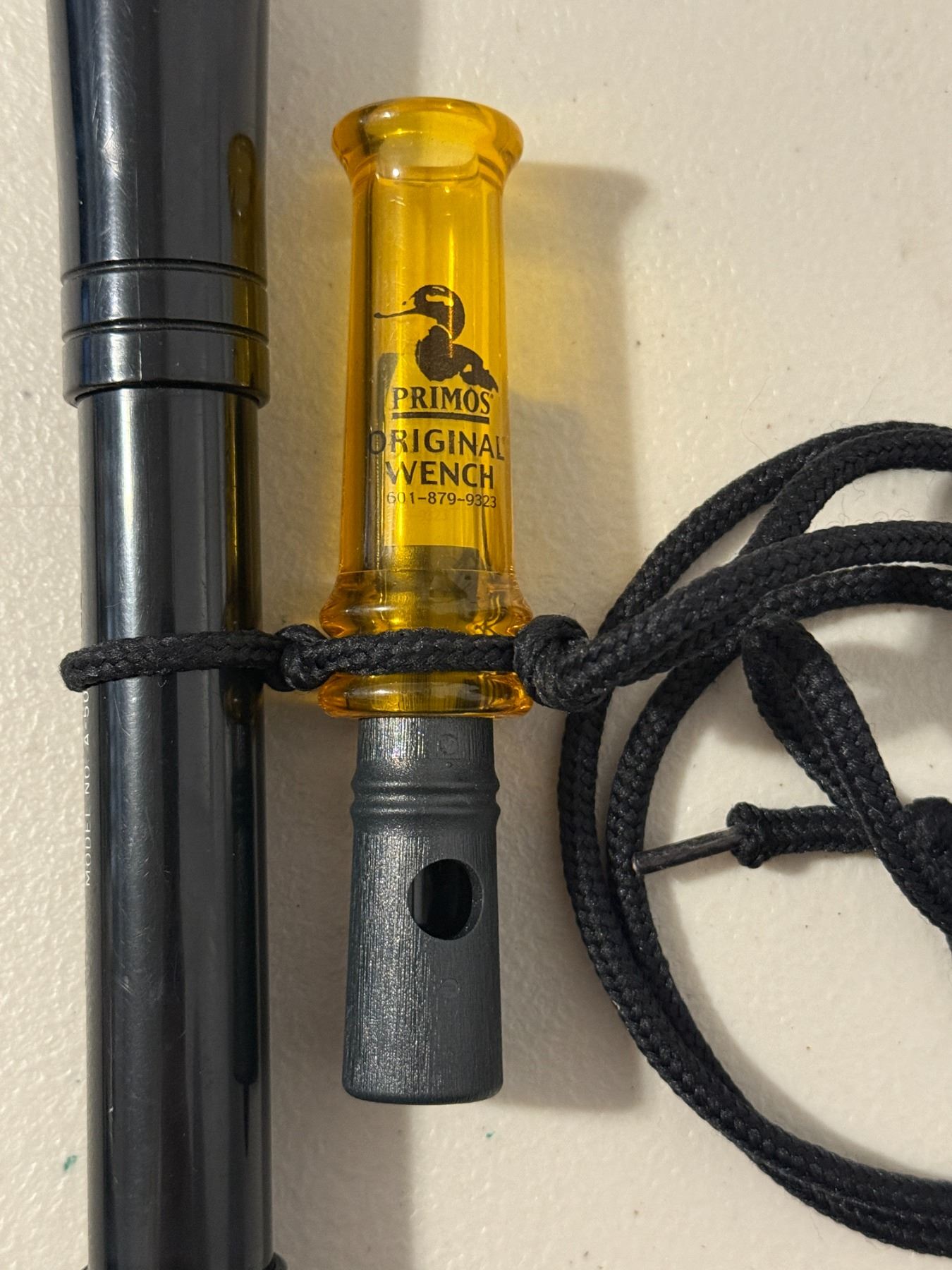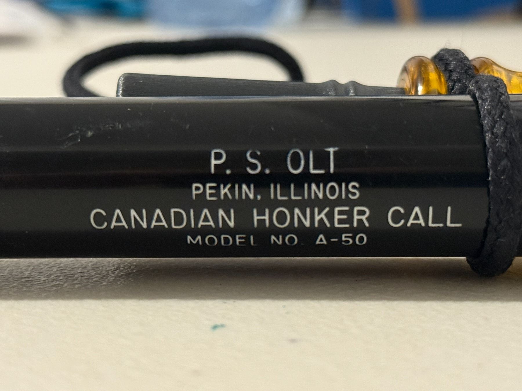 Assorted duck calls including Duck Commander and a P.S. Olt Canadian Honker (Model A-50). Mixed materials and styles. Condition as shown. Great hunting or collector lot.