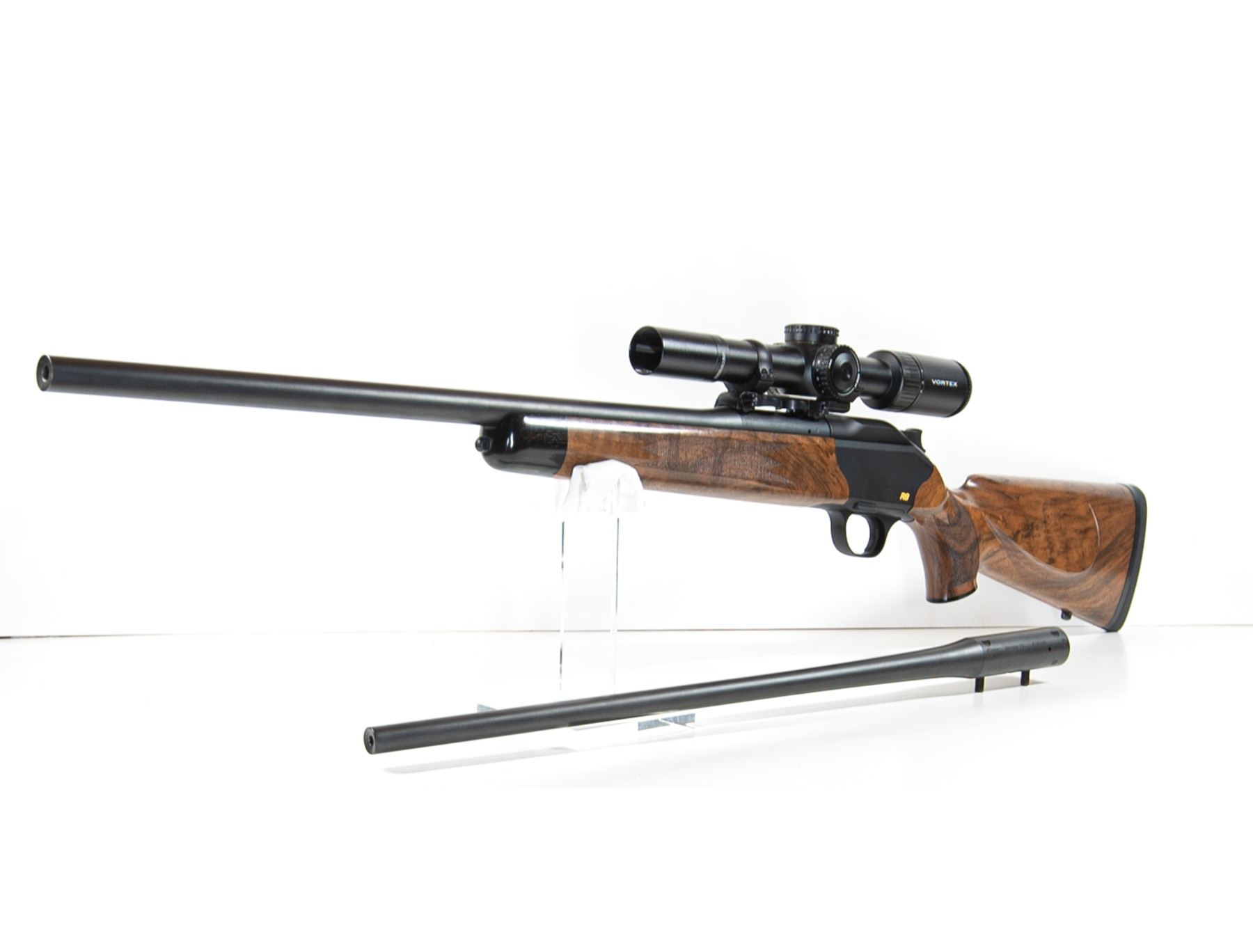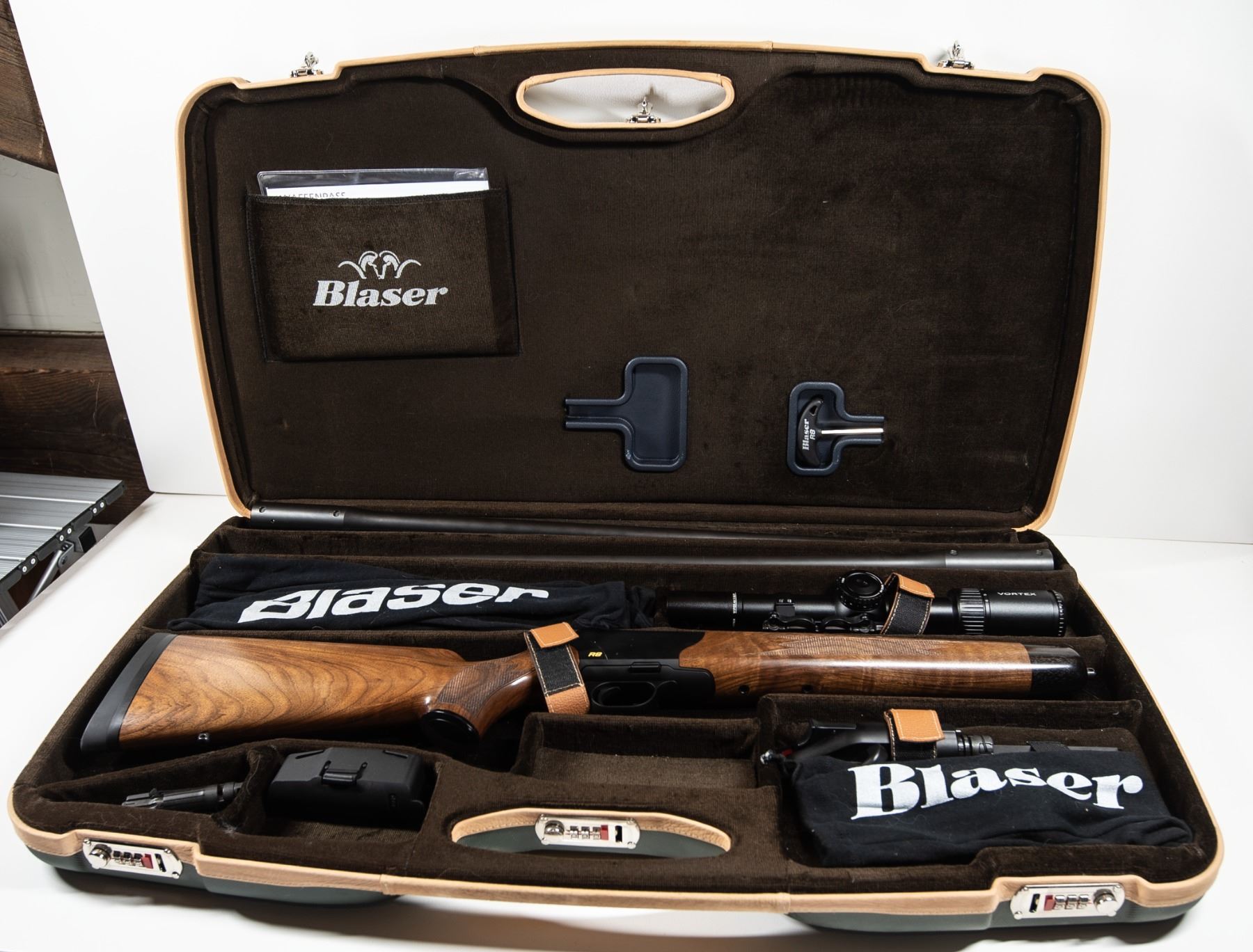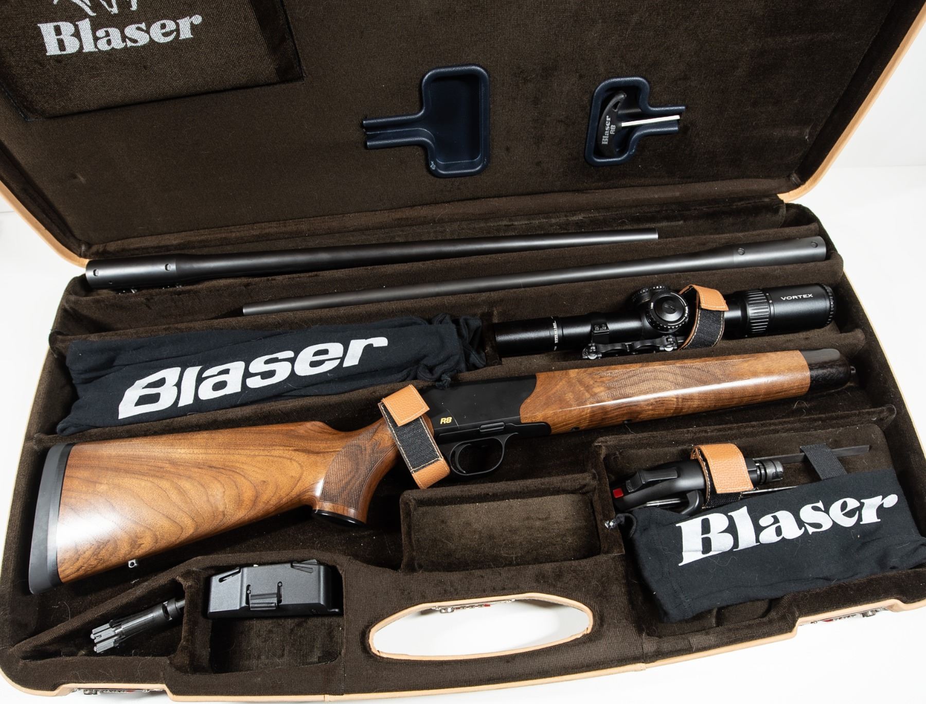 The included Vortex scope is mounted with a quick-detach system, allowing it to be moved between barrels in under one minute while retaining zero. The complete package fits securely into the Blaser hard travel case, which also houses all necessary tools for setup and caliber changes.