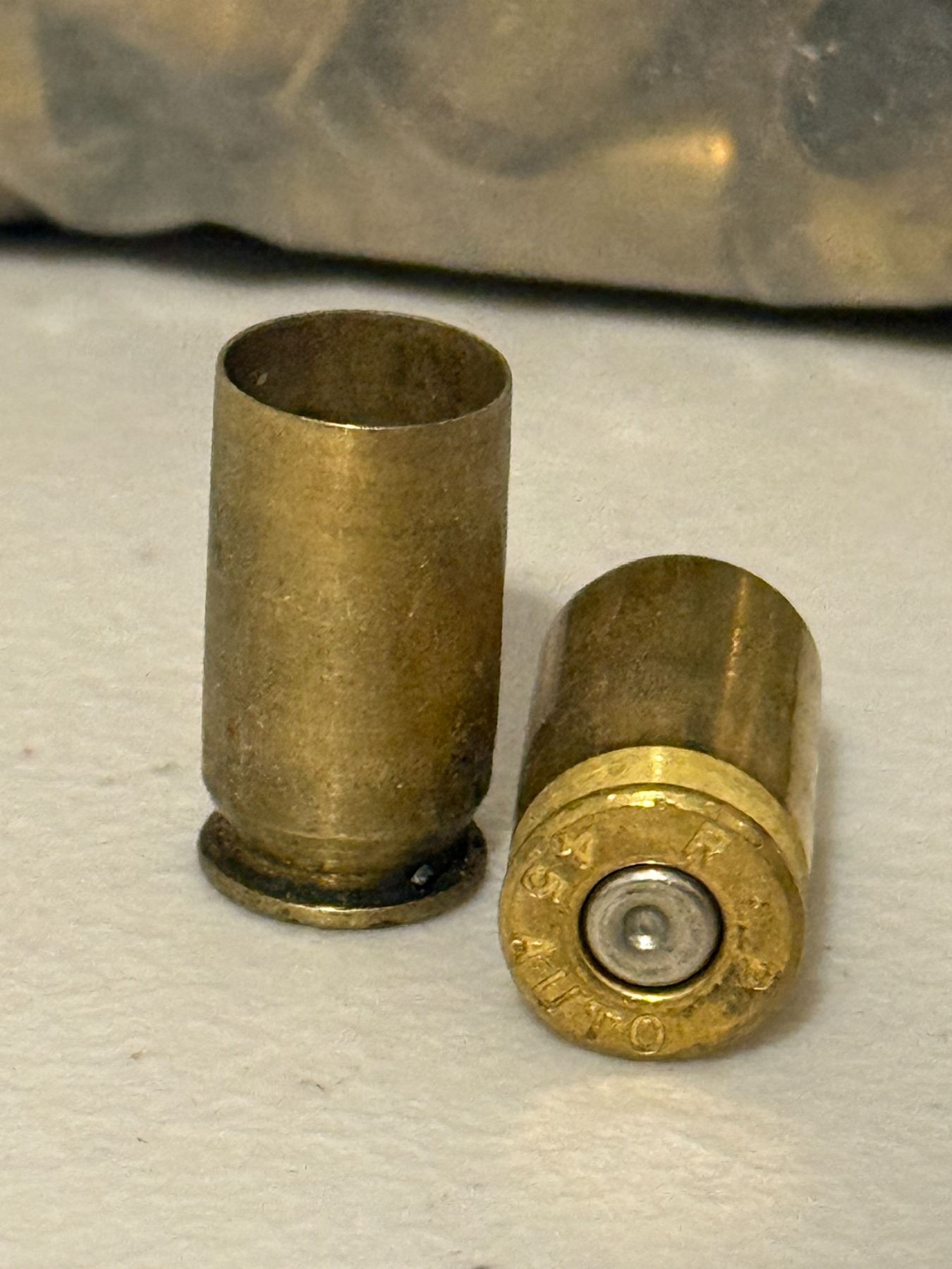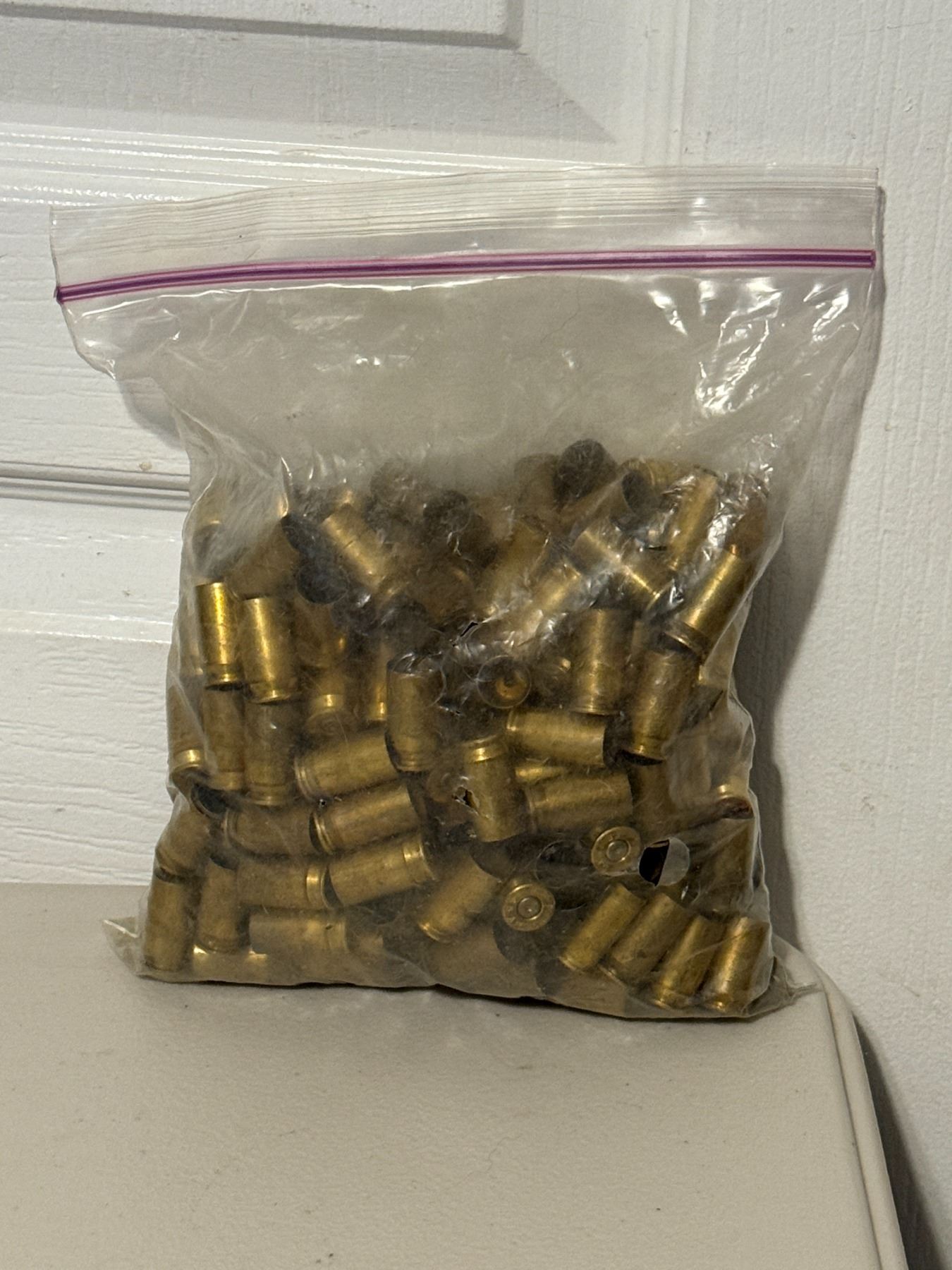 Lot of fired empty brass casings. Appear to be .45 Auto / .45 ACP. Mixed condition, sold as-is. Bag weighs 2.9 lbs. Ideal for reloading or scrap.