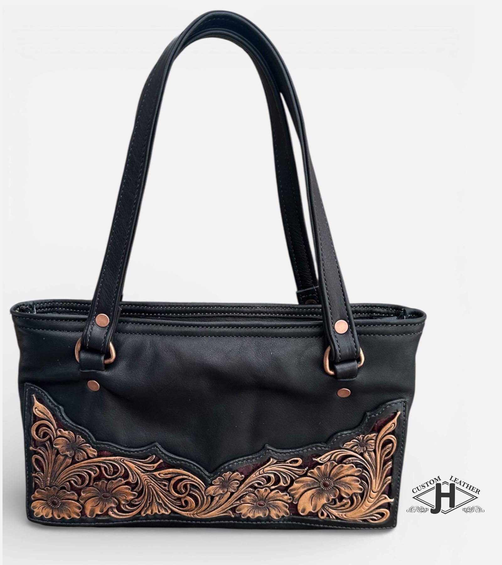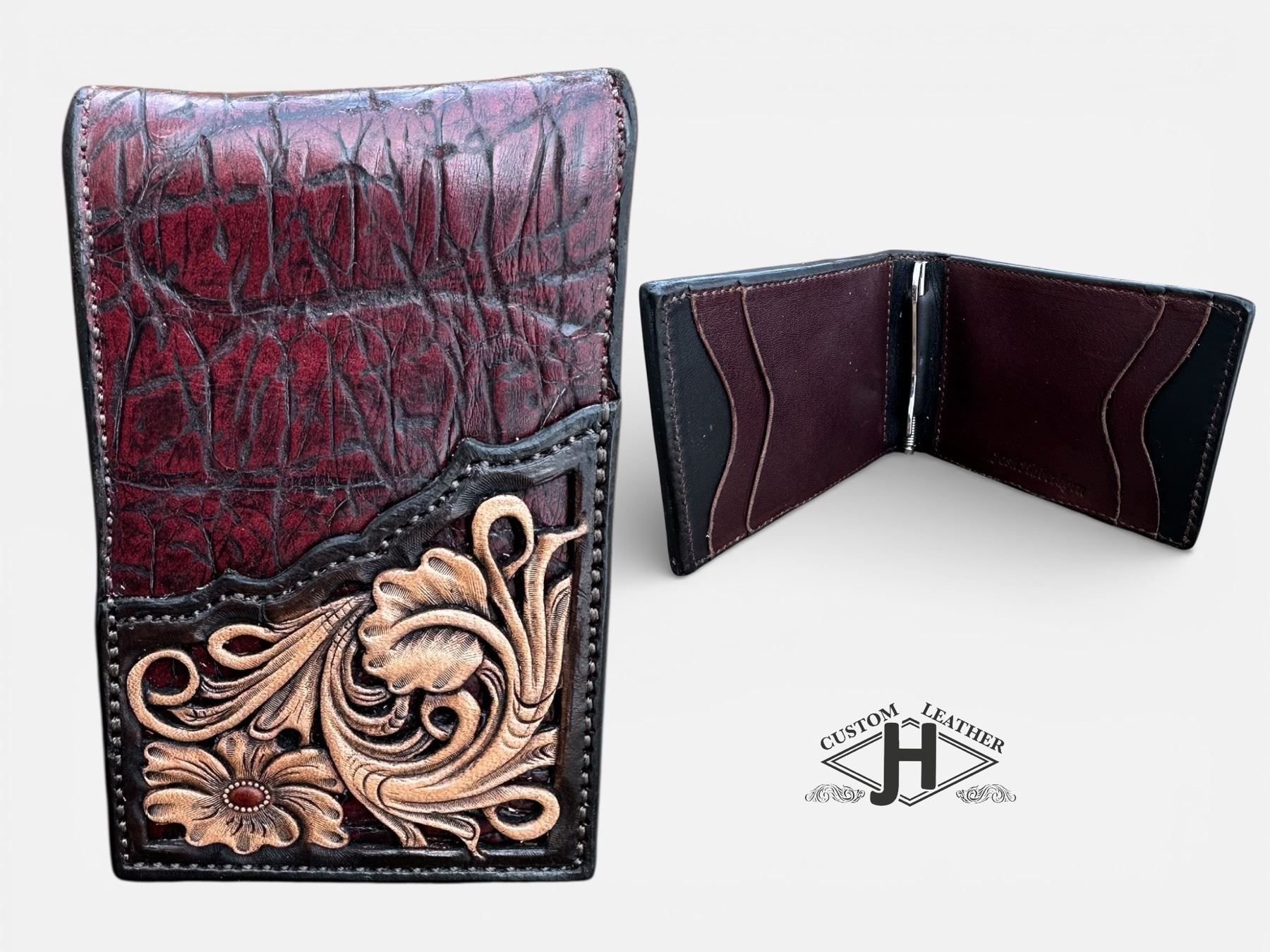 Bring home a truly one-of-a-kind, handcrafted leather set featuring a stunning flower-carved money clip wallet made from premium American leather, paired with a beautifully crafted finely-tooled luxury handbag.These custom pieces were handmade by award-winning chap maker and leather tooler Josh Haberkorn of J-H Custom Leather, based right here in Goodhue, Minnesota. Josh is known for creating premium leather goods rooted in Western tradition, built with unmatched craftsmanship, and finished with timeless style that never goes out of trend.This is a rare opportunity to own a custom handmade pairing you won’t find anywhere else — perfect for the couple who appreciates quality, tradition, and true craftsmanship.