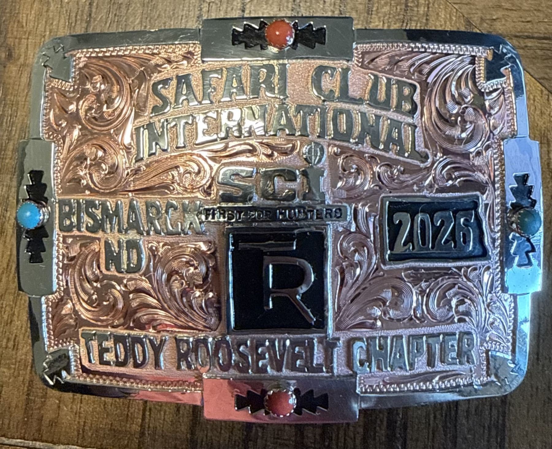 Custom one of a kind SCI Teddy Roosevelt Belt Buckle from Red Bluff Buckles out of New Mexico, and a life membership to Safari Club International.