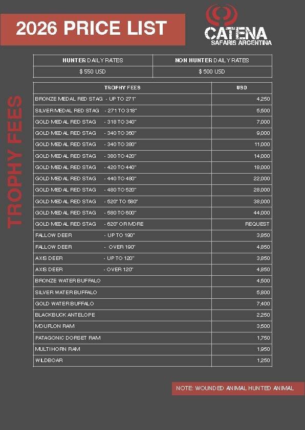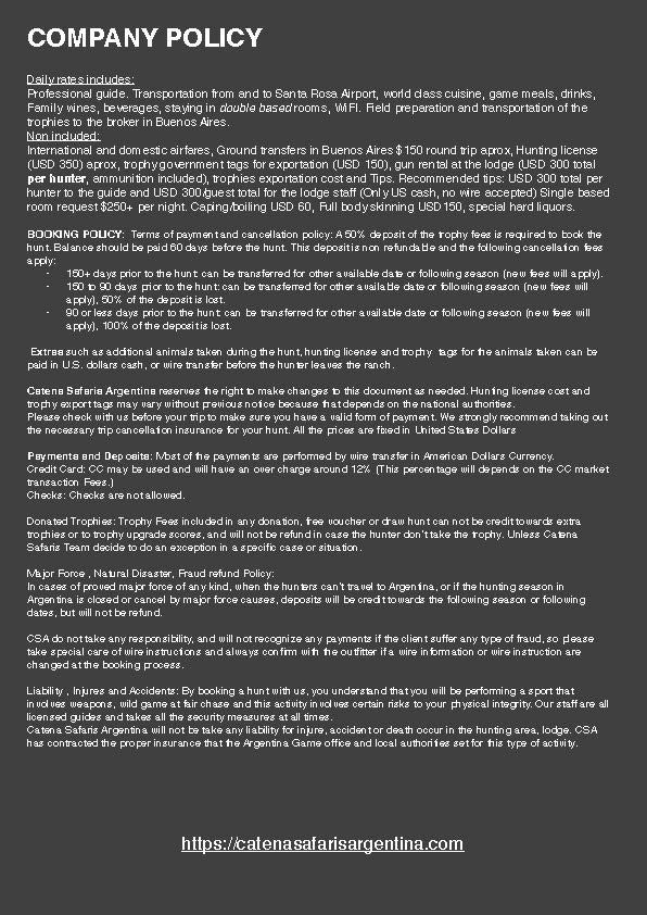 A deposit of $1,000 is required to book the hunt dates and will be applied to balances due. NOTE: Each hunter must take at least one additional trophy at full cost.
